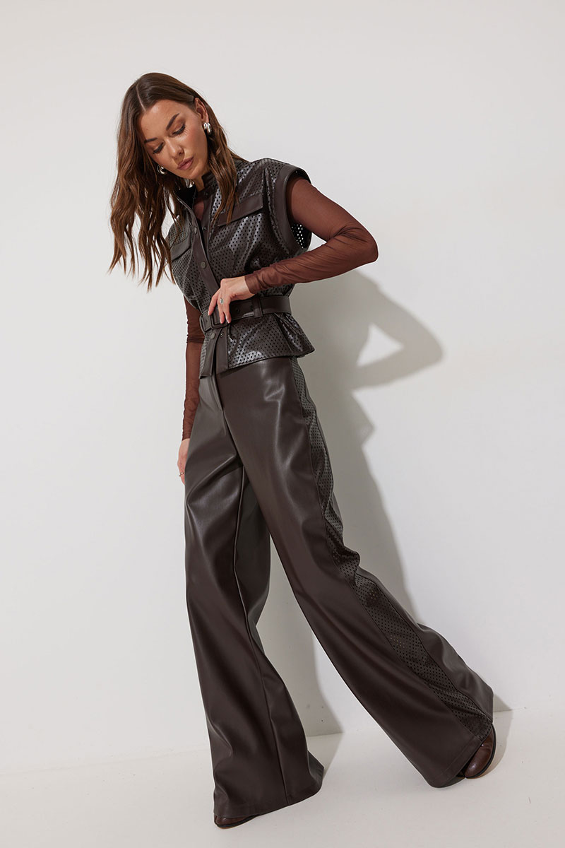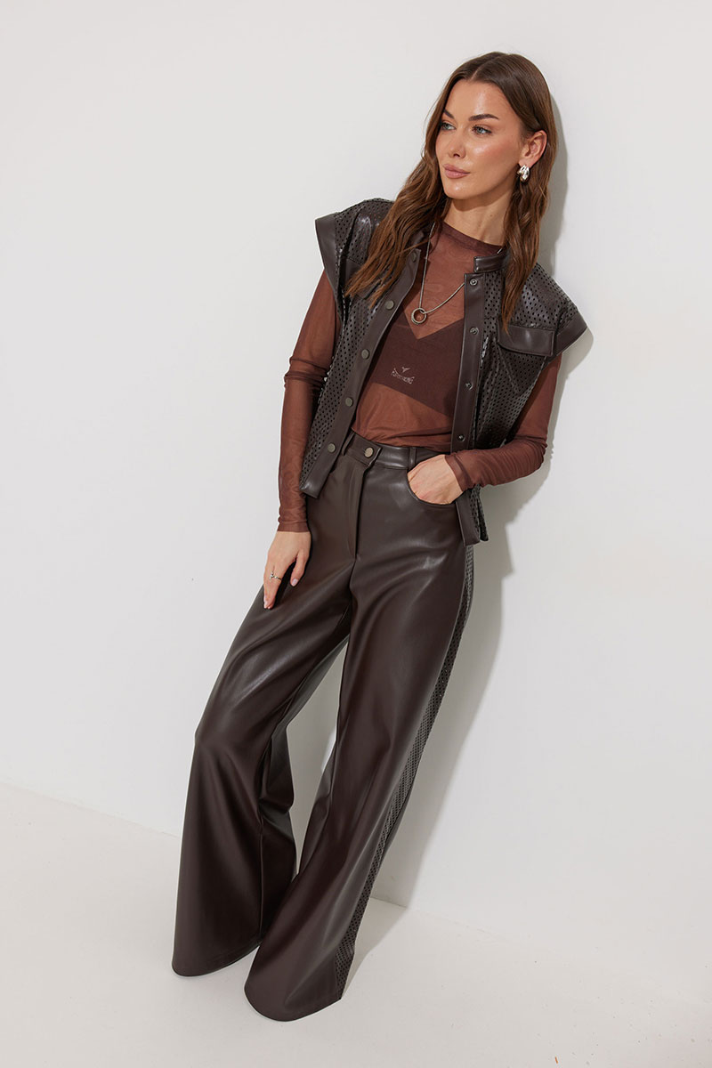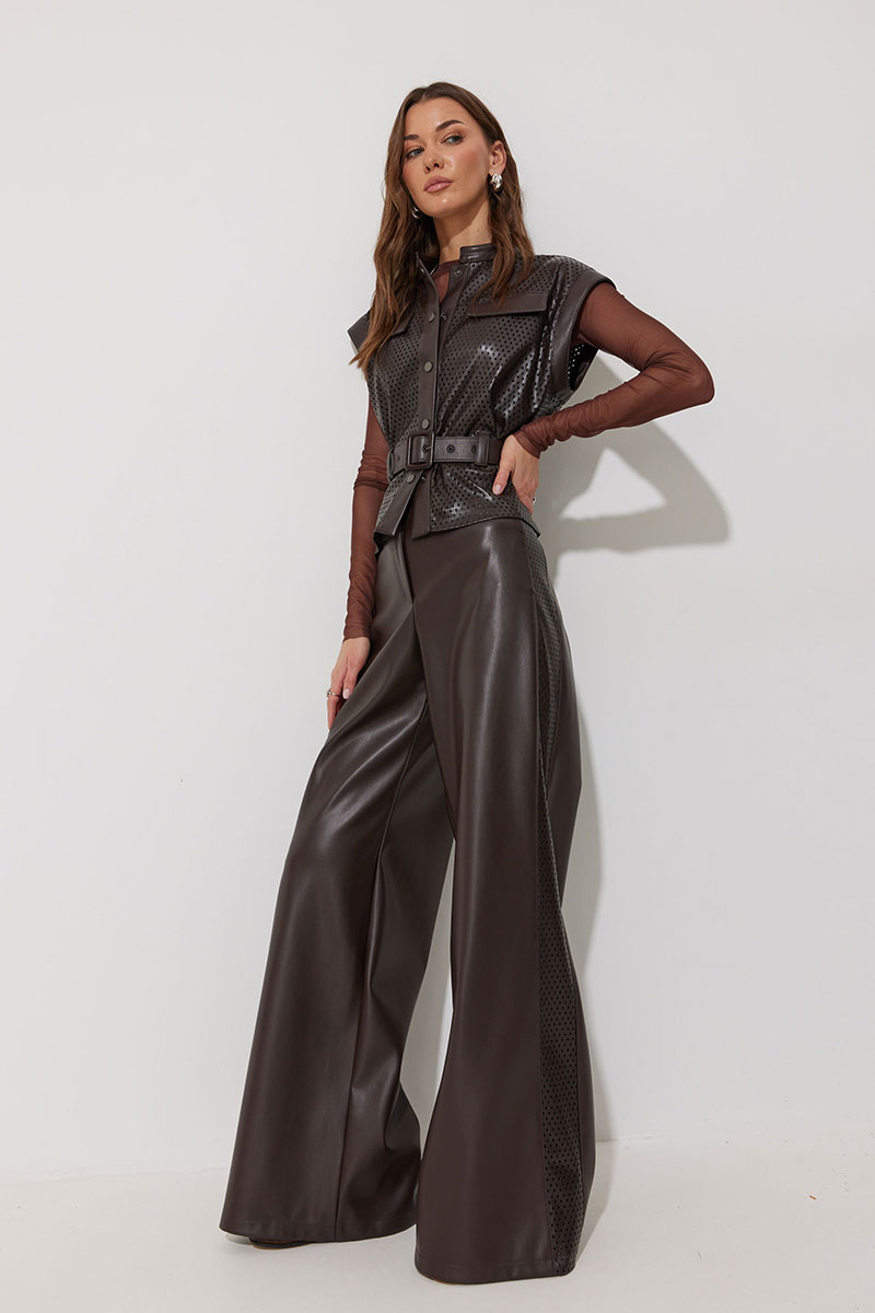 Брюки прямого силуэта расширенные книзу из экокожи. По верху притачной пояс с застежкой на петлю и пуговицу и шлевками для ремня. На передних половинках обработаны карманы и застежка молния в среднем шве. По поясу задних половинок брюк резинка. По бокам брюк вставка из отделочной ткани. Обращаем ваше внимание, что фурнитура может отличаться от фото.