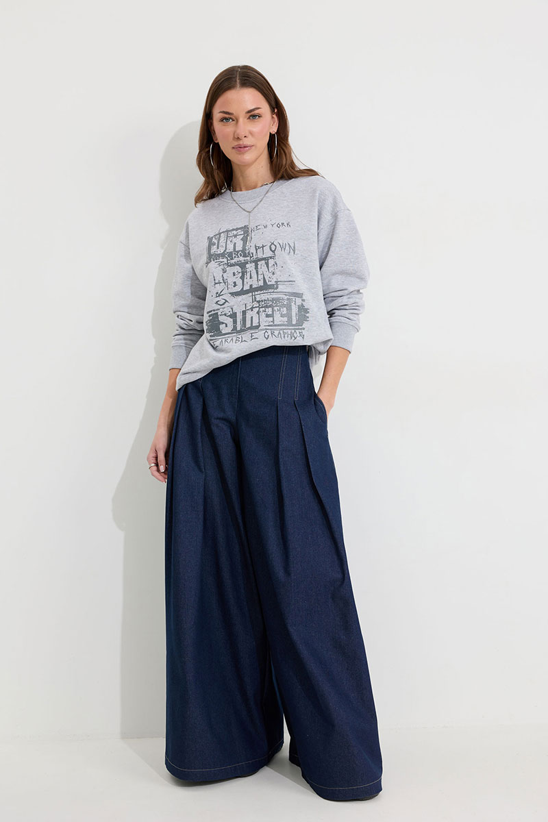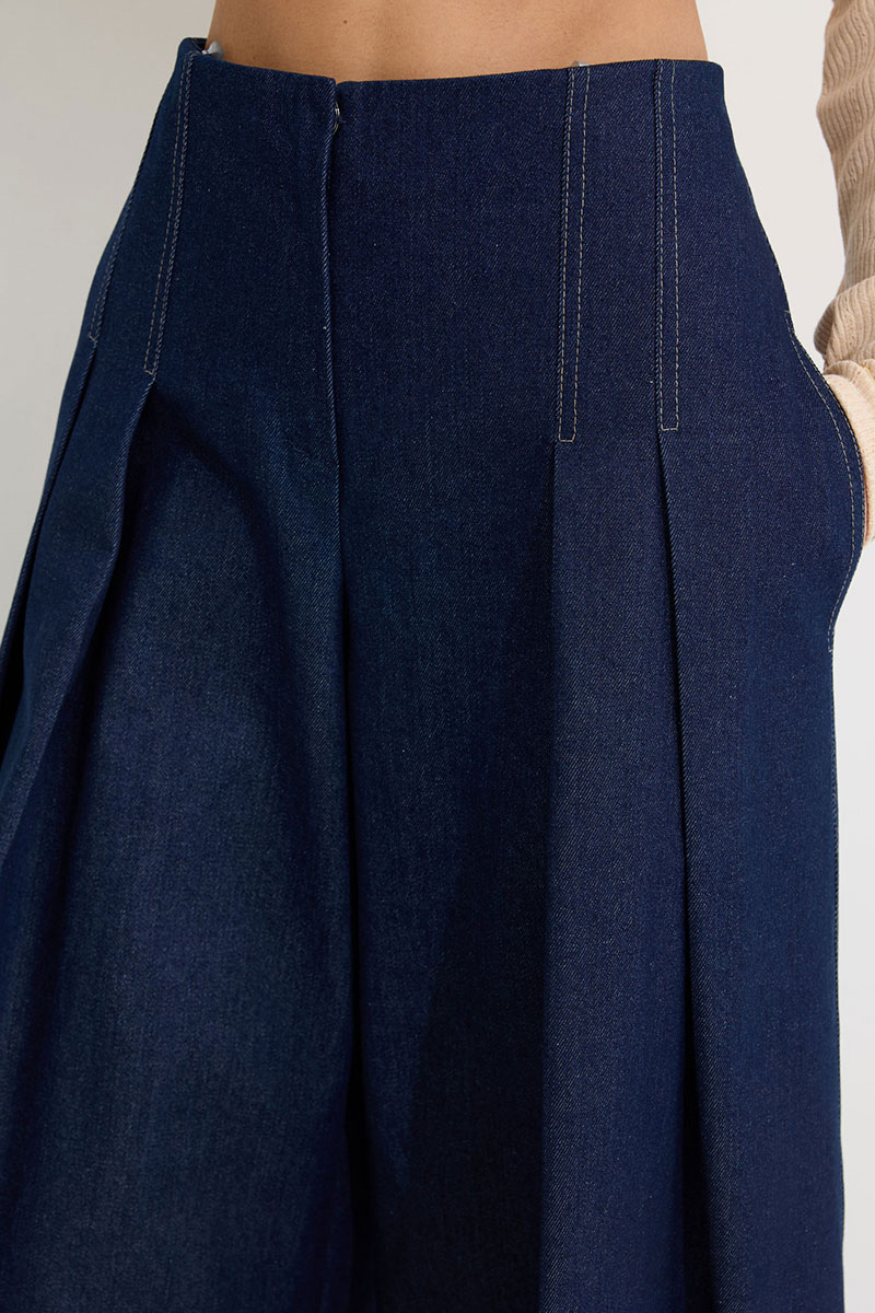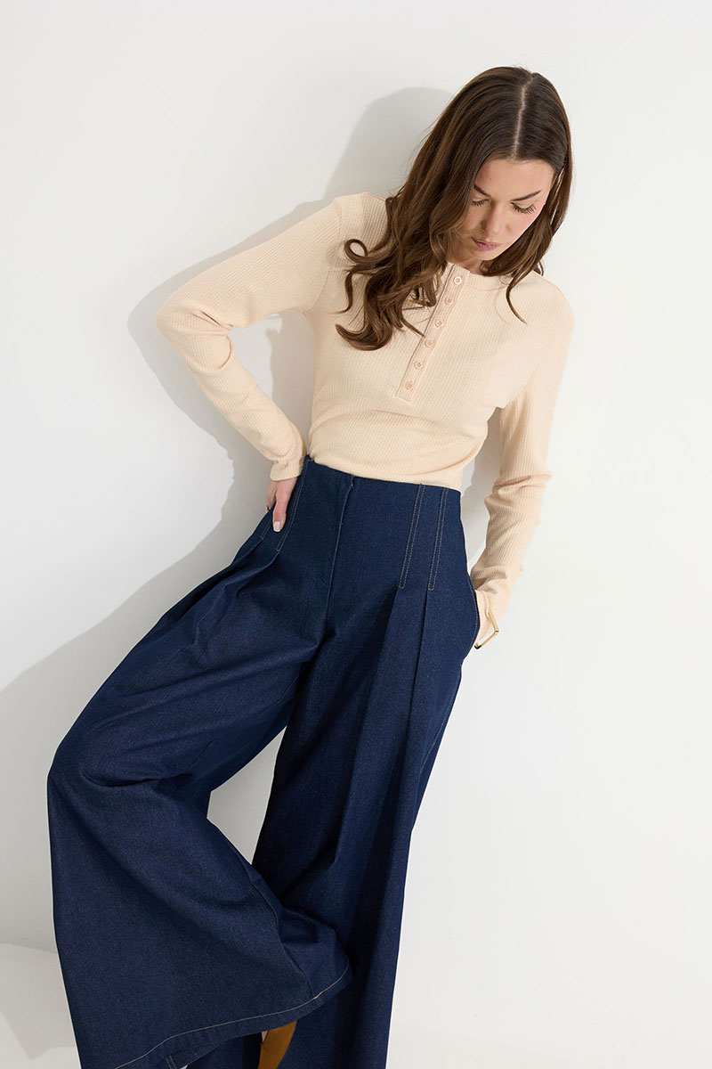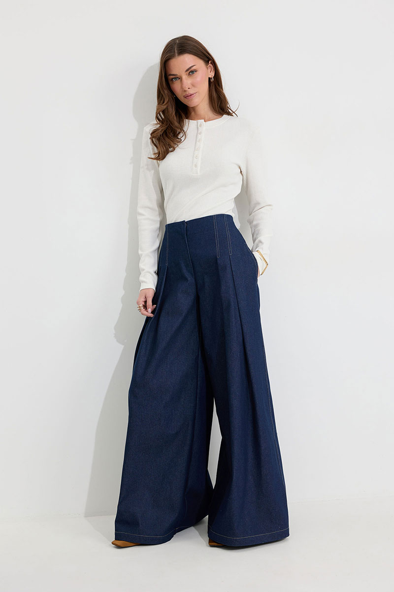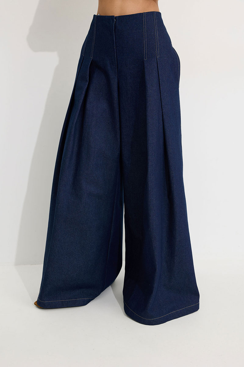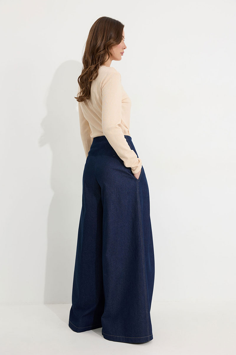Брюки-палаццо из хлопкового денима. Посадка до линии талии, с расширением от линии бедра. Без пояса, верхний срез обтачной. На передних половинах брюк по две складки, застрочены на 15 см от верха. По переду застежка на молнию по типу гульфик, а также на пришивную потайную кнопку и потайную пуговицу. На задних половинах брюк по две вытачки. Карманы в боковых швах. По боковым швам, входам карманов, складкам по переду, по подгибке низа проложены двойные отделочные строчки контрастного цвета.