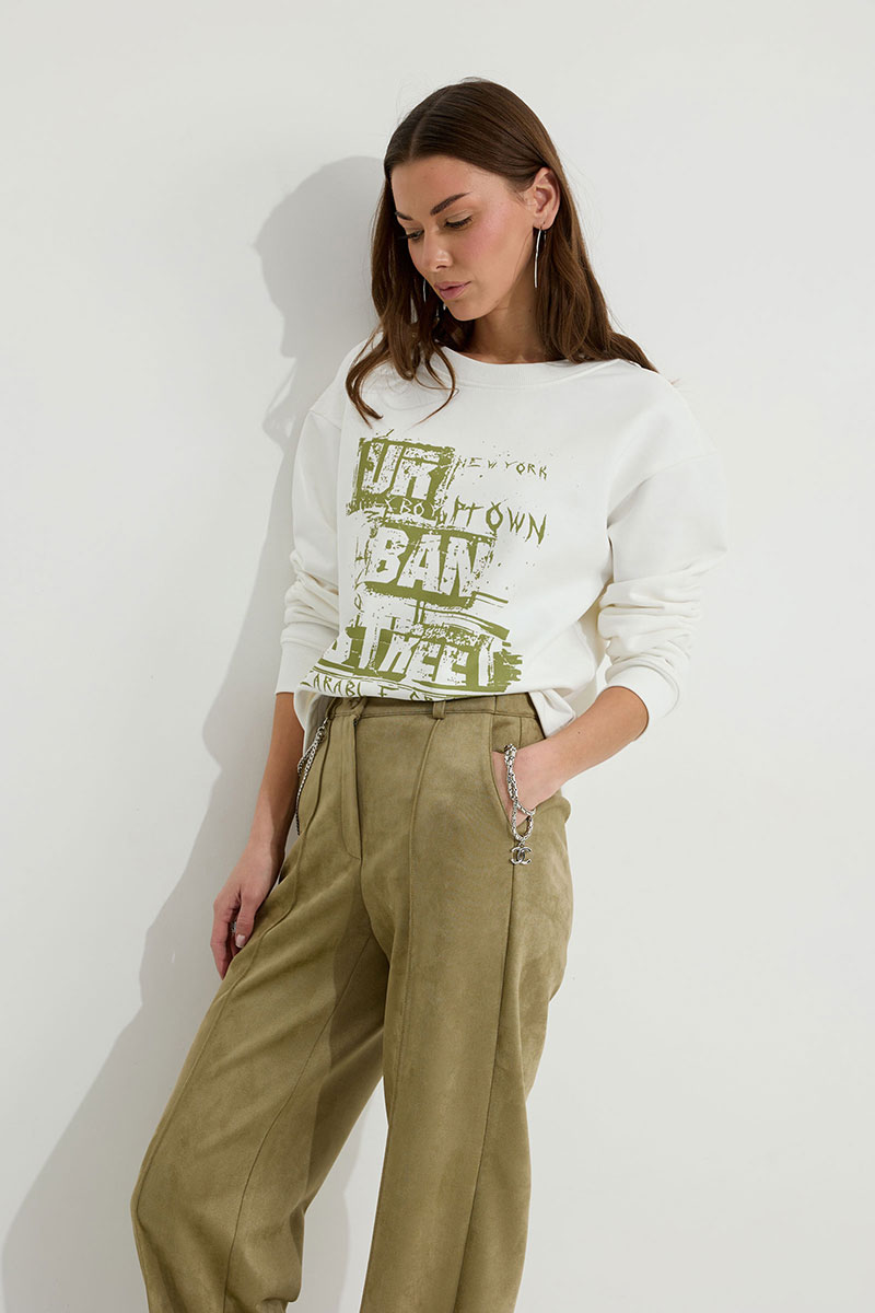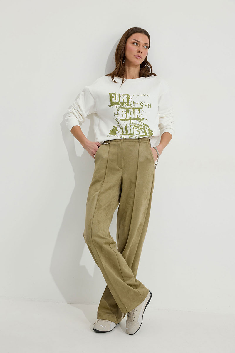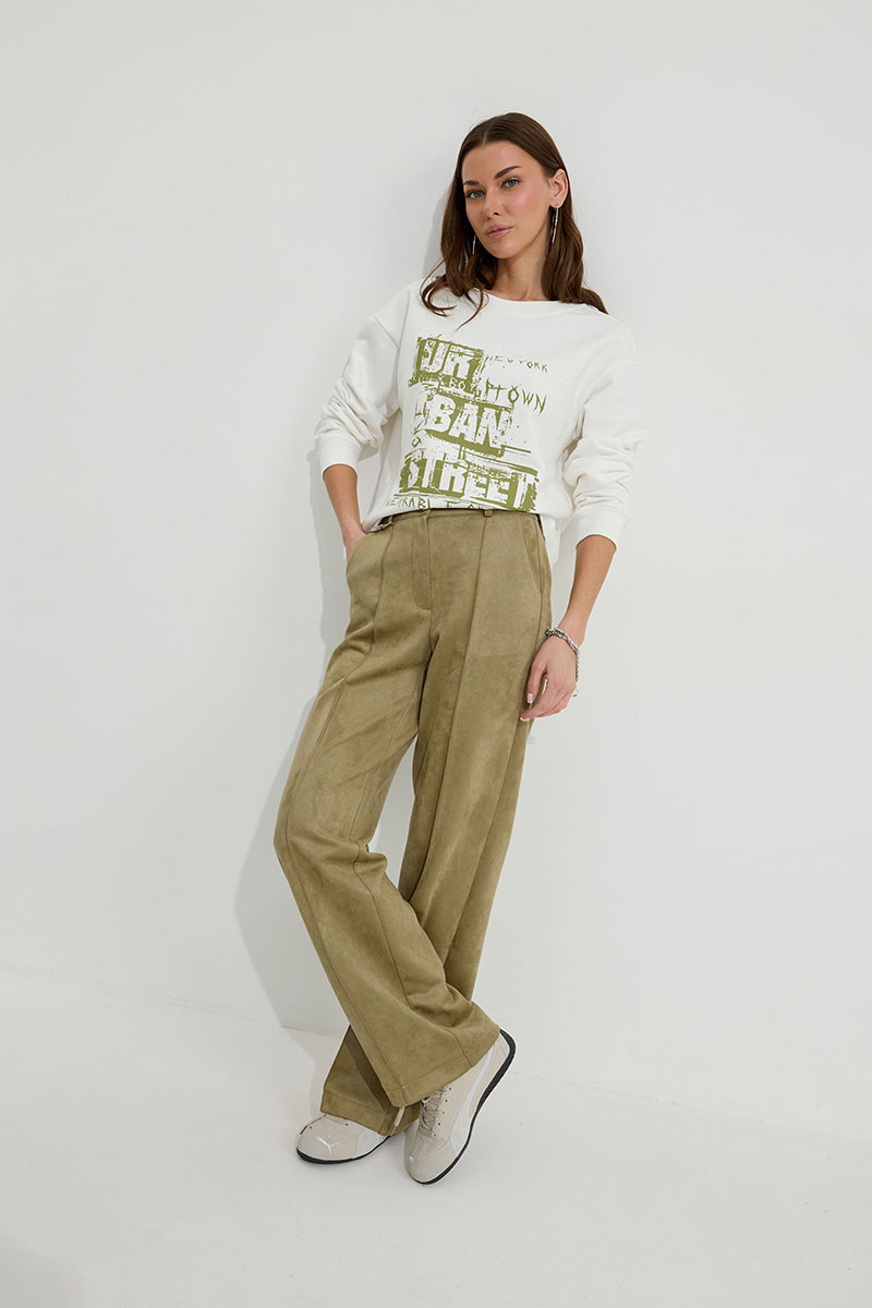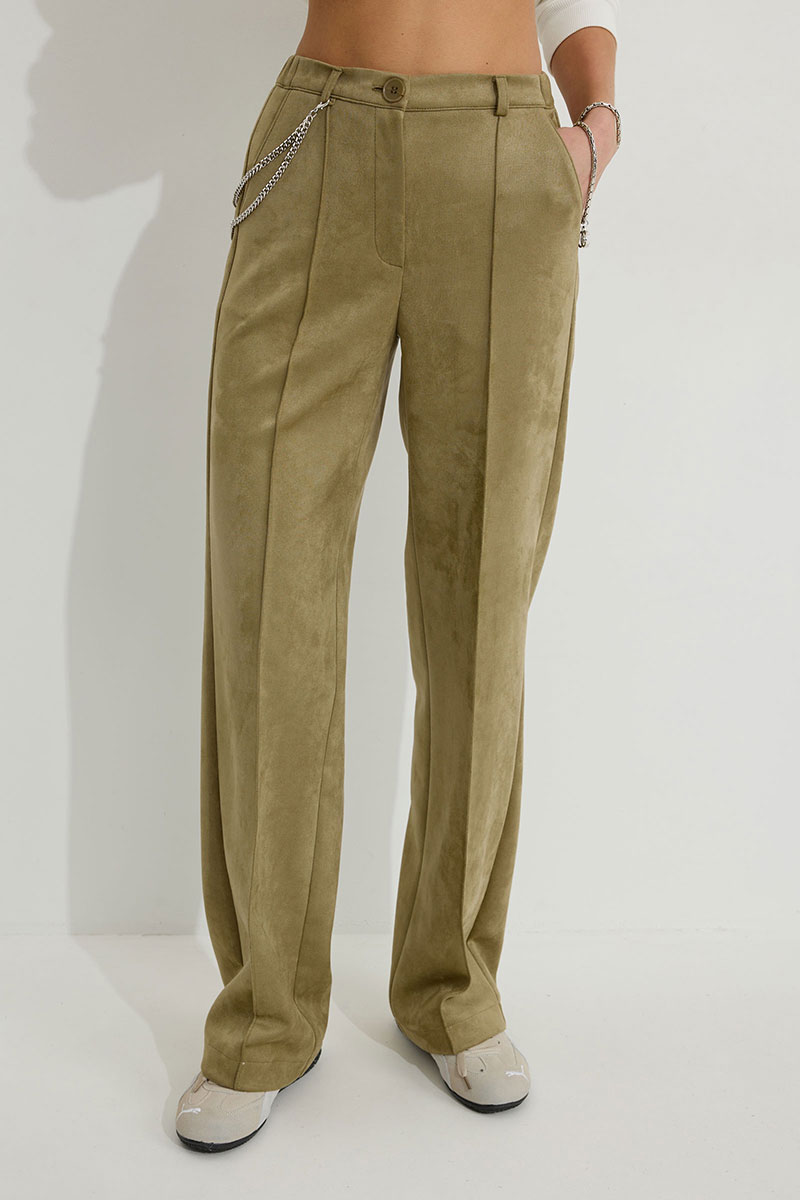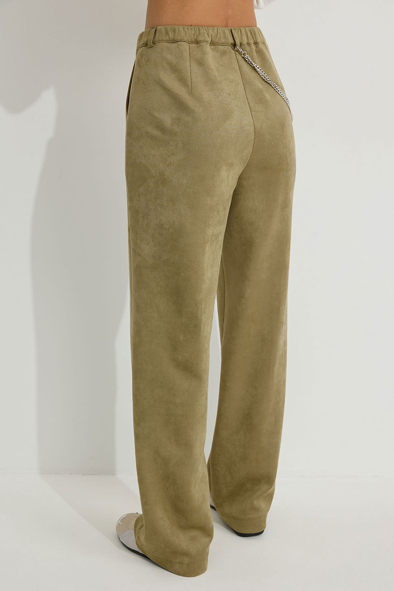 Брюки прямого силуэта из трикотажного полотна “замша”. По верху притачной пояс с застежкой на петлю и пуговицу и шлевками для ремня. На передних половинках обработаны карманы, канты и застежка молния в среднем шве, на задних – вытачки. По поясу задних половинок брюк эластичная тесьма (резинка). Обращаем ваше внимание, что фурнитура может отличаться от фото. Декоративный элемент - цепочка в комплектацию не входит.