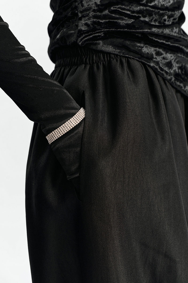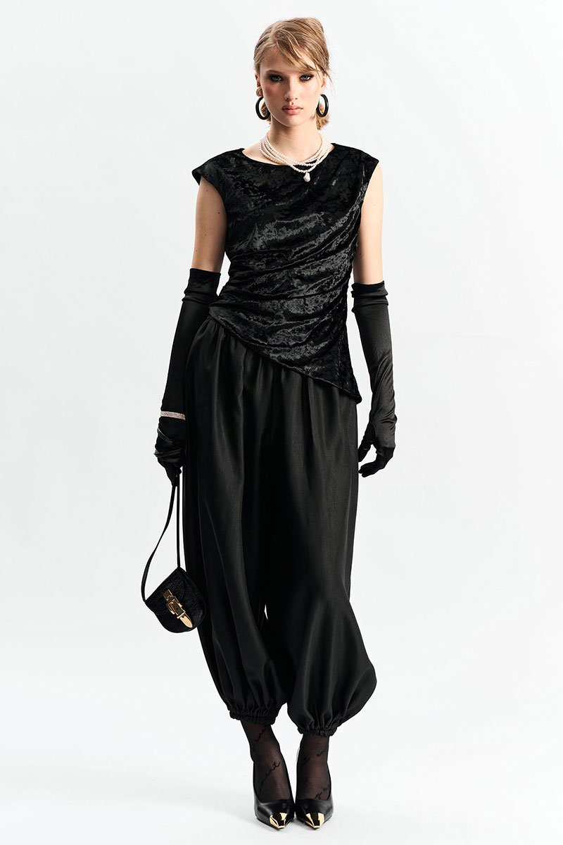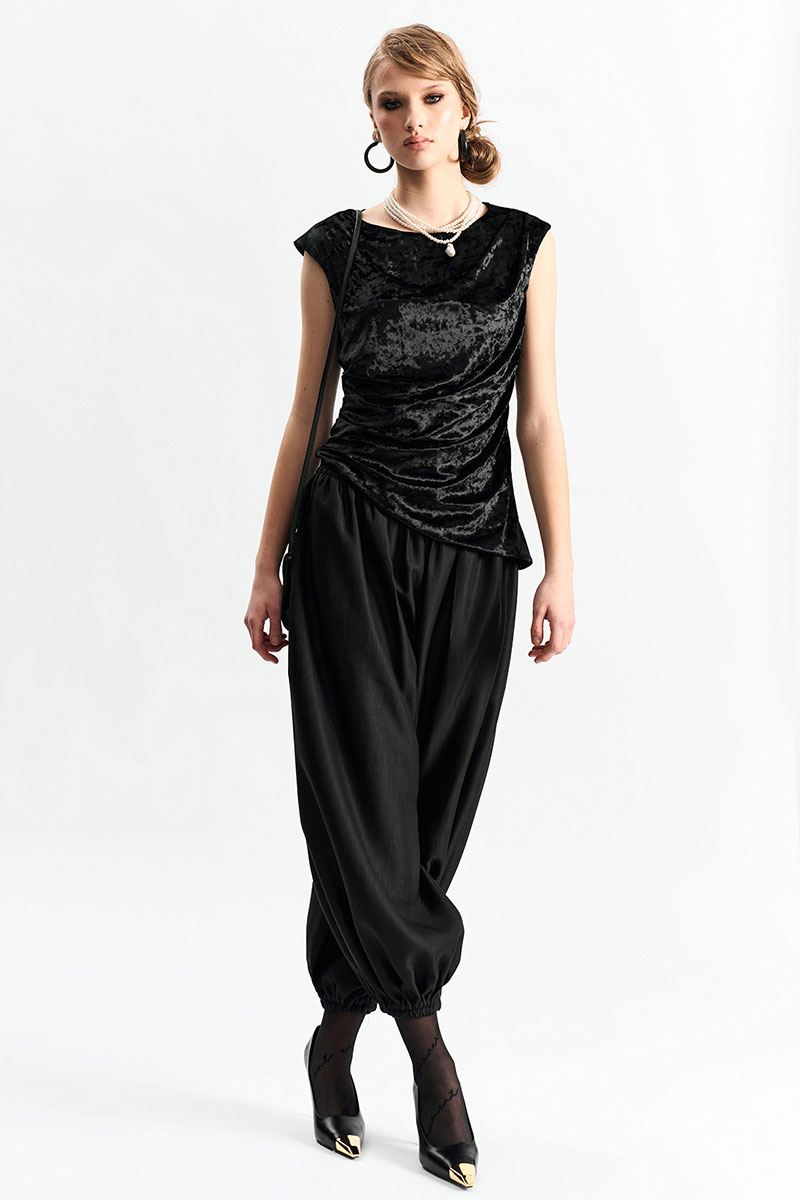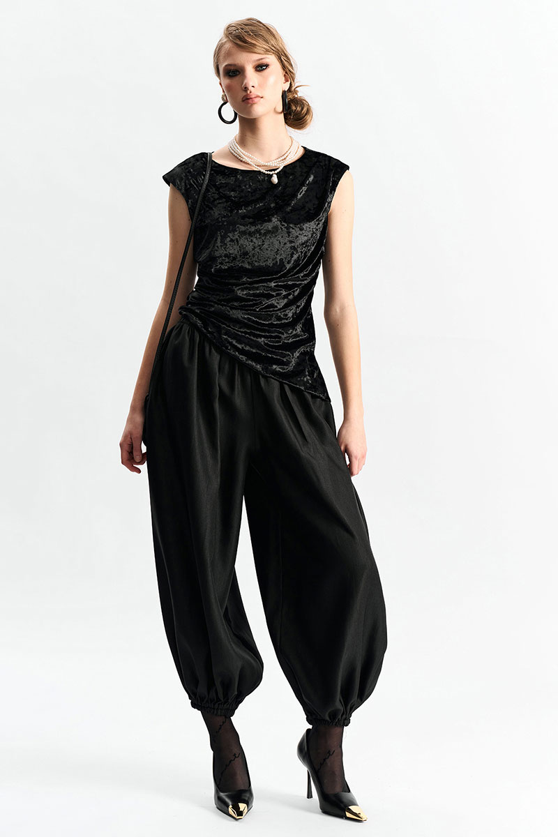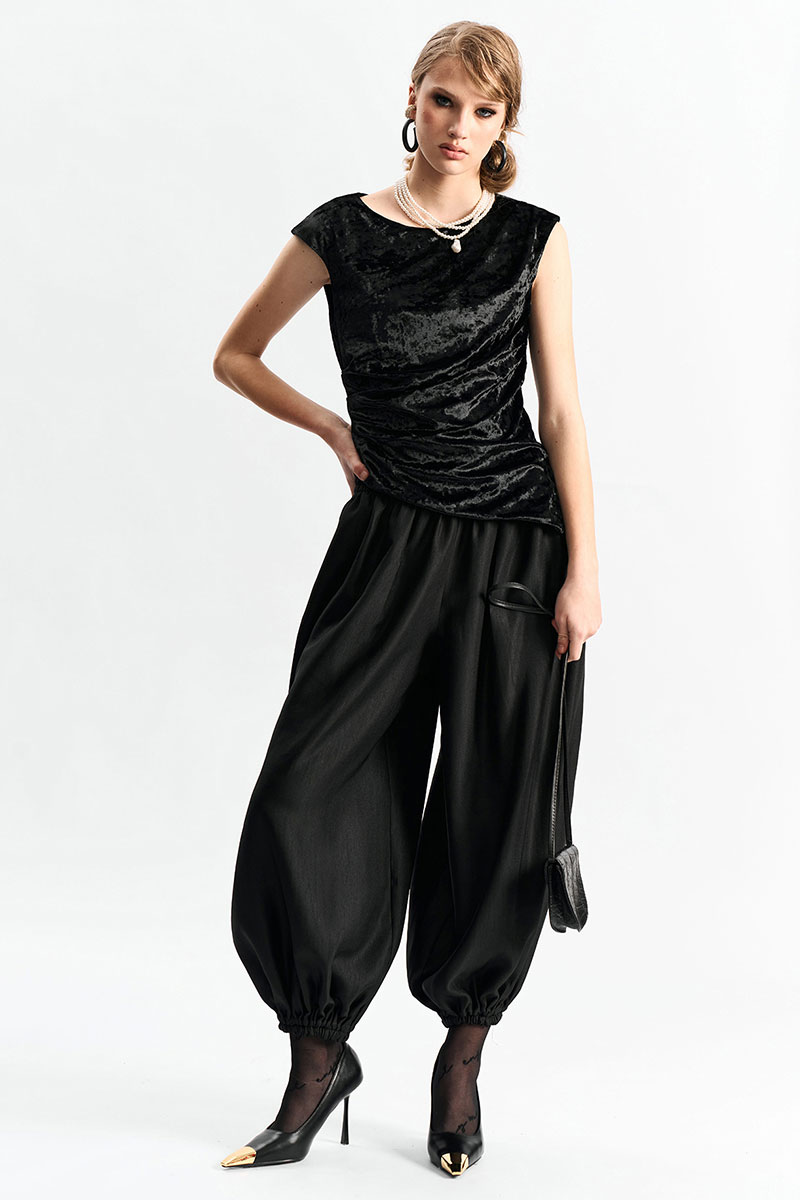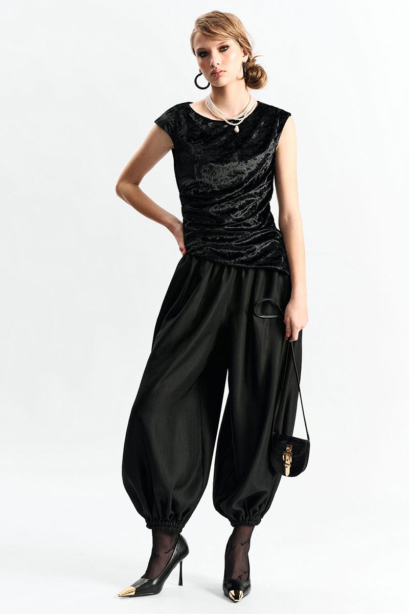 Брюки-"алладины", самый актуальный крой сезона. Пояс на резинке, низ брюк на резинке. Материал - смесовая вискоза с красивым изящным блеском. Два универсальных размера - S (соответствует 42-44-46) и L (48-50-52).