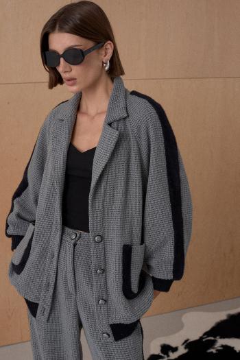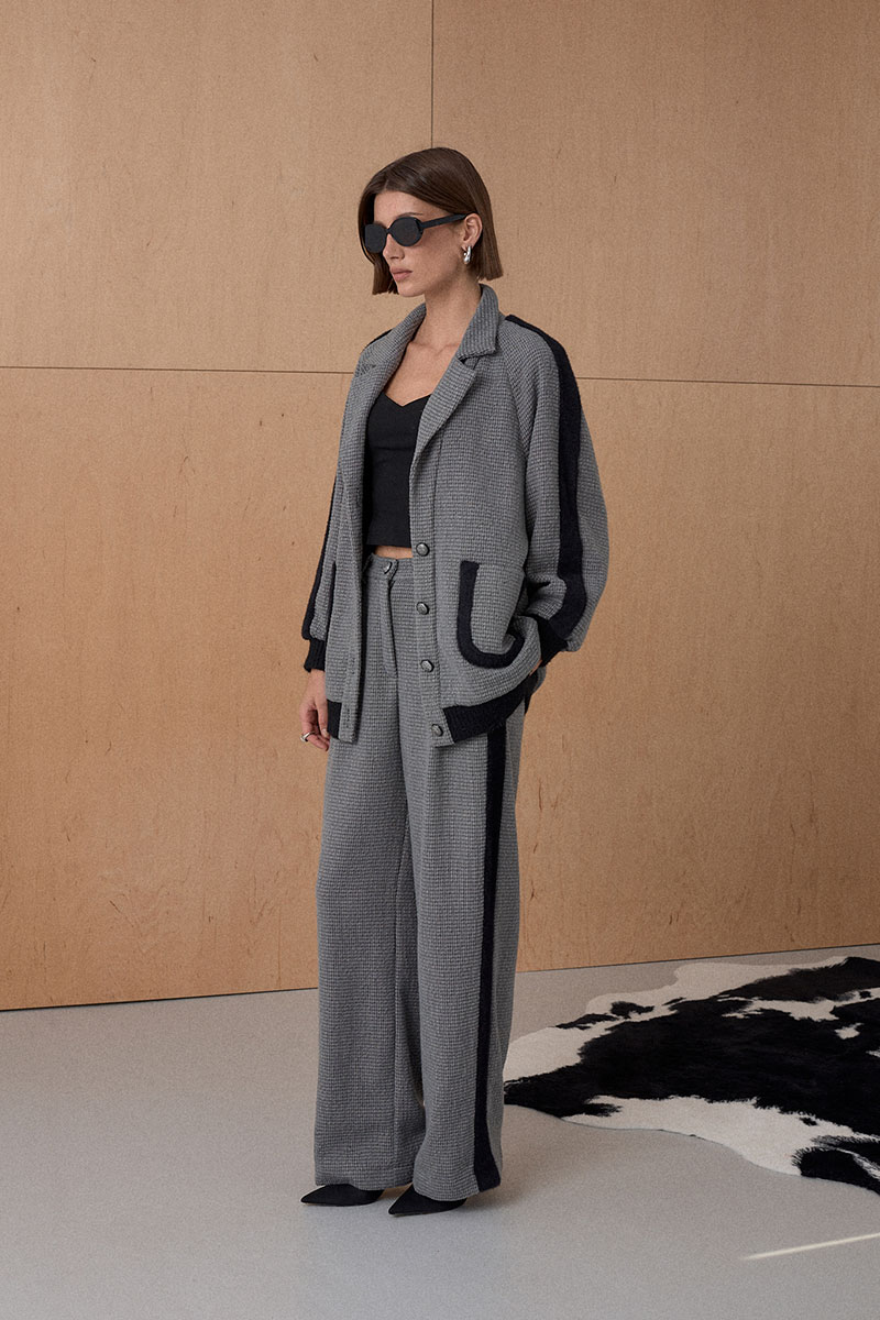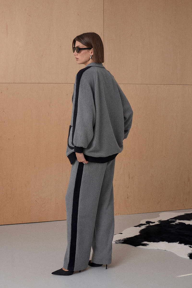 Брюки из твидовой ткани декорированы лентами в виде лампасов.