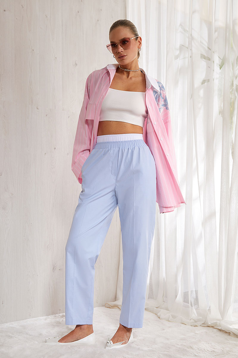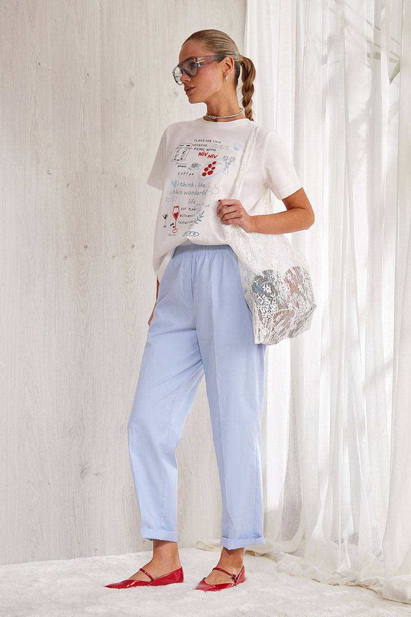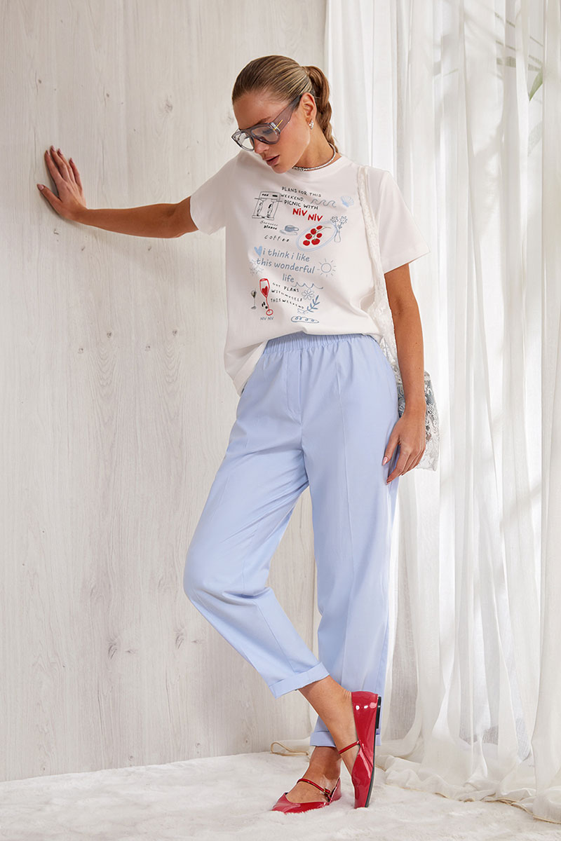 Летние укороченные брюки из фактурного хлопка , немного зауженные книзу. Брюки без застежки. Карманы в боковых швах. По талии декоративная резинка .