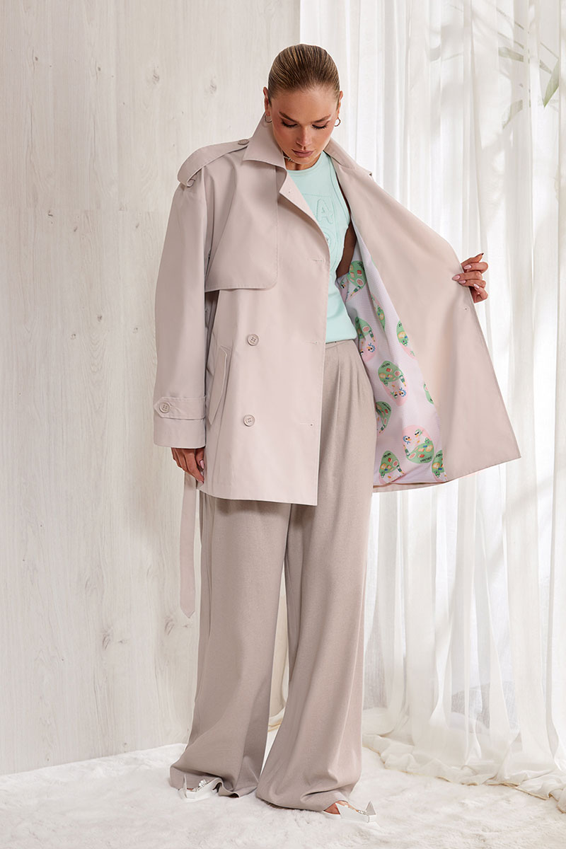 Прямые брюки-палаццо из струящейся вискозы. Брюки на широком поясе, в который вставлена декоративная тесьма. Функциональные карманы в боковых швах. Глубокие односторонние складки спереди и прорезные карманы – обманки сзади.