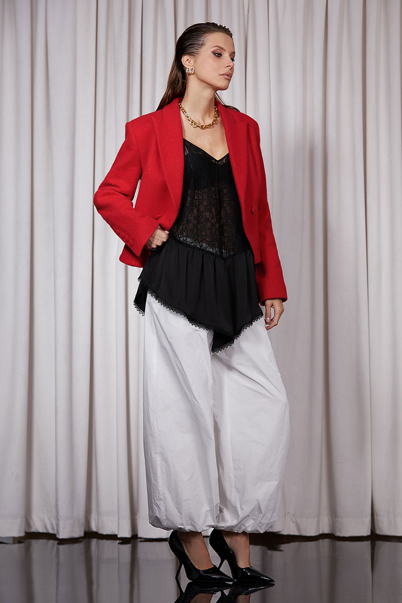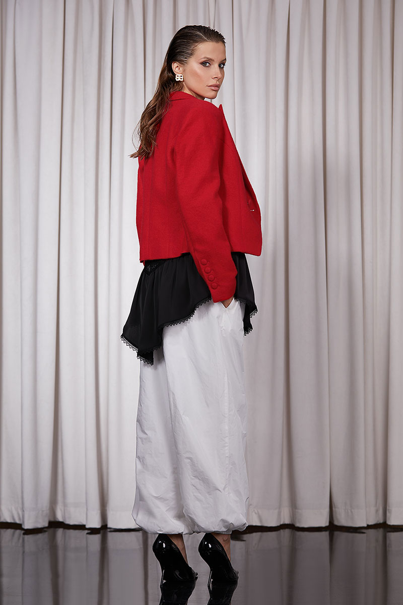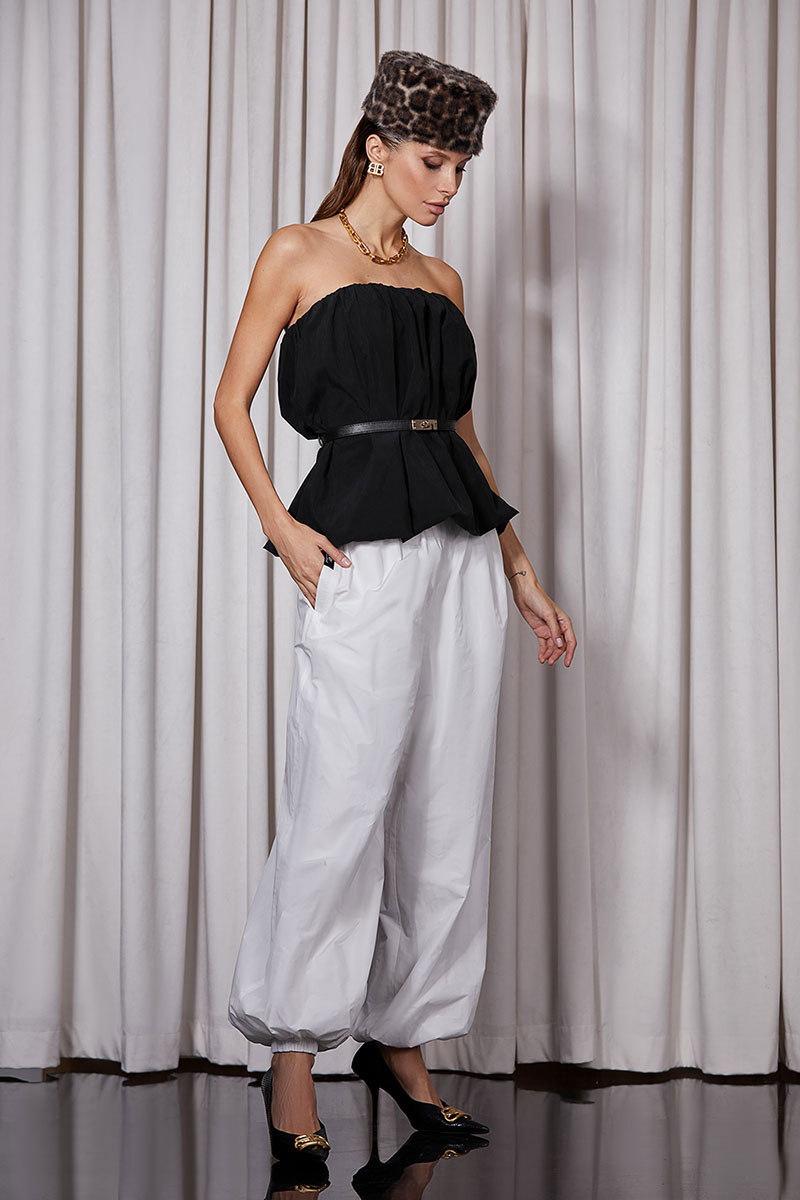 Брюки-“Алладины” выполнены из шуршащего хлопка.Брюки полностью на подкладке. Изделие на поясе, в который вставлена резинка. Низ брюк так же на резинке. Карманы в боковых швах. По боковому шву декоративный флажок.
