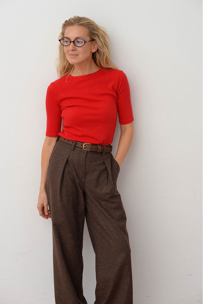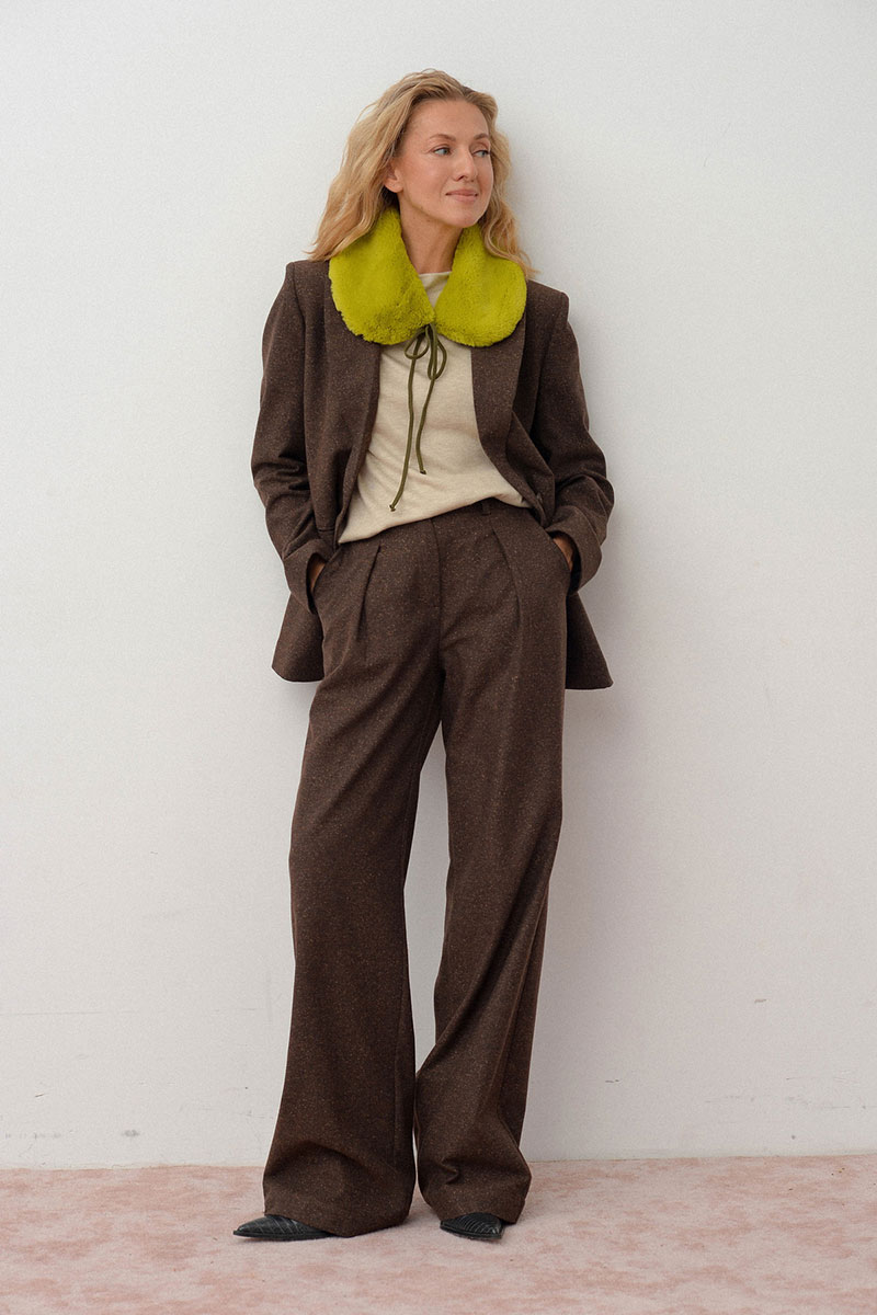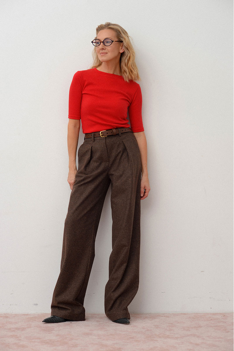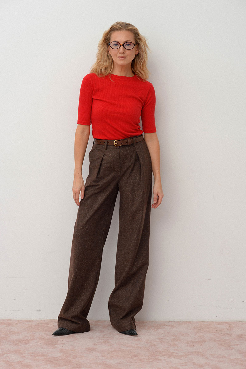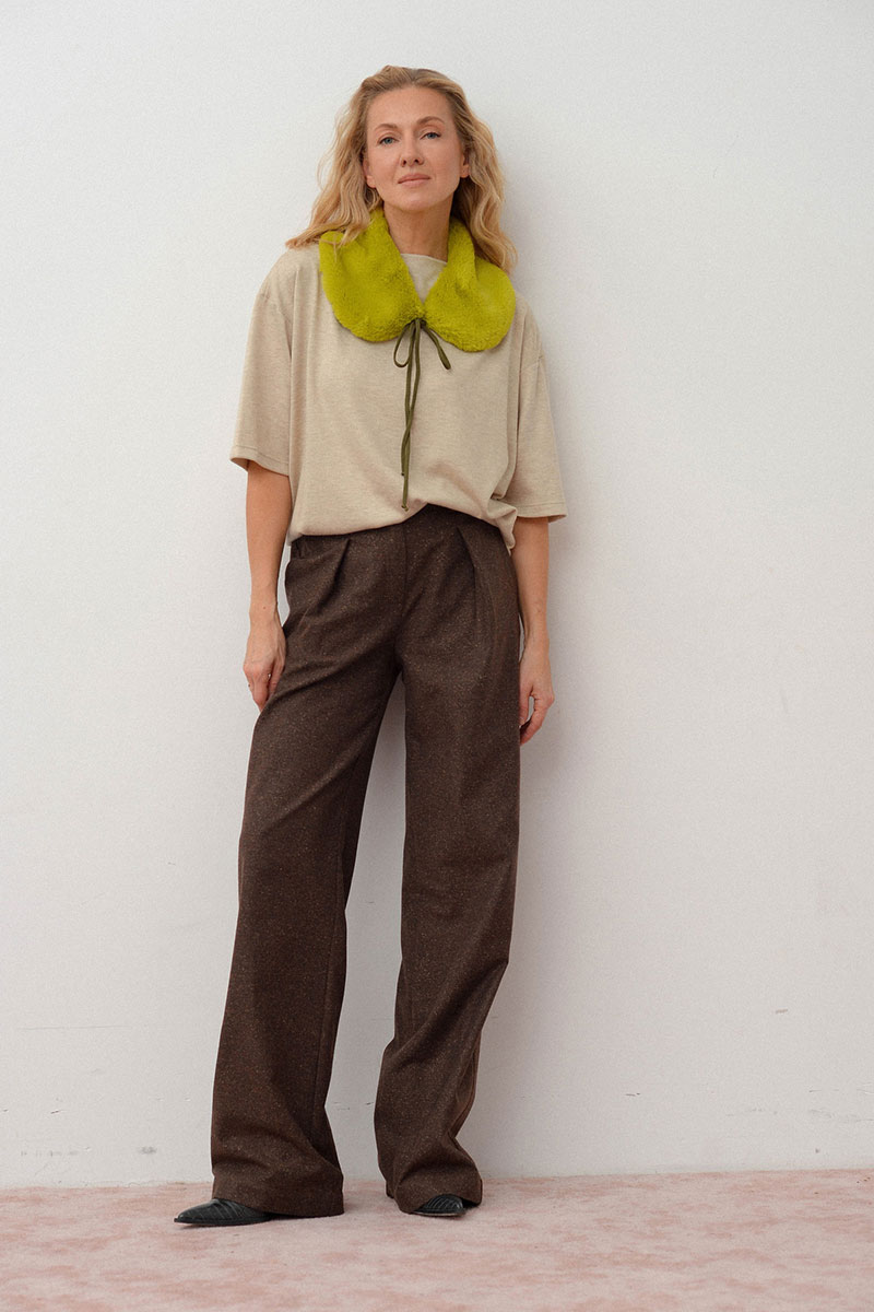 Брюки из премиальной итальянской шерсти с шелком в меланжевом оттенке шоколада. Ткань отличается своей мягкой ворсистой текстурой, отлично сохраняет тепло. Брюки дополнены подкладочной тканью из комфортного к коже твила. Изящность изделия подчеркивается защипами, плавно переходящими в аккуратные складки вдоль брючин. Средняя посадка, эластичный пояс. Идеально сочетаются с жакетом из нашей коллекции.