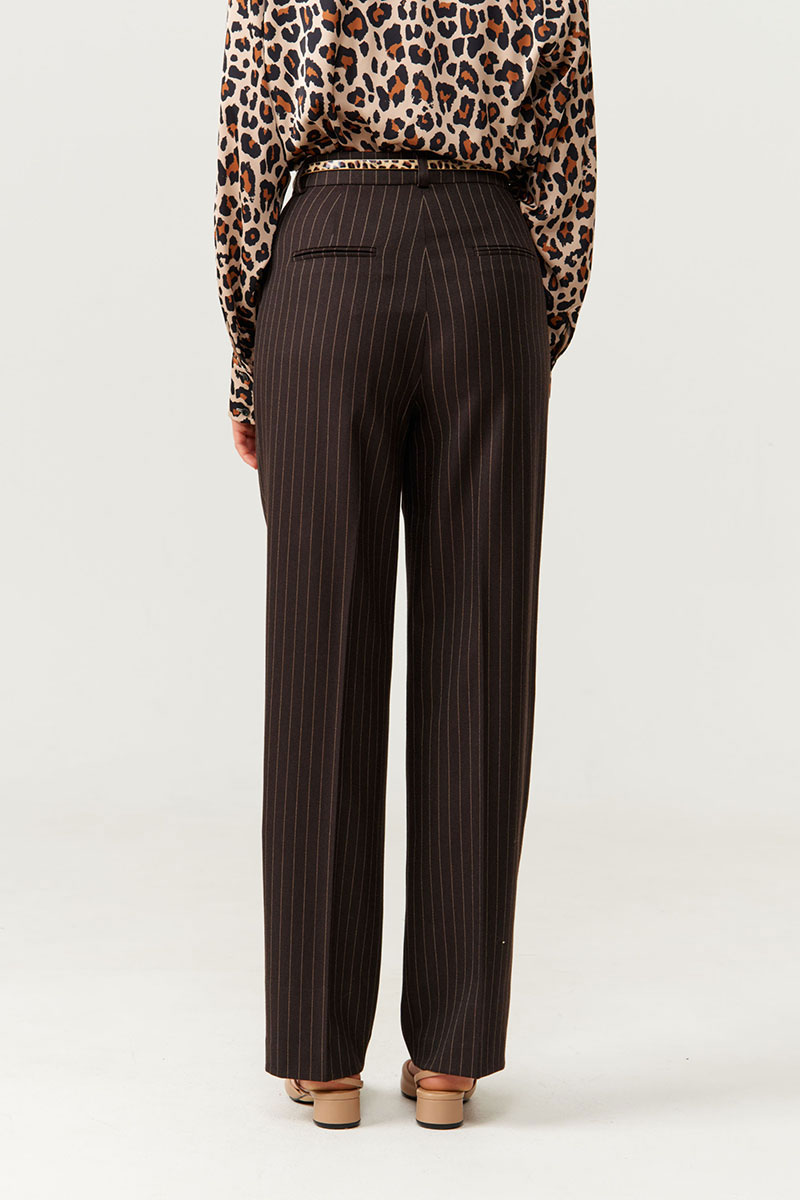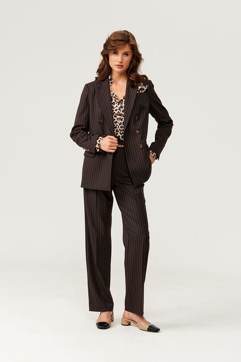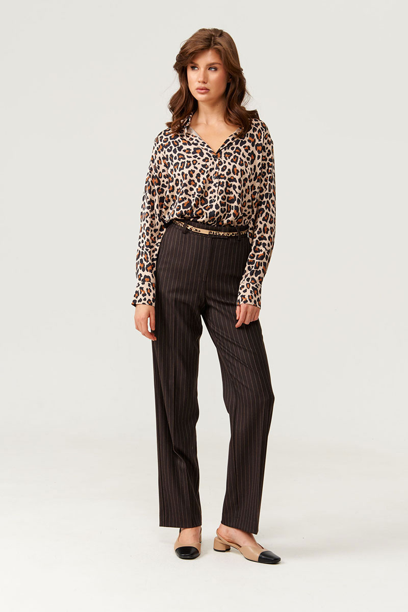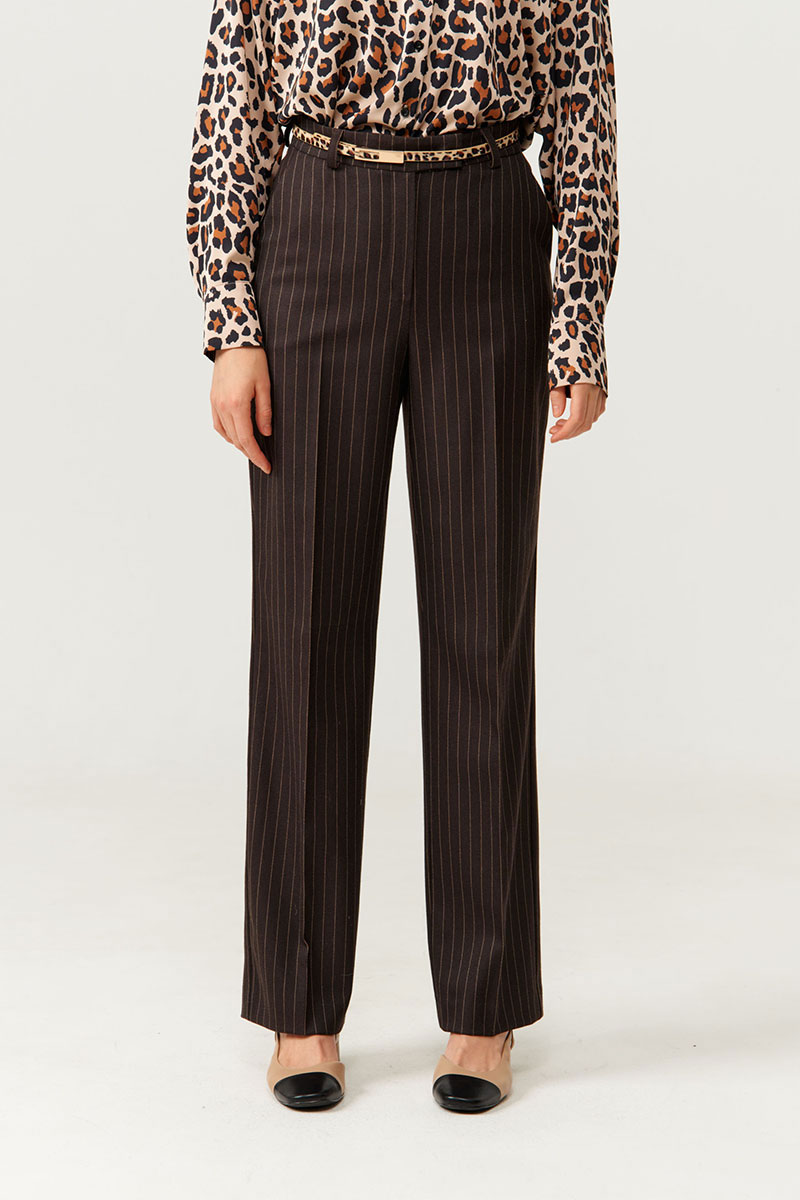 Брюки женские из поливискозной ткани прямого силуэта. Верхний срез брюк обработан поясом-обтачкой, срез пояса изнутри обработан окантовкой с дизайнерским принтом. Задняя часть брюк имеет два прорезных кармана-обманки в рамку с двумя обтачками. Застежка в брюках на крючок, а также на тесьму-молнию в среднем шве брюк. В боковых швах располагаются боковые прорезные карманы с подкройным бочком. Передняя и задняя часть брюк заутюжены на кант. Приталенный пояс подчеркивает фигуру, а полоска визуально удлиняют силуэт. Брюки можно носить для разного рода мероприятий. Красивые и стильные брюки коричневого оттенка, в которых вы будете чувствовать себя уверенной.