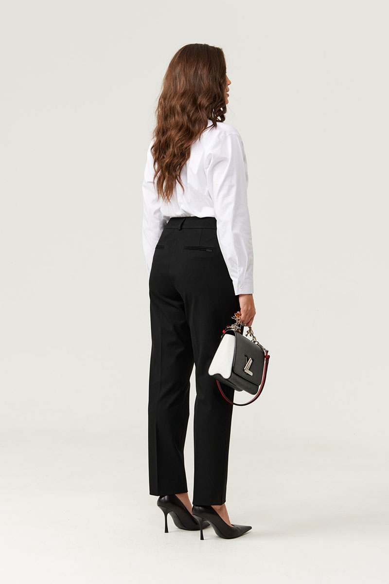 Эти женские брюки из поливискозной ткани идеально подходят для повседневной носки. Верхний срез брюк обработан притачным поясом, внутренний срез пояса украшен декоративной тесьмой, что придает изделию аккуратный и стильный вид. Застежка на одну обметанную петлю и одну пуговицу, а также имеется застёжка на тесьму-молнию в среднем шве брюк. Пояс дополнен шлёвками, позволяющими носить их с ремнём для дополнительной регулировки посадки и комфорта. Задняя часть брюк оснащена двумя талиевыми вытачками, обеспечивающими хорошую посадку по фигуре. Также имеется прорезной карман с двумя обтачками, добавляющий функциональности и эстетики. В боковых швах расположены боковые прорезные карманы с подкройным бочком, что делает эти брюки практичными для ежедневных нужд. В боковом шве имеются небольшие разрезы. Чёрный оттенок делает их универсальным элементом гардероба, сочетающим стиль и практичность.