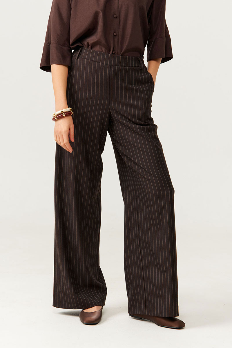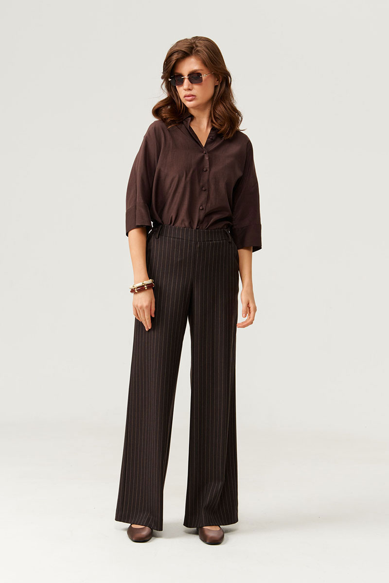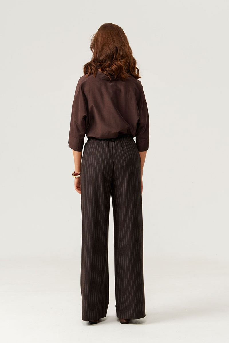 Женские брюки коричневого оттенка из поливискозной ткани, идеально подходящие для повседневной носки. Верхний срез брюк выполнен с притачным поясом, дополненным вставкой на резинке в боковой и задней части для комфортной посадки. Внутренний край пояса украшен декоративной леопардовой тесьмой, придающей образу стильный акцент. В боковых швах расположены карманы с подкройным бочком, обеспечивающие практичность и удобство.