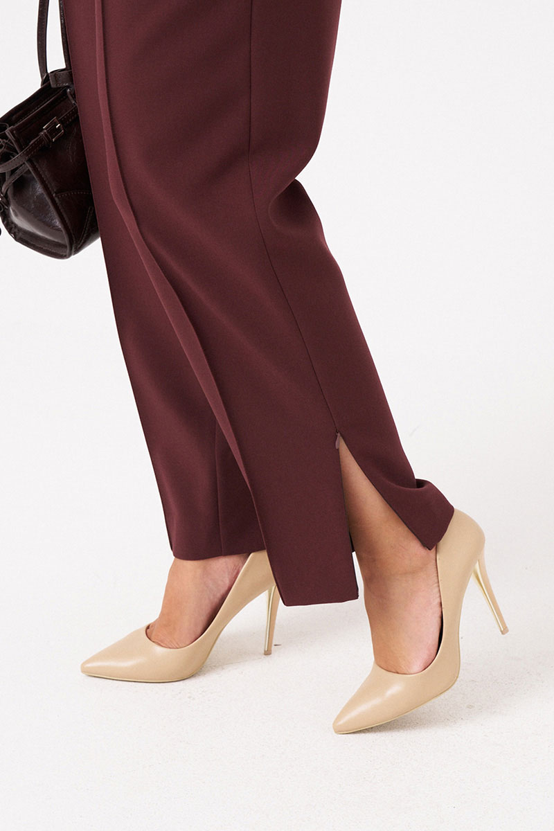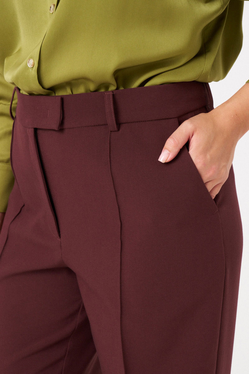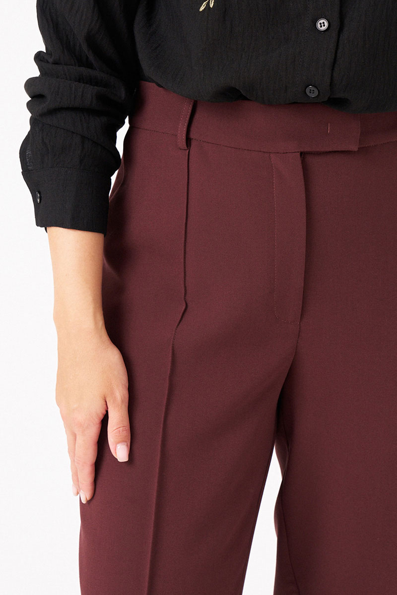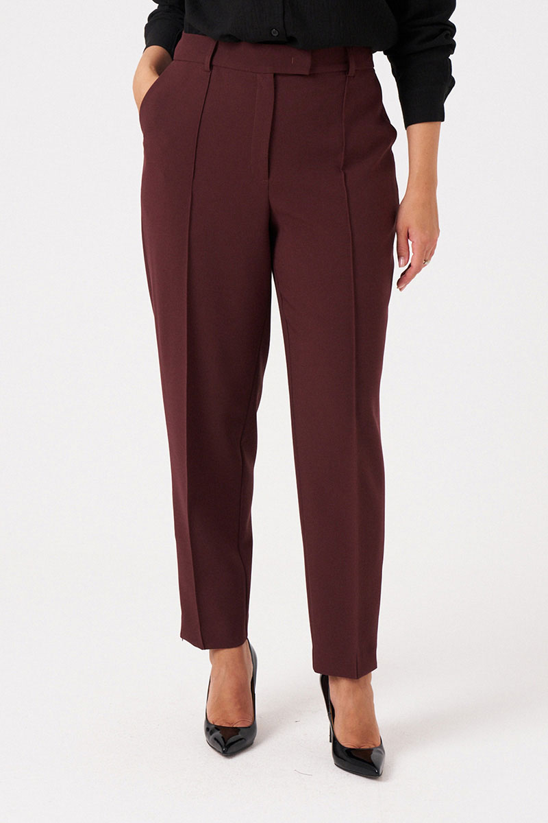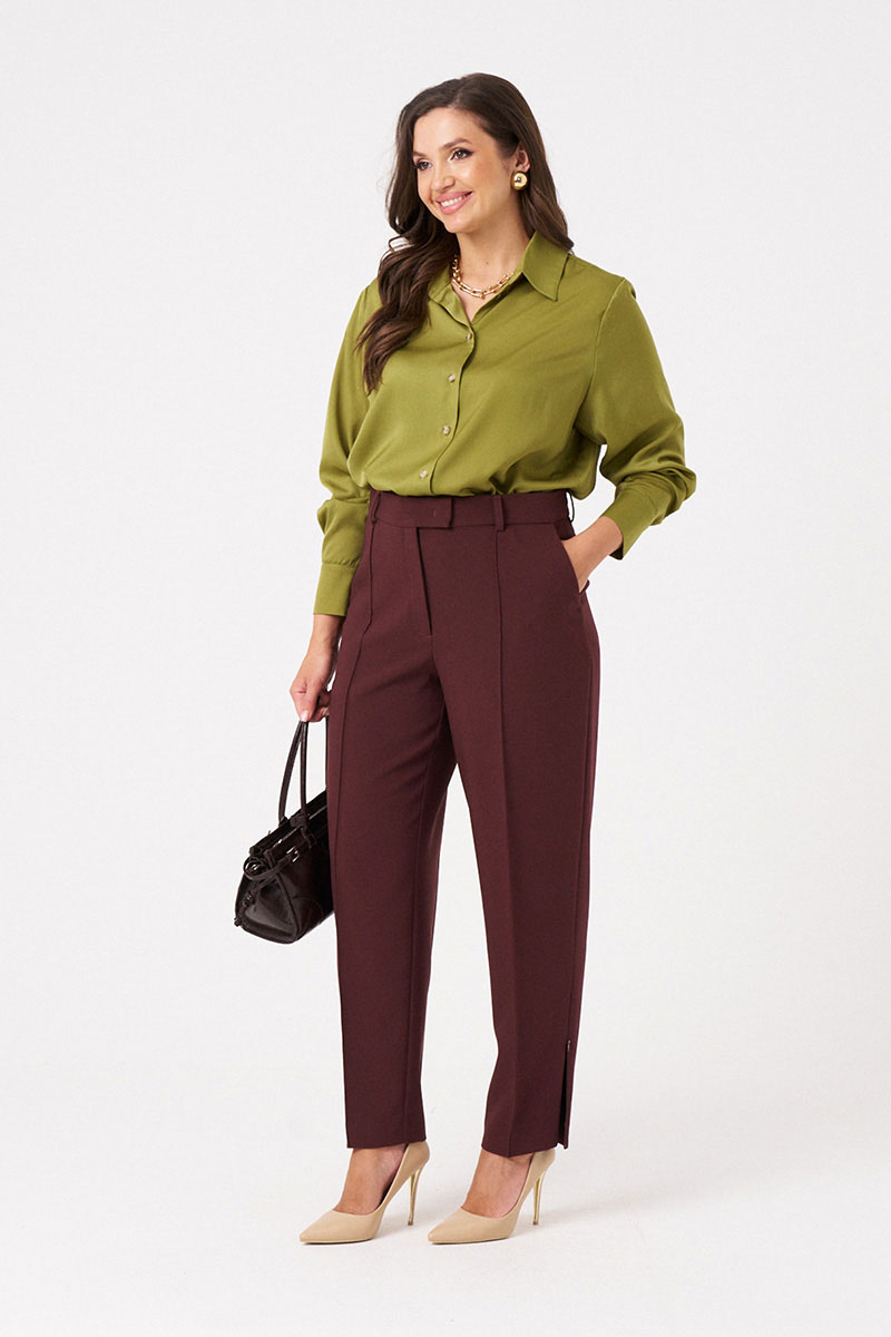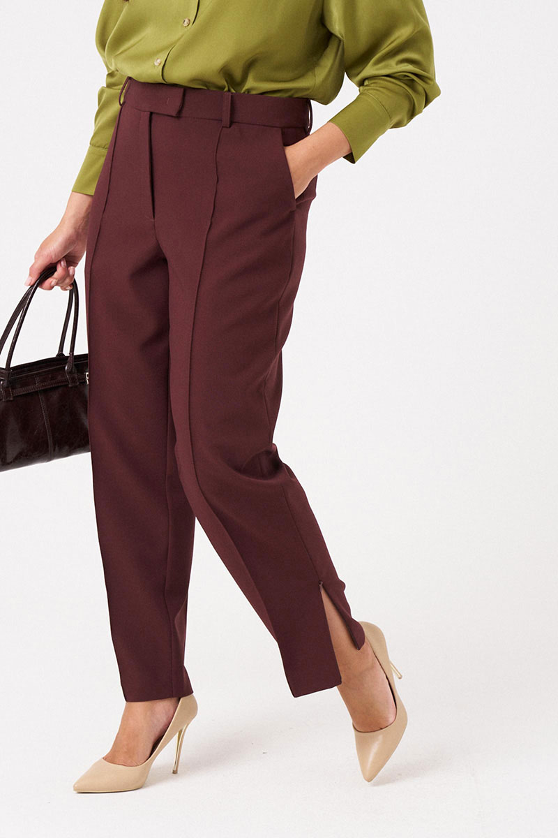 Женские брюки из поливискозной ткани классического коричневого цвета. Модель выполнена с притачным поясом, украшенным шлевками, что позволяет носить их как с ремнем, так и без него. Застежка расположена на крючок и молнию в среднем шве для удобства. Передняя часть украшена застроченной стрелкой, а сзади — двумя талиевыми вытачками и карманом с листочкой. В боковых швах расположены карманы с подкройным бочком, а в нижней части — вставленна молния для дополнительного комфорта при надевании. Эти брюки универсальны и подходят для различных случаев, сочетаясь как с деловой, так и повседневной одеждой.