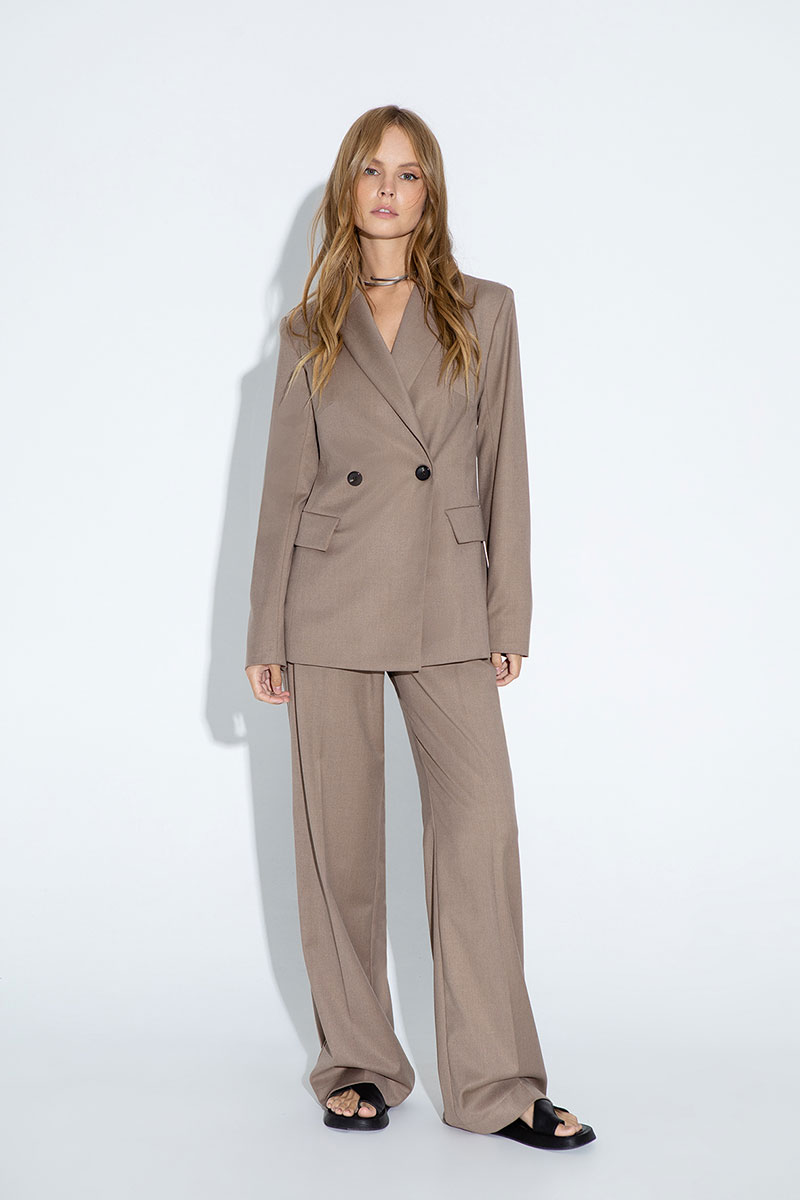 Детали: высокая посадка, широкие и длинные брюки, притачной пояс со шлевками, передние половины с небольшими застроченными мягкими складками и заутюженными стрелками, застежка на молнию и пуговицу, боковые карманы.