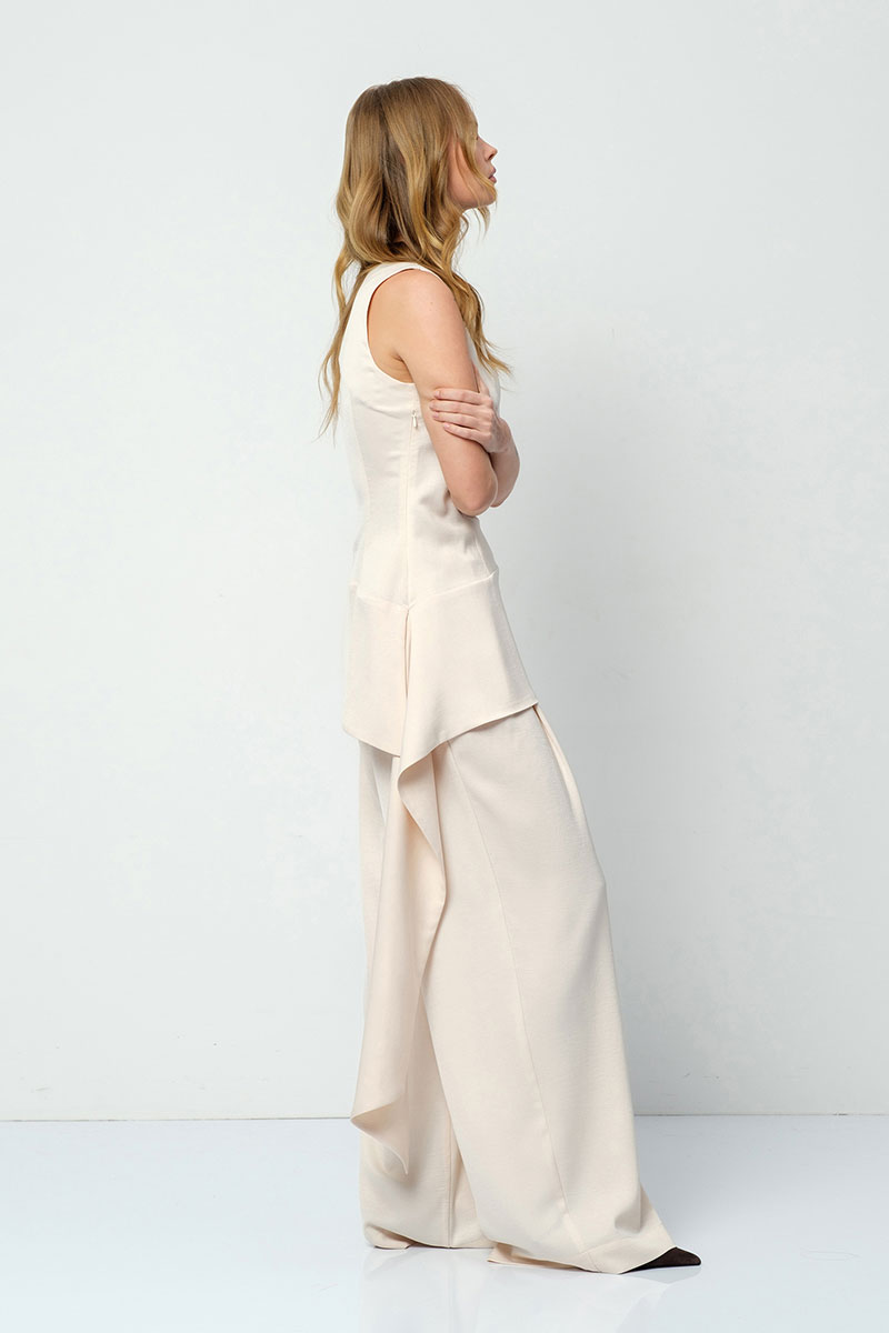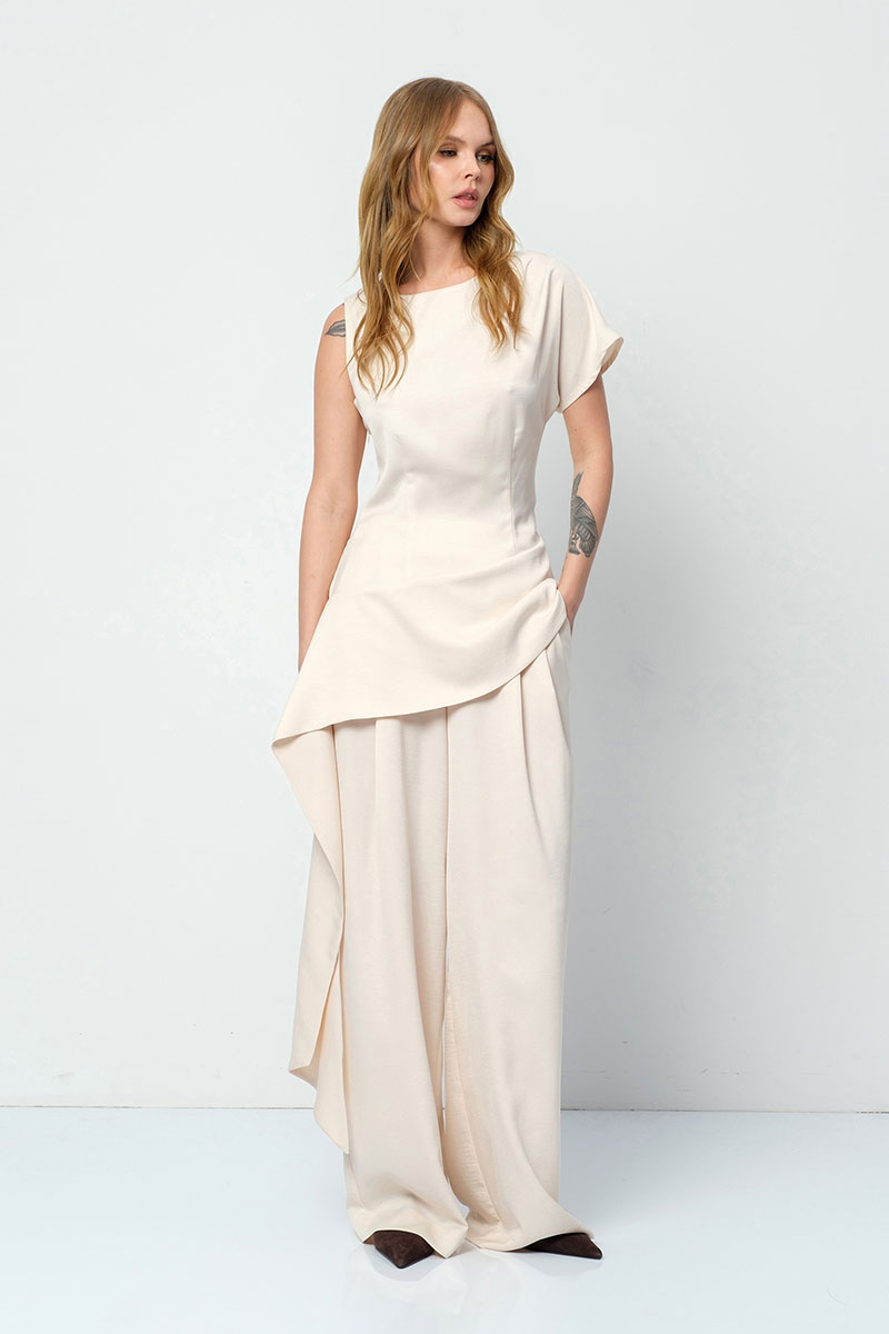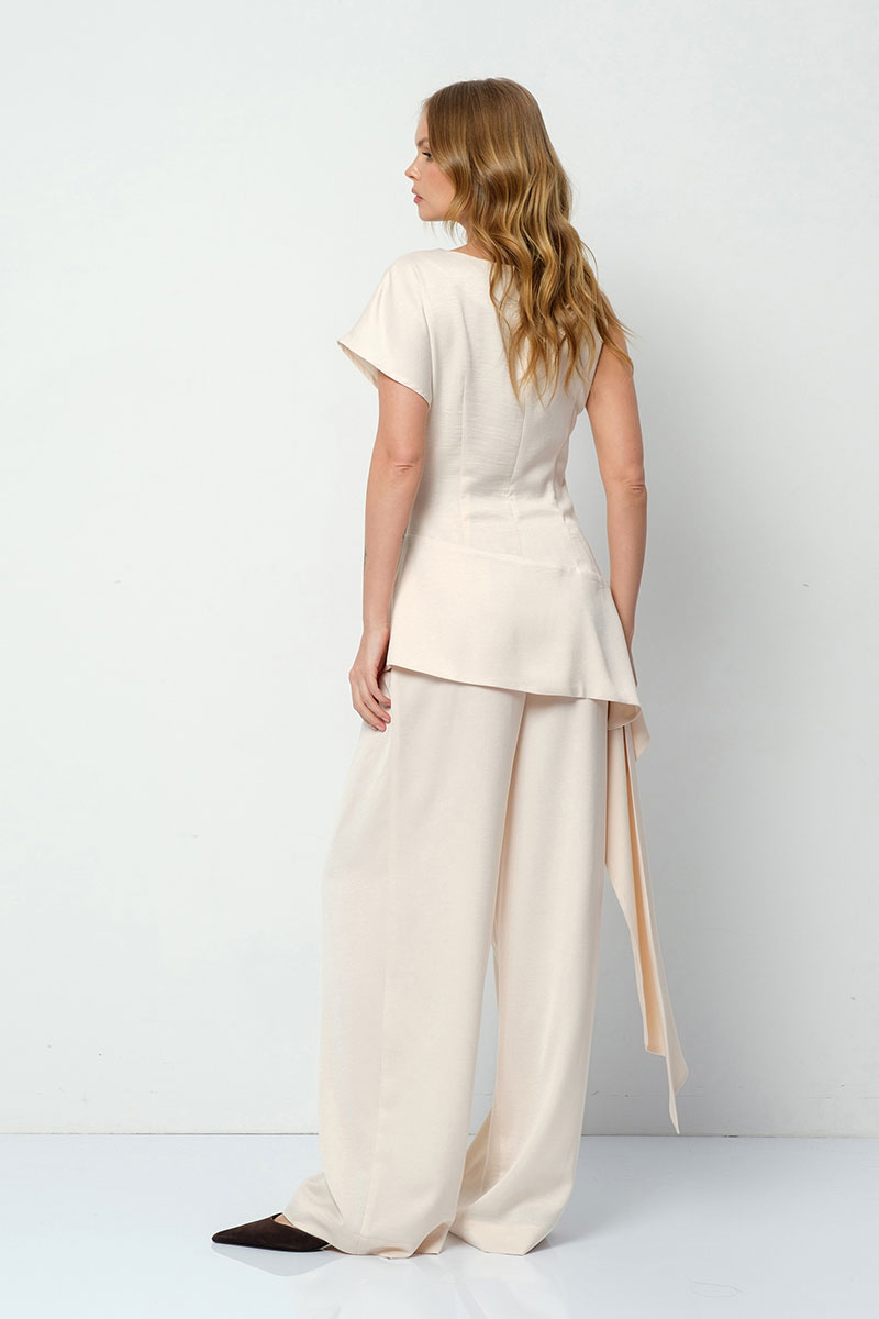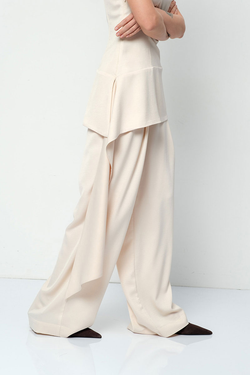 Детали: высокая посадка, передние половины брюк с двумя складками, эластичный пояс-резинка, боковые карманы, без застежки.