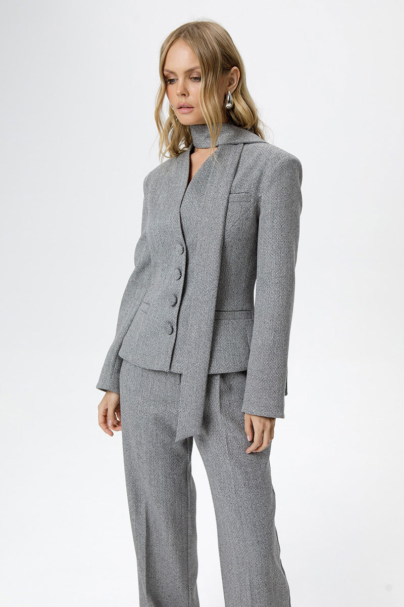 Детали: брюки с притачным поясом со шлевками, передние половины с небольшими застроченными мягкими складками и заутюженными стрелками, застежка на молнию и пуговицу, боковые карманы. Задние части брюк с вытачками и заутюженными стрелками. Пояс брюк прямой, без резинки.