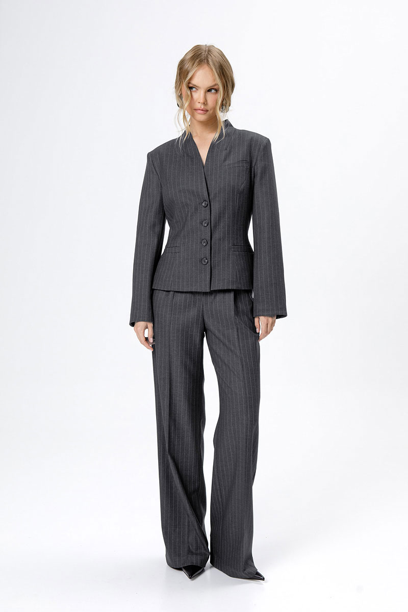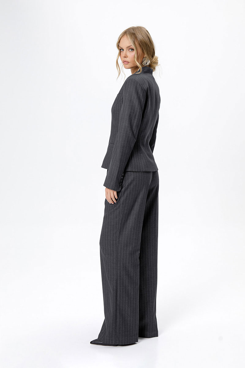 Детали: брюки с притачным поясом со шлевками, передние половины с небольшими застроченными мягкими складками и заутюженными стрелками, застежка на молнию и пуговицу, боковые карманы. Задние части брюк с вытачками и заутюженными стрелками. Пояс брюк прямой, без резинки.