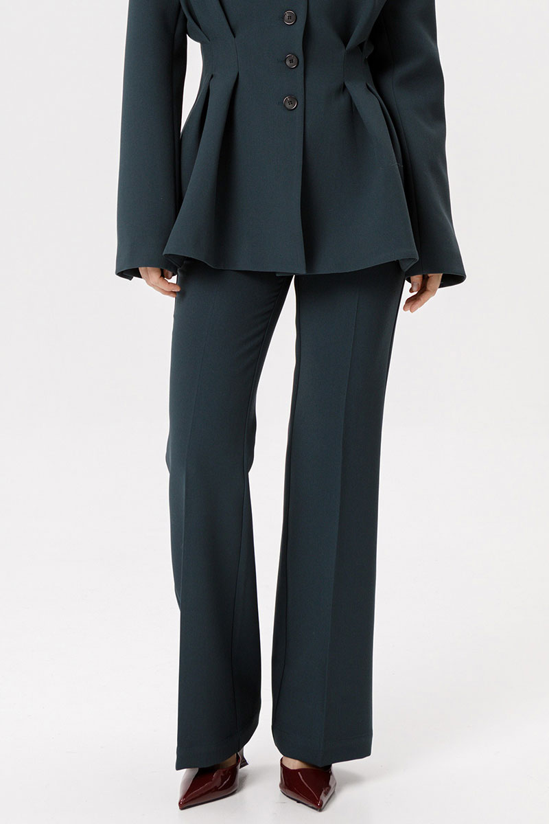 Детали: притачной пояс со шлевками, передние половины с заутюженными стрелками, застежка на молнию и потайные крючки, боковые карманы. Задние части брюк с вытачками и заутюженными стрелками. Пояс брюк без резинки.