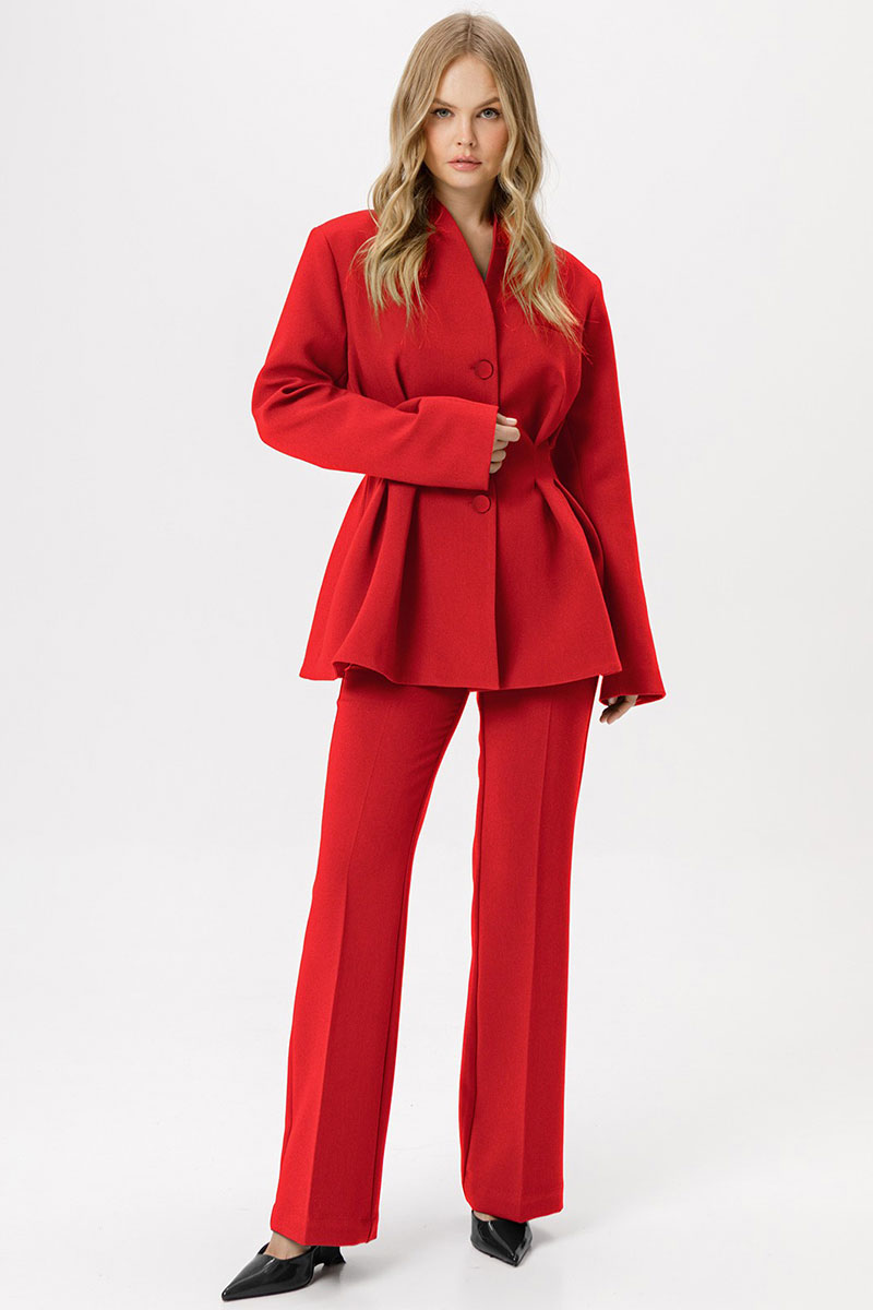 Детали: притачной пояс со шлевками, передние половины с заутюженными стрелками, застежка на молнию и потайные крючки, боковые карманы. Задние части брюк с вытачками и заутюженными стрелками. Пояс брюк без резинки.