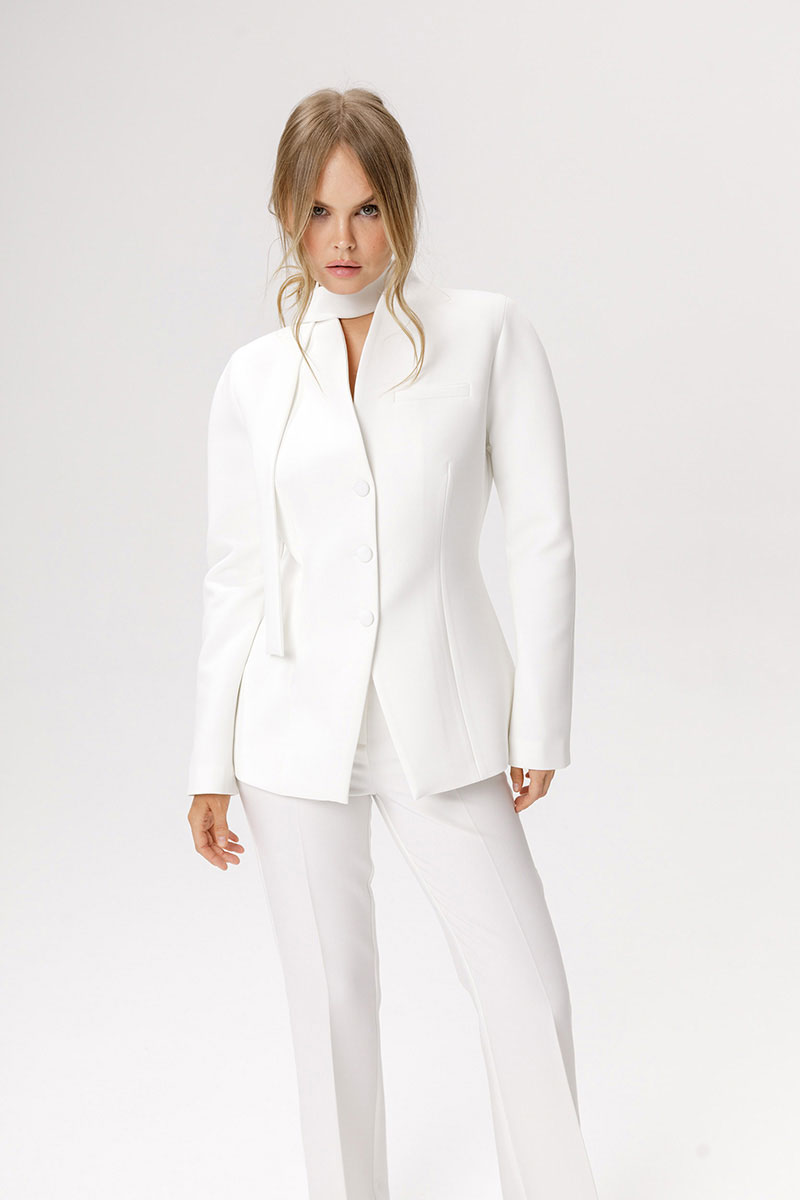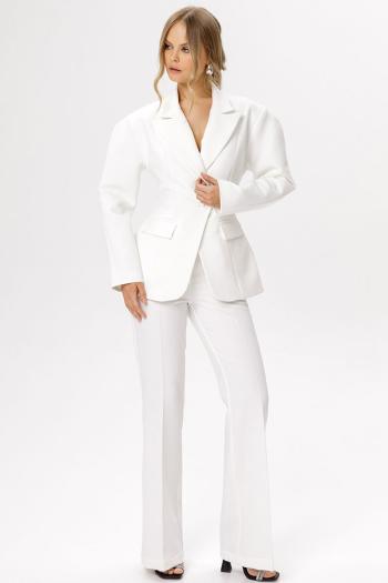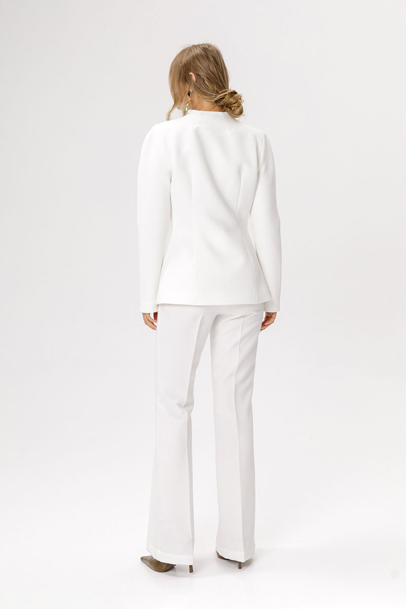 Детали: притачной пояс со шлевками, передние половины с заутюженными стрелками, застежка на молнию и потайные крючки, боковые карманы. Задние части брюк с вытачками и заутюженными стрелками. Пояс брюк без резинки.