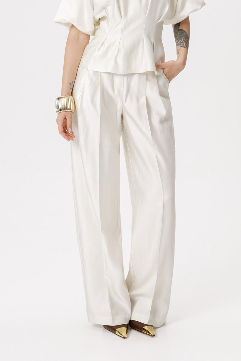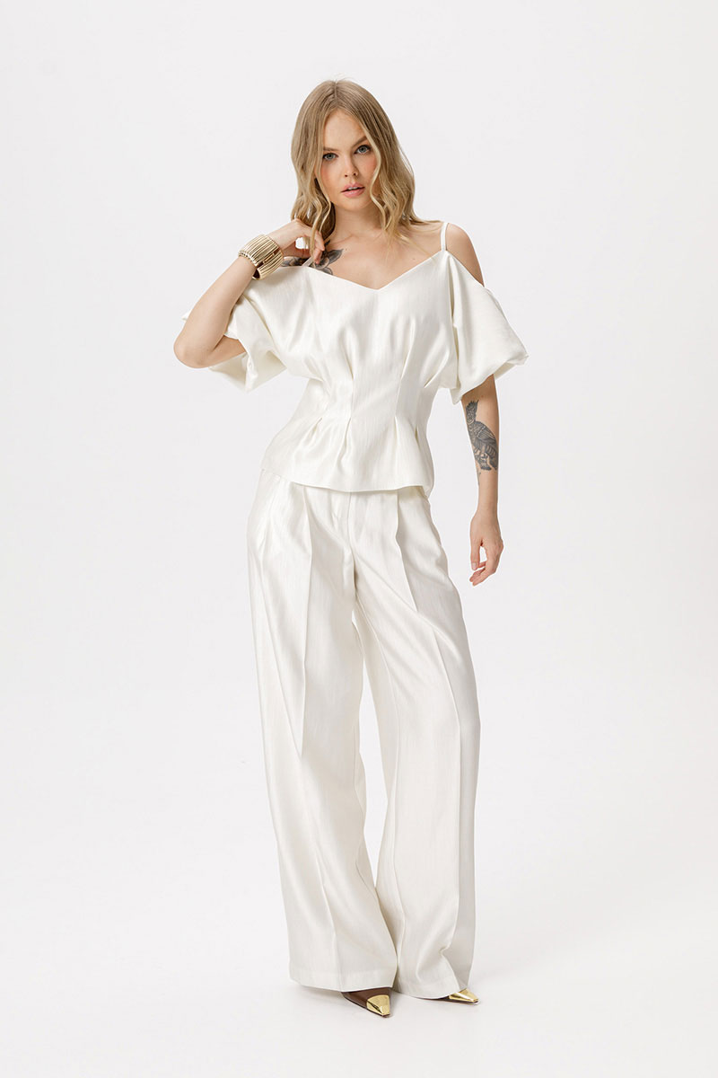 Детали: брюки с притачным поясом со шлевками, складки у пояса, застежка на молнию и пуговицу, боковые карманы, заутюженные стрелки. Задние части брюк с вытачками и имитацией карманов.