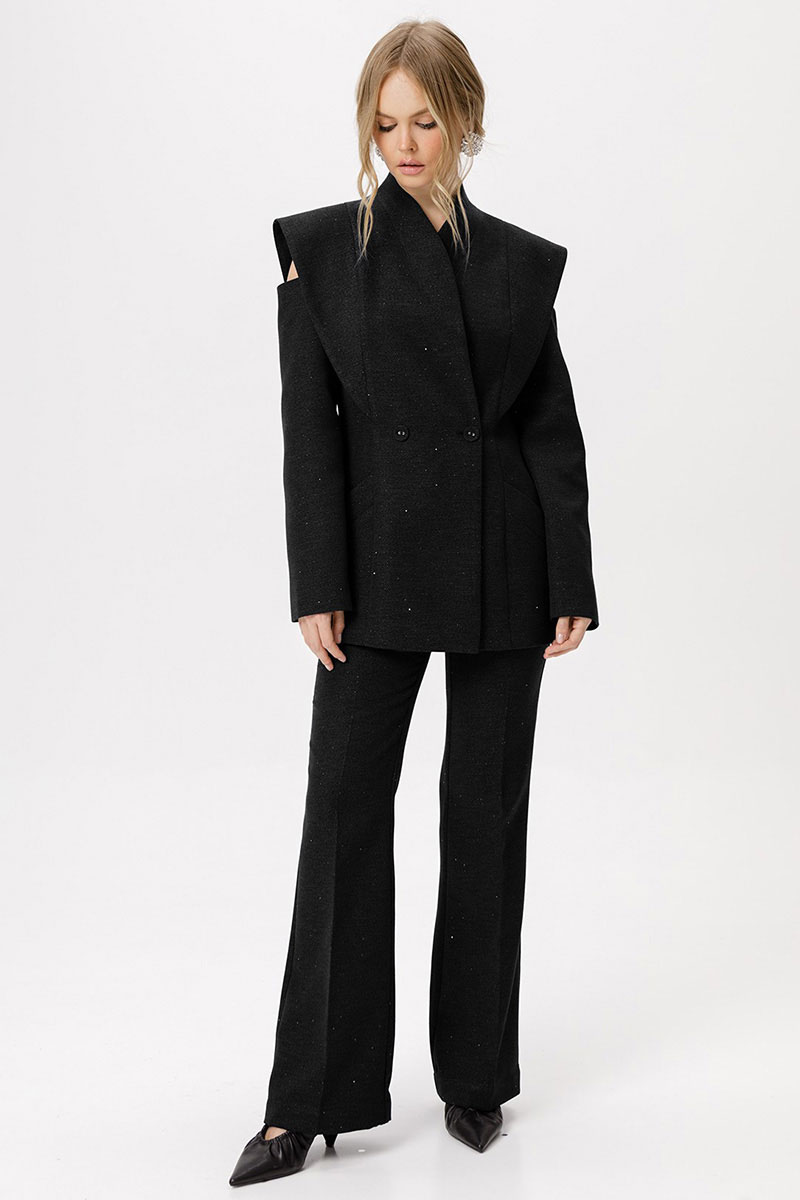 Детали: притачной пояс со шлевками, передние половины с заутюженными стрелками, застежка на молнию и потайные крючки, боковые карманы. Задние части брюк с вытачками и заутюженными стрелками. Пояс брюк без резинки.