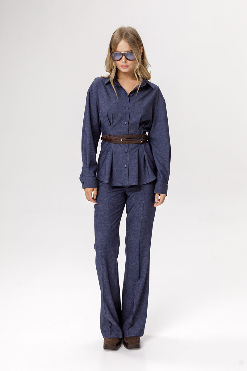 Детали: брюки с притачным поясом со шлёвками, талиевые вытачки и заутюженные стрелки по передним и задним половинкам брюк, наклонные карманы в боковом шве, застёжка на молнию и крючок.