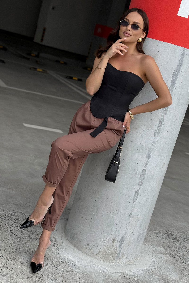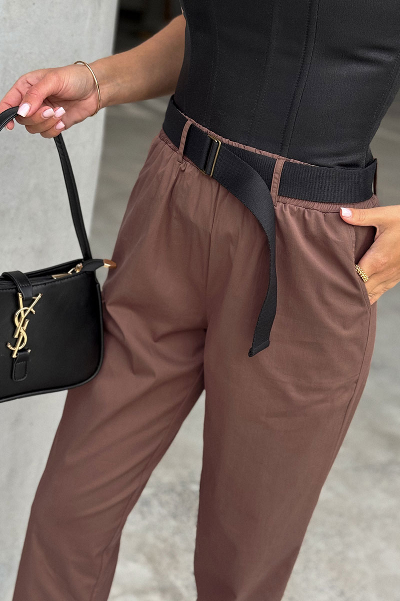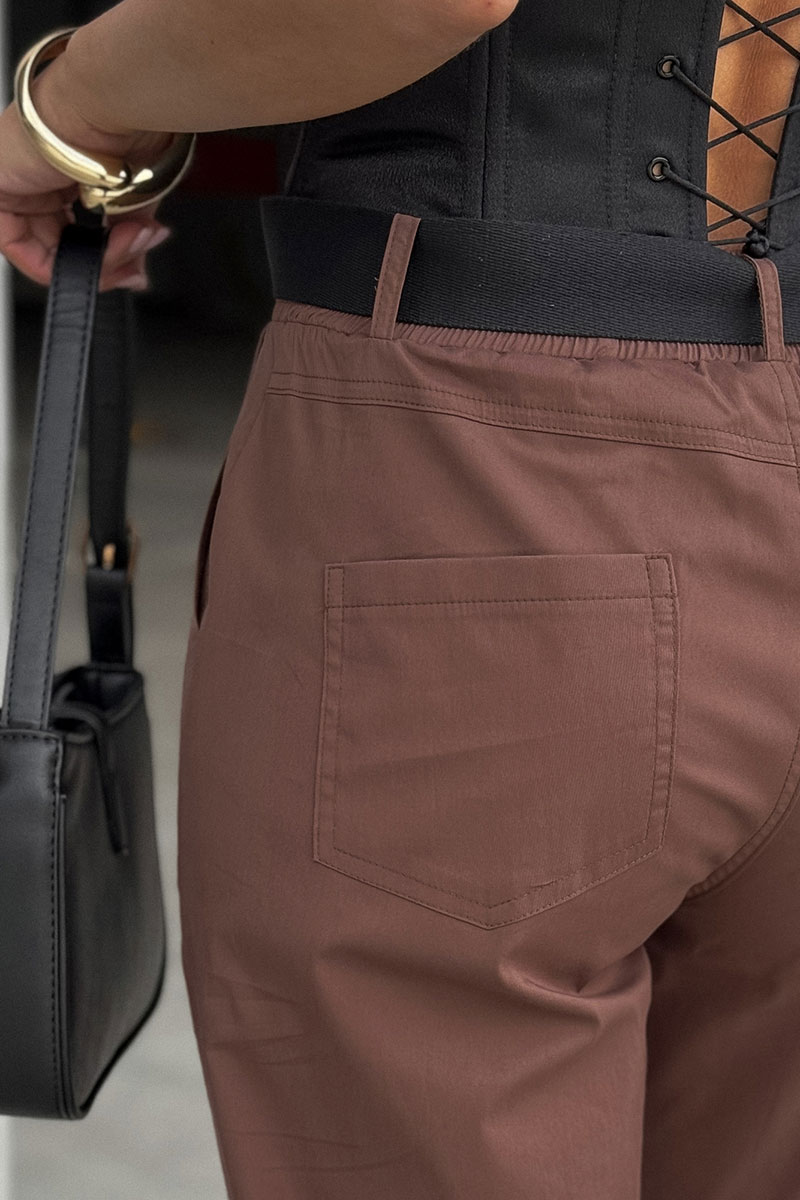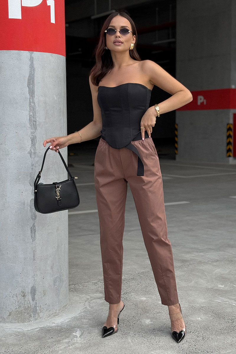 Брюки женские из текстильной ткани, слегка заужены к низу. В боковых швах расположены карманы. По низу передних половинок есть защип. Задняя половинка брюк с отрезной кокеткой и накладными карманами. Вверх брюк обработан поясом с резинкой (без молнии). ПОЯС ВХОДИТ В КОМПЛЕКТ.