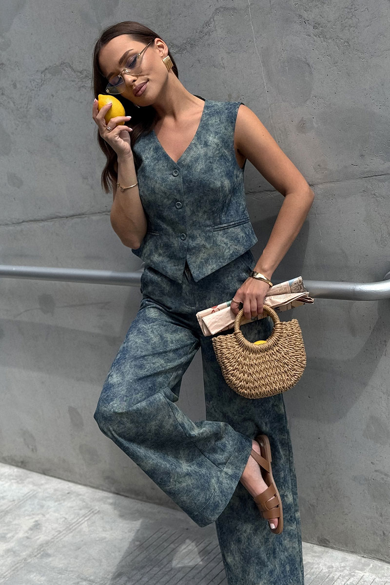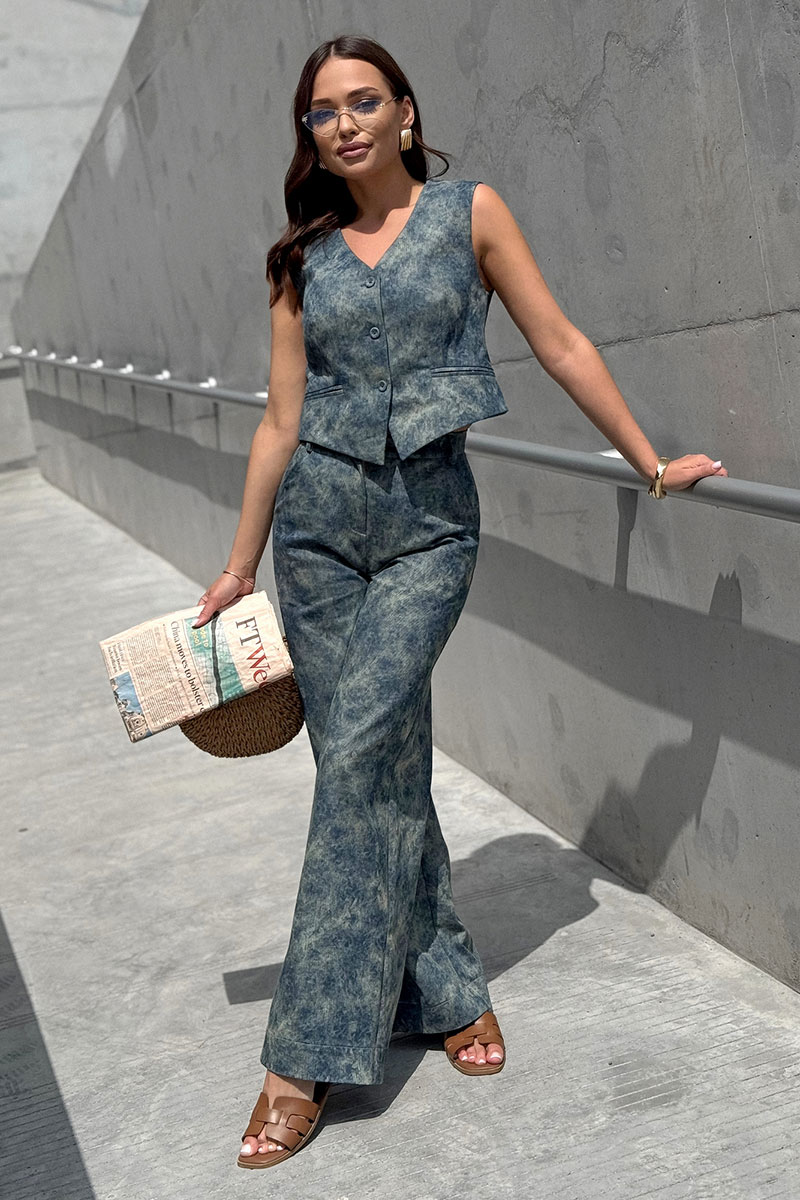 Брюки женские прямые из текстильной ткани (джинс). В боковых швах расположены подрезные карманы. По задним половинкам расположены талиевые вытачки. Верх брюк обработан притачным поясом со шлевками.