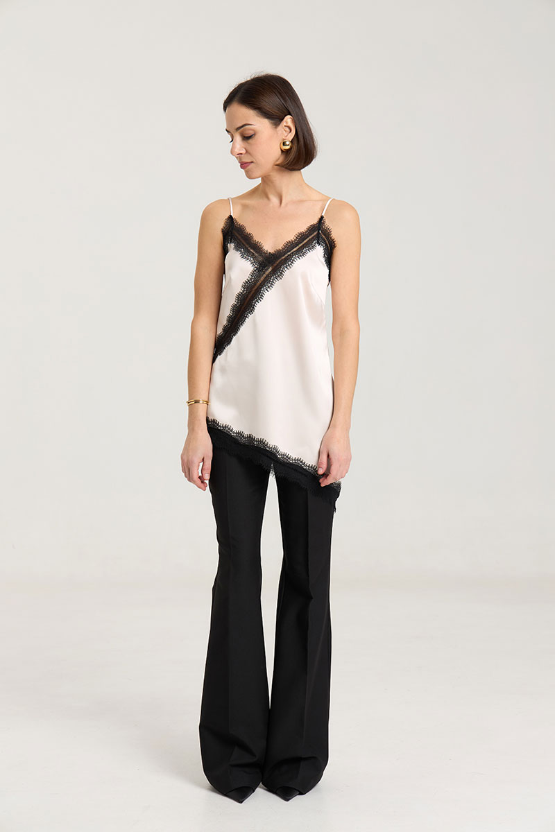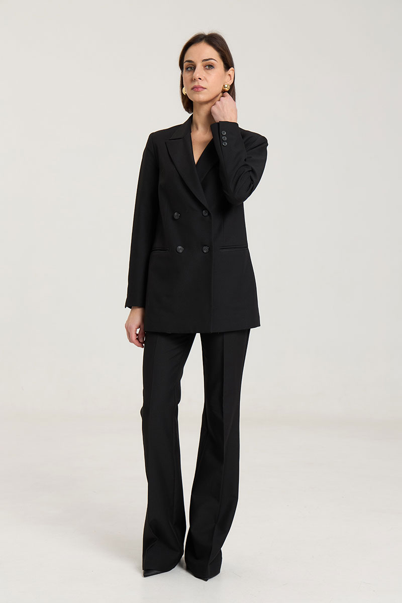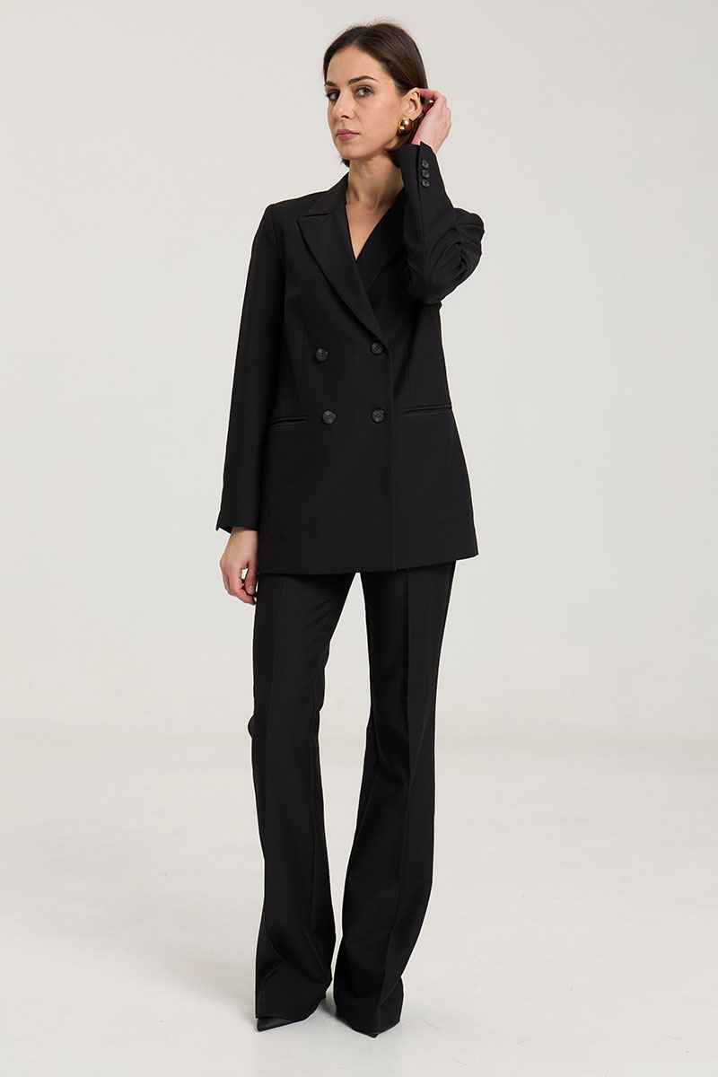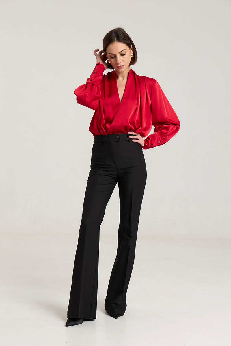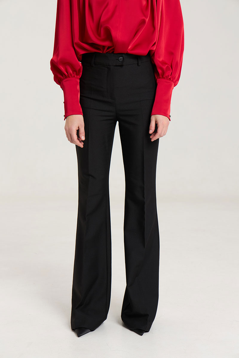 Классические расклешенные брюки полупрелегающегоьсилуэта с высокрй посадкой, пояс притачной со шлевками, застежка на молнию и петлю-пуговицу, брюки без карманов. Выполнены из премиальной ткани костюмной группы.