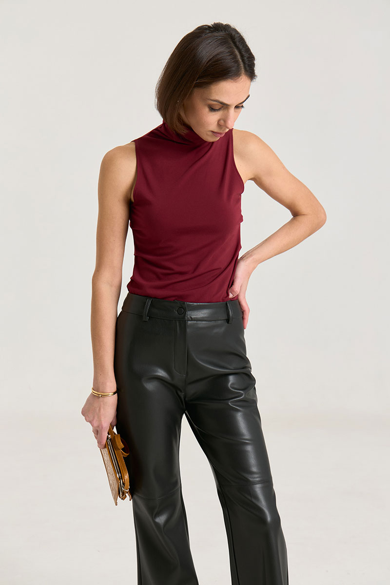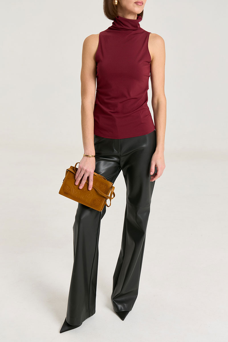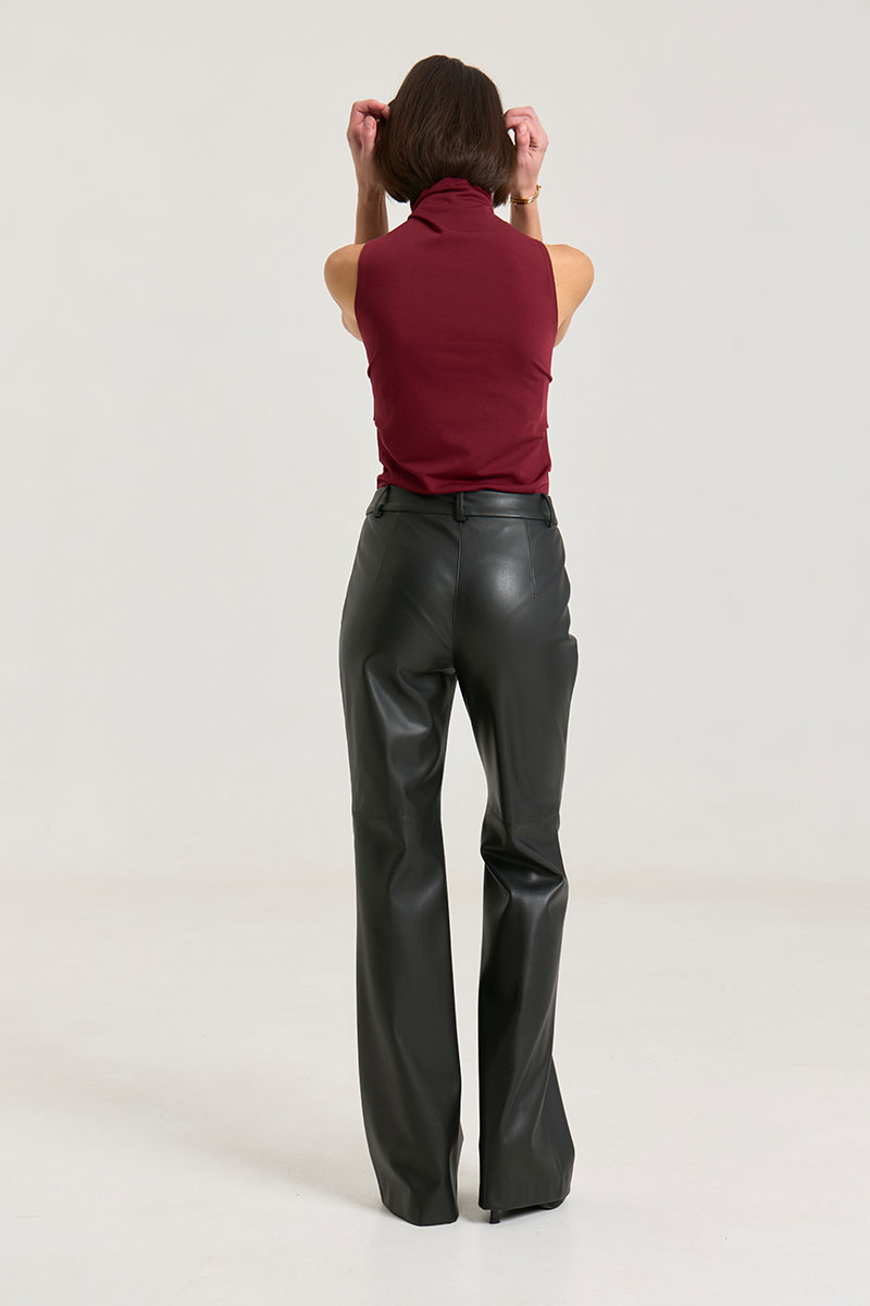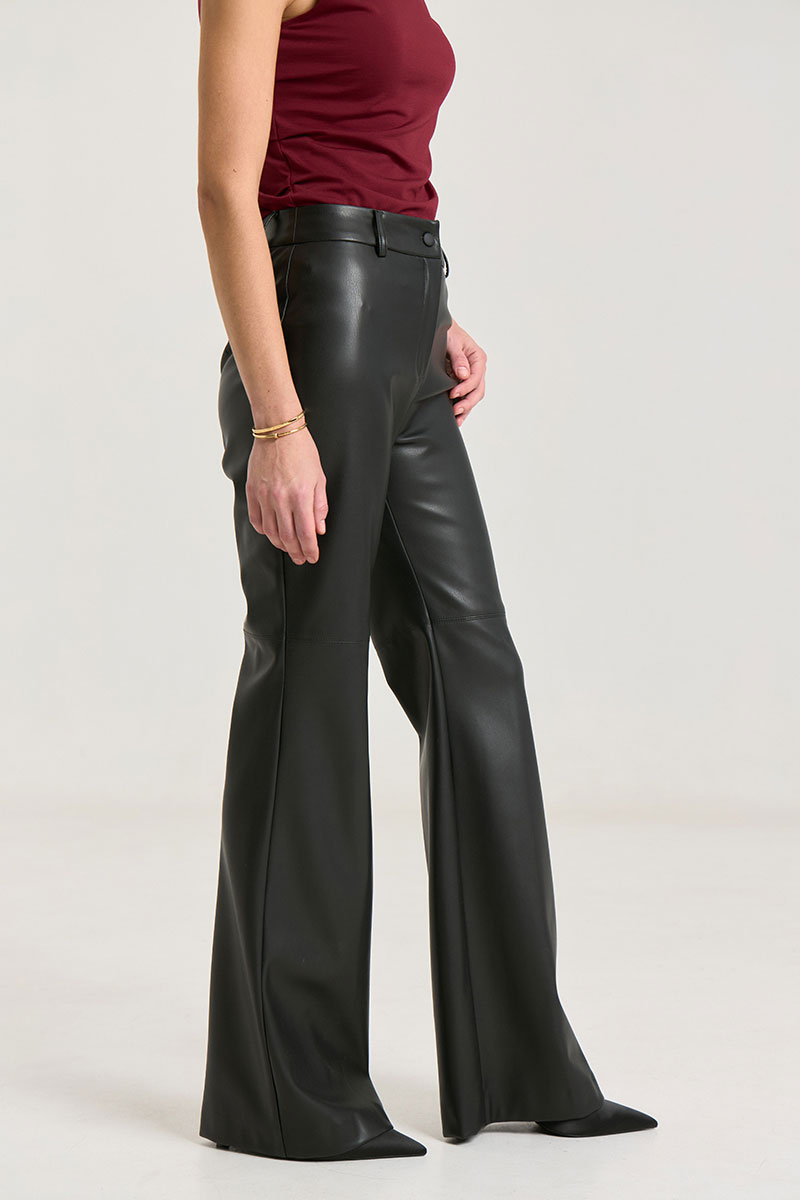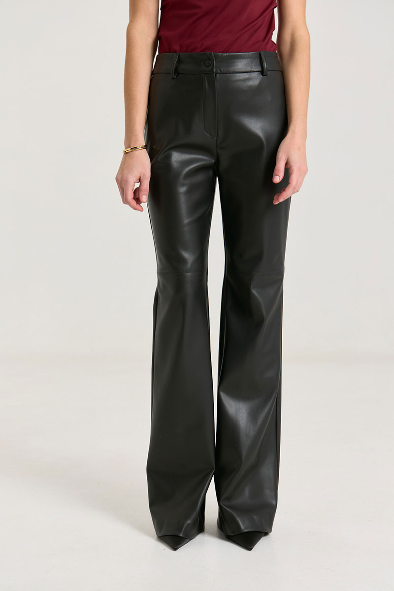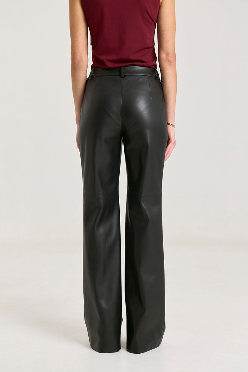 Классические расклешенные брюки прилегающего силуэта с высокой посадкой, пояс притачной со шлевками, застежка на молнию и петлю-пуговицу, брюки без карманов. Выполнены из мягкой экокожи на замшевой основе. Брюки клеш с высокой посадкой подчеркивают женственность фигуры, зрительно удлиняют ноги и красиво вытягивают силуэт.