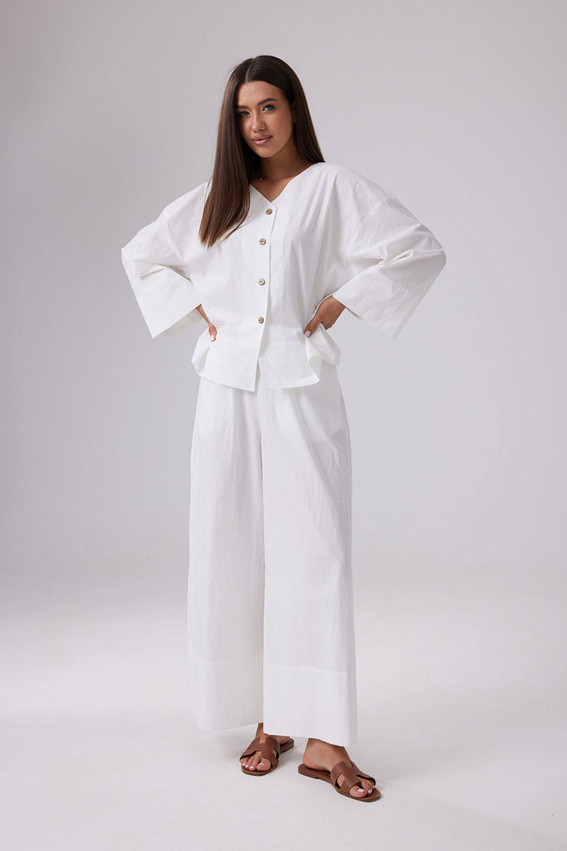 Легкие летние брюки свободного силуэта из хлопковой ткани с эффектом мятости. Пояс на эластичной резинке шириной 4 см, с продетым декоративным шнурком. По низу широкая подгибка. В боковых швах функциональные карманы.
