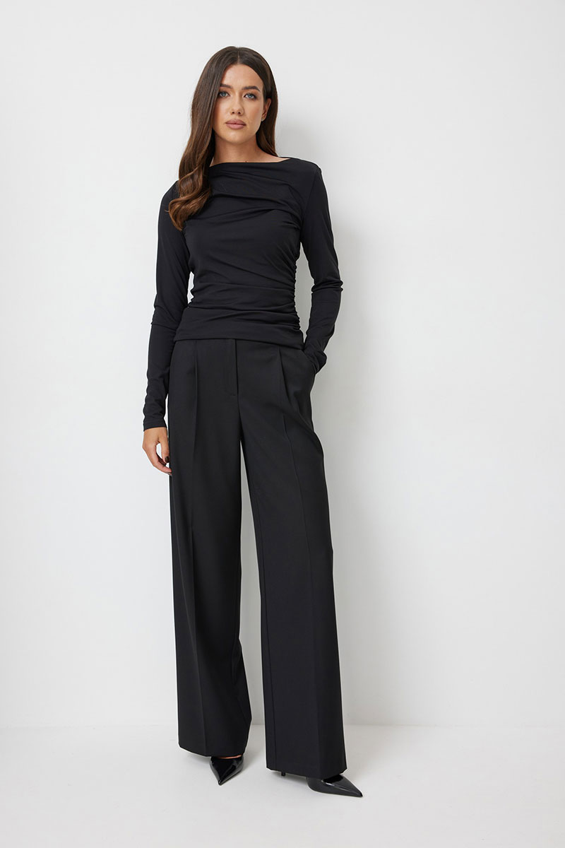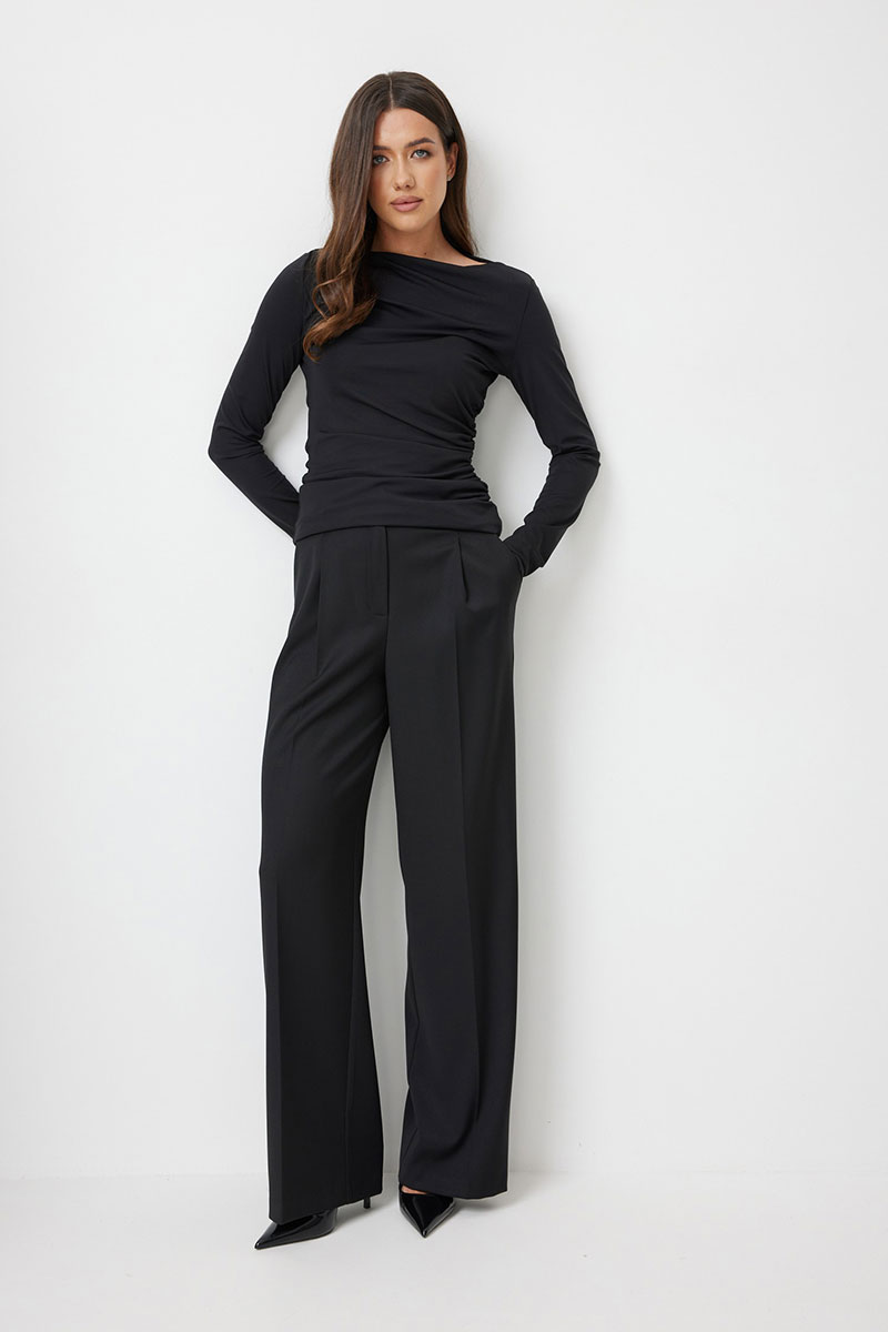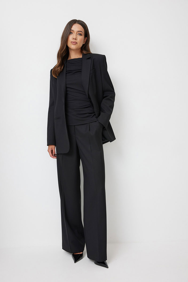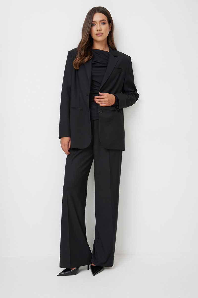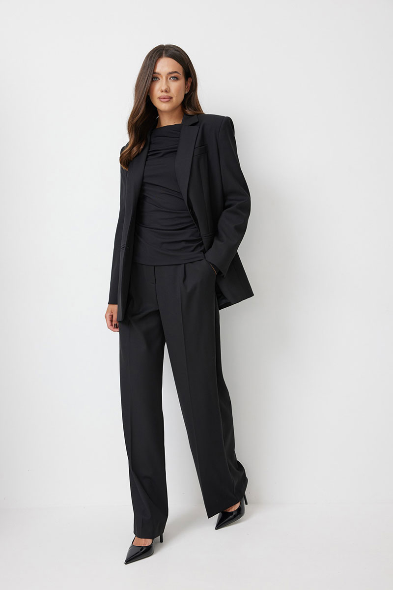 Брюки женские, прямые, с высокой посадкой. Выполнены из костюмной ткани. В боковых подрезах по переду функциональные карманы. Пояс притачной со шлевками, застегивается на потайной крючок. Застежка на тесьму-молнию. По переднему полотнищу встречные складки.