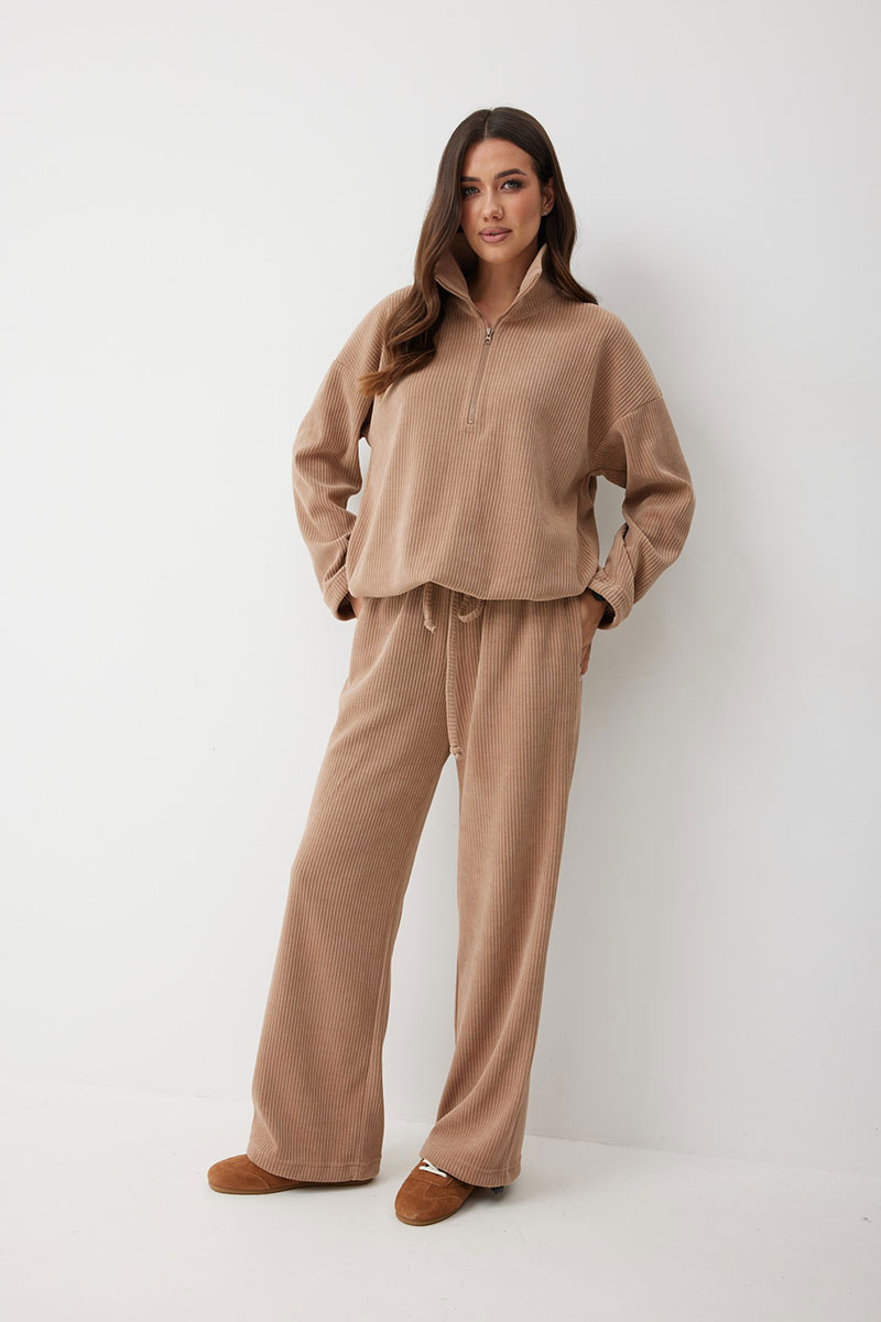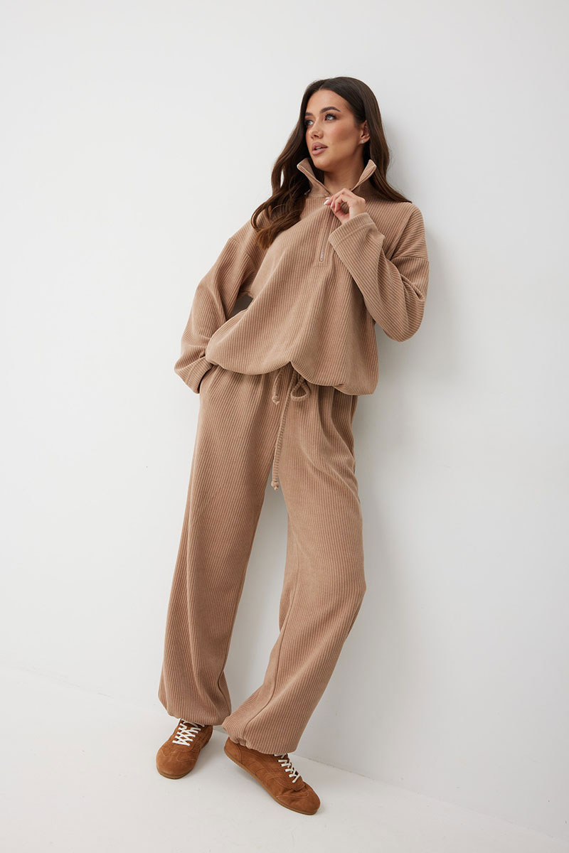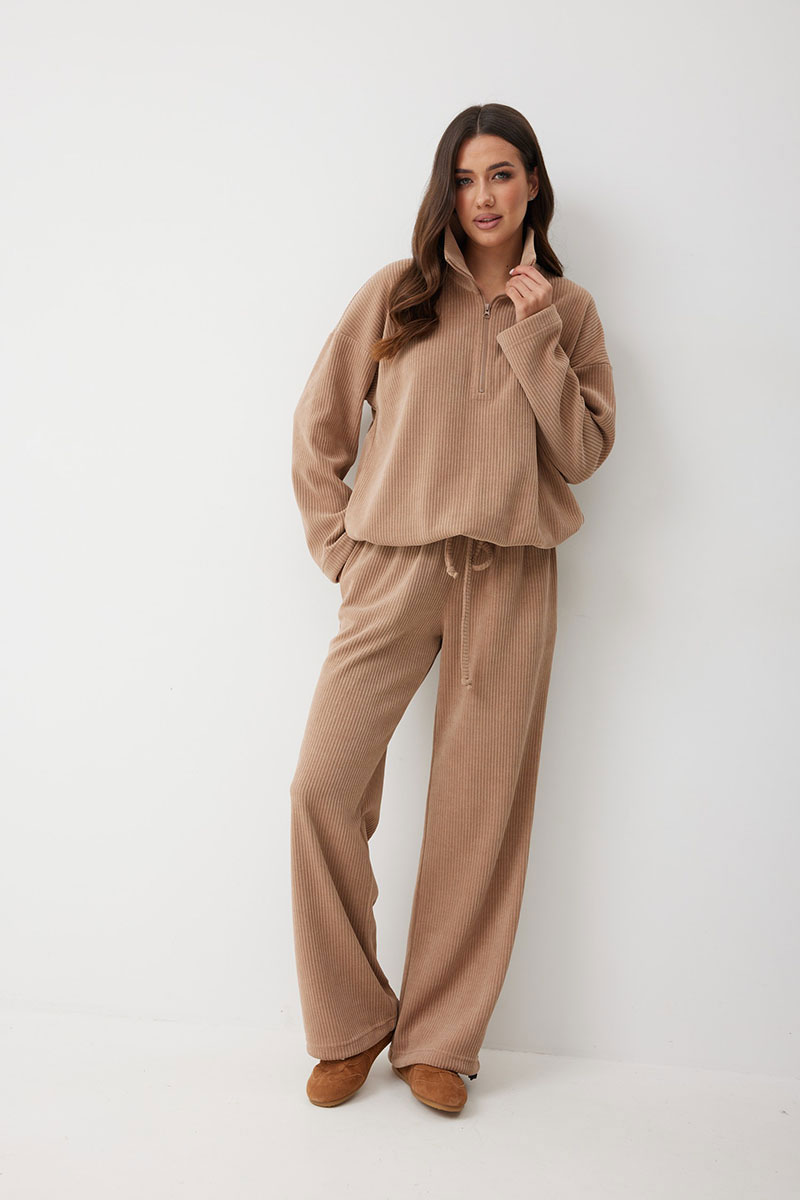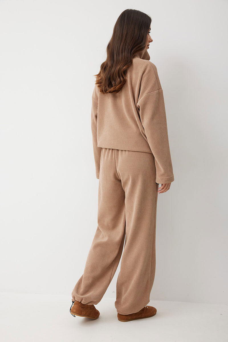 Женские брюки в актуальном спортивном стиле. Модель выполнена из мягкого трикотажного полотна с широким рубчиком, что добавляет фактурности и мягкости. Свободный силуэт гарантирует максимальный комфорт и непринужденный вид.