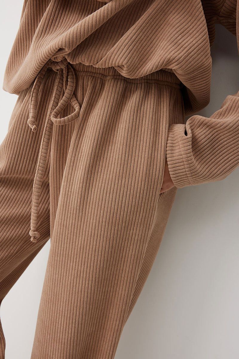 Пояс на резинке обеспечивает идеальную посадку, а дополнительный шнурок из основной ткани позволяет точно отрегулировать объем. Для удобства в боковых швах сделаны функциональные карманы. По низу штанин продета резинка с фиксатором. Вы можете носить брюки классическим прямым кроем или, утянув фиксаторы, создать модный силуэт джоггеров, который подчеркнет спортивную обувь. Эти брюки — идеальное сочетание уюта и актуального спорт-шика.