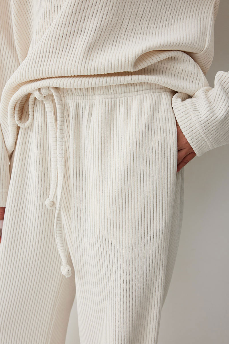 Пояс на резинке обеспечивает идеальную посадку, а дополнительный шнурок из основной ткани позволяет точно отрегулировать объем. Для удобства в боковых швах сделаны функциональные карманы. По низу штанин продета резинка с фиксатором. Вы можете носить брюки классическим прямым кроем или, утянув фиксаторы, создать модный силуэт джоггеров, который подчеркнет спортивную обувь. Эти брюки — идеальное сочетание уюта и актуального спорт-шика.