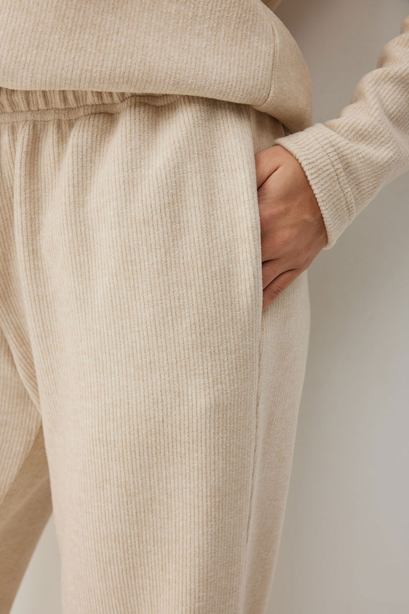 Пояс на резинке обеспечивает идеальную посадку, а дополнительный шнурок из основной ткани позволяет точно отрегулировать объем. Для удобства в боковых швах сделаны функциональные карманы. Эти брюки — идеальное сочетание уюта и актуального спорт-шика.