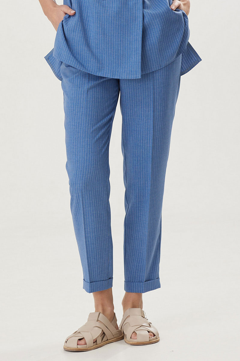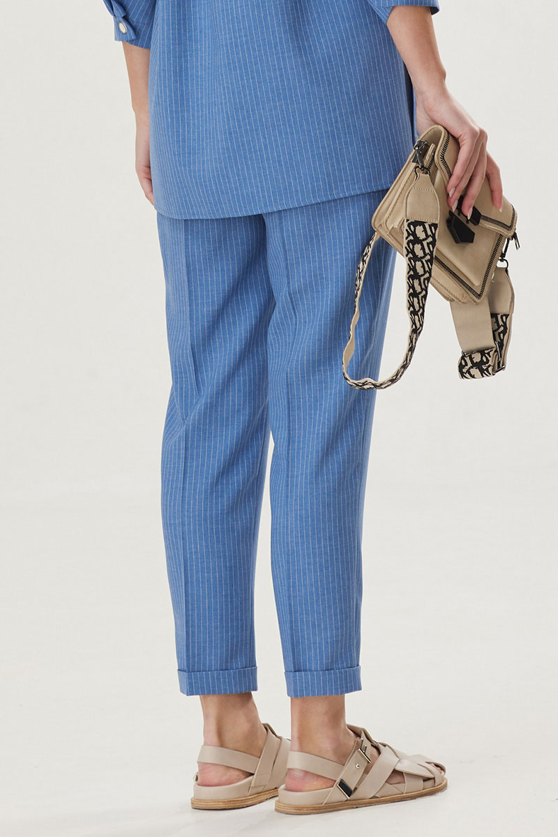 Брюки классической формы, зауженные к низу со стрелками по передним и задним половинкам. По низу брюк манжеты. Верхний срез брюк обработан поясом с резинкой по боковым швам. На задних половинках расположены талиевые вытачки, в боковых швах – наклонные карманы. Перед обработан поясом фигурной формы и декоративным клапаном, на котором пришита пуговица. В комплект входит контрастный узкий ремень.