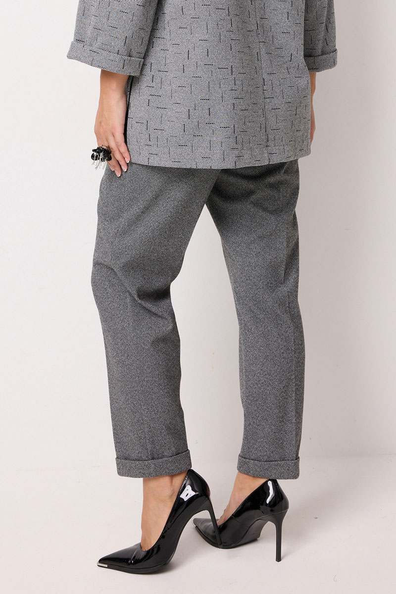 Брюки прямого силуэта, слегка заужены к низу. Низ брюк с цельнокроеной манжетой. Брюки со стрелками по передним и задним половинкам. Верхний срез обработан притачным поясом, в который вставлена резинка. По центру переда - застёжка-обманка. На задних половинках расположены талиевые вытачки. В боковых швах расположены наклонные карманы.
