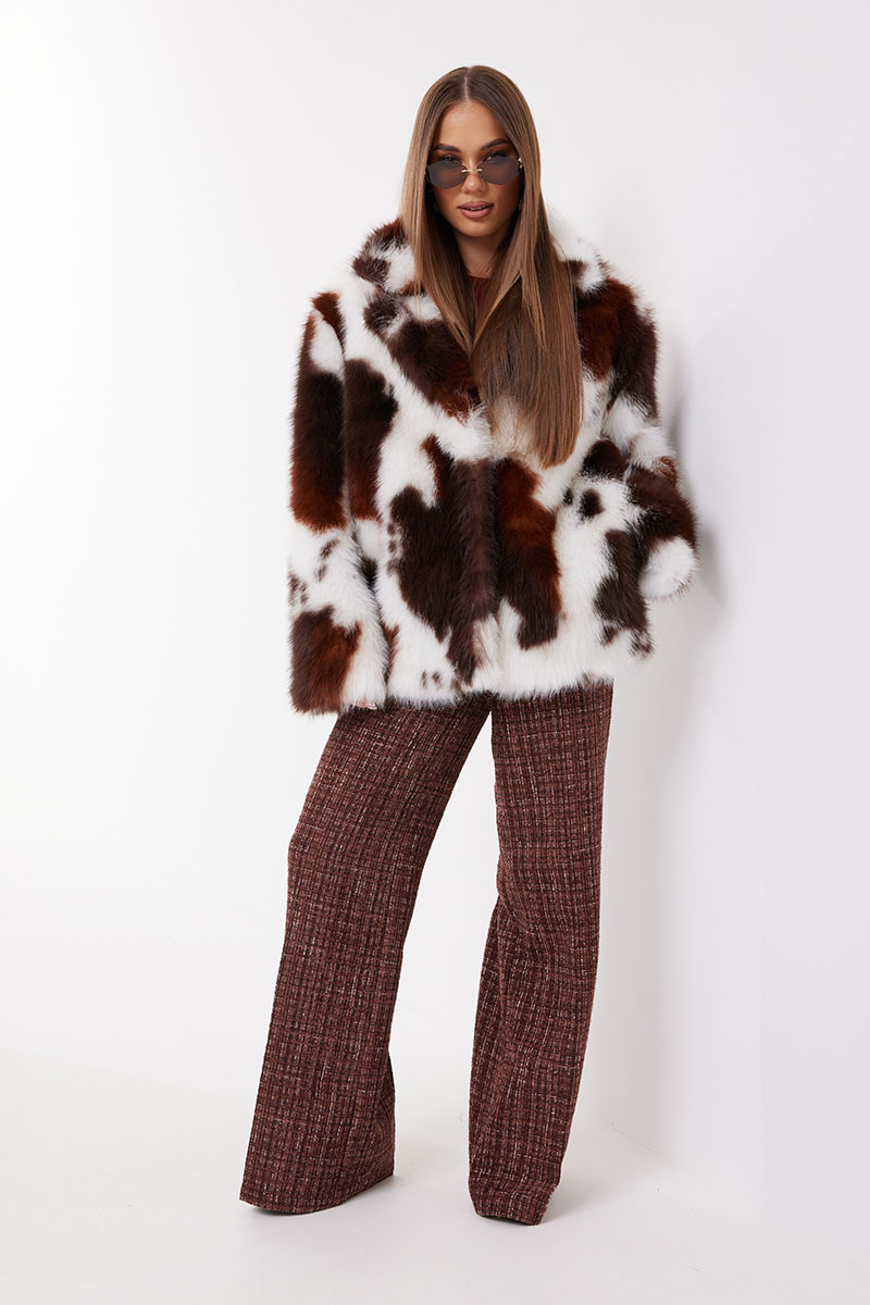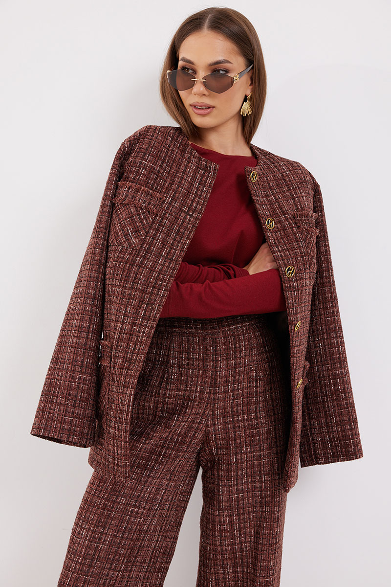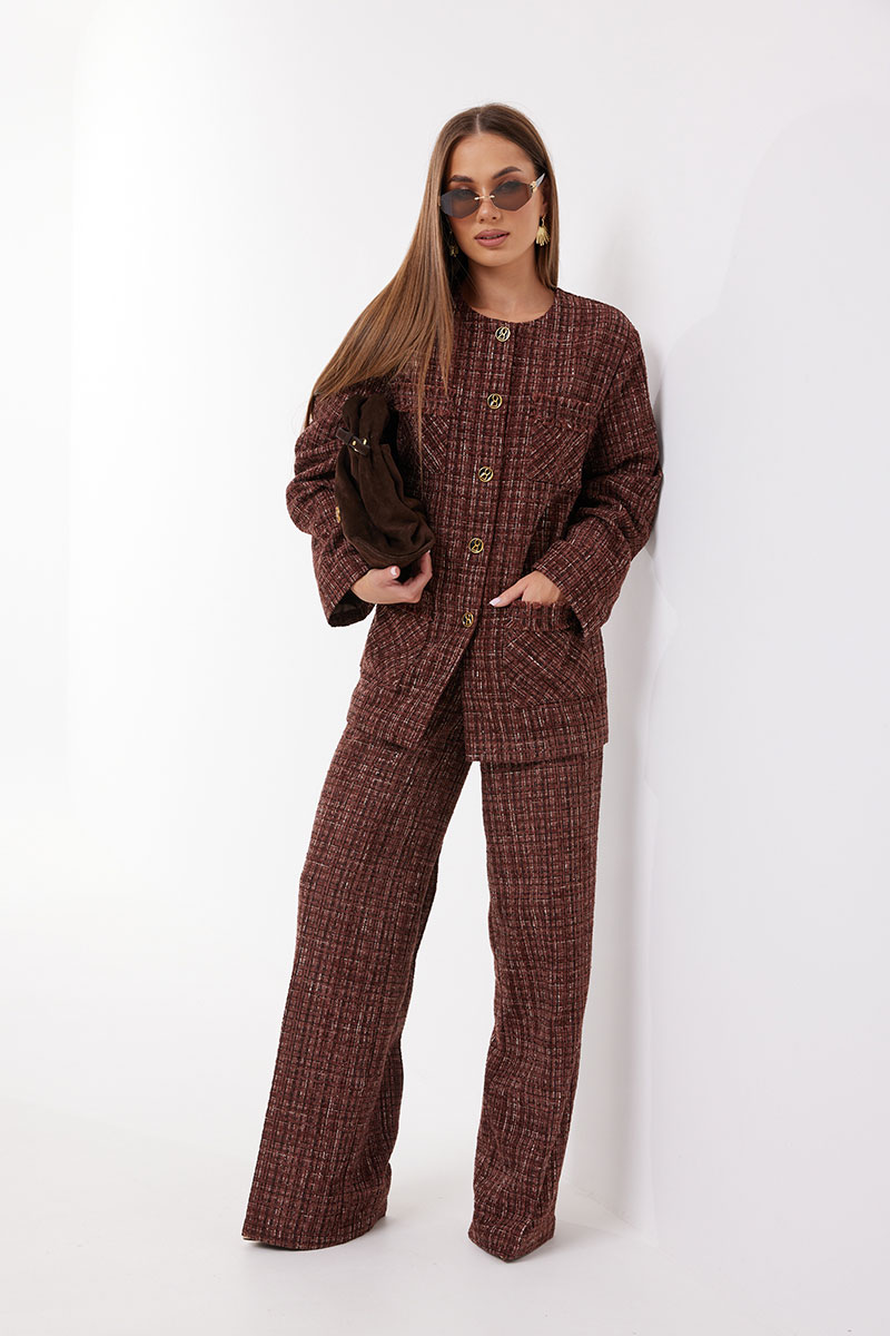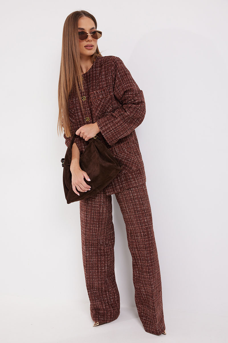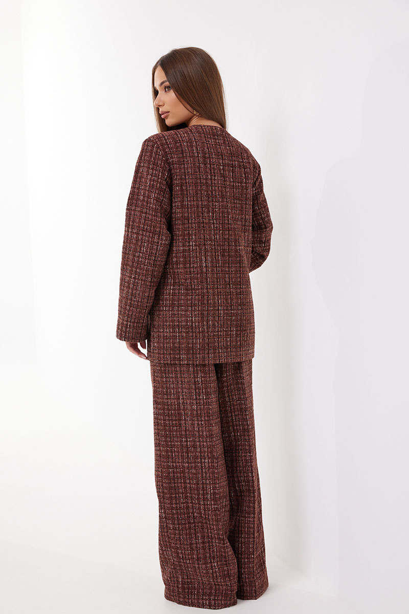 Брюки расширенные из ткани «рогожка». Верх на притачном поясе. Застёжка в боковом шве на металлическую молнию. Брюки на подкладке.