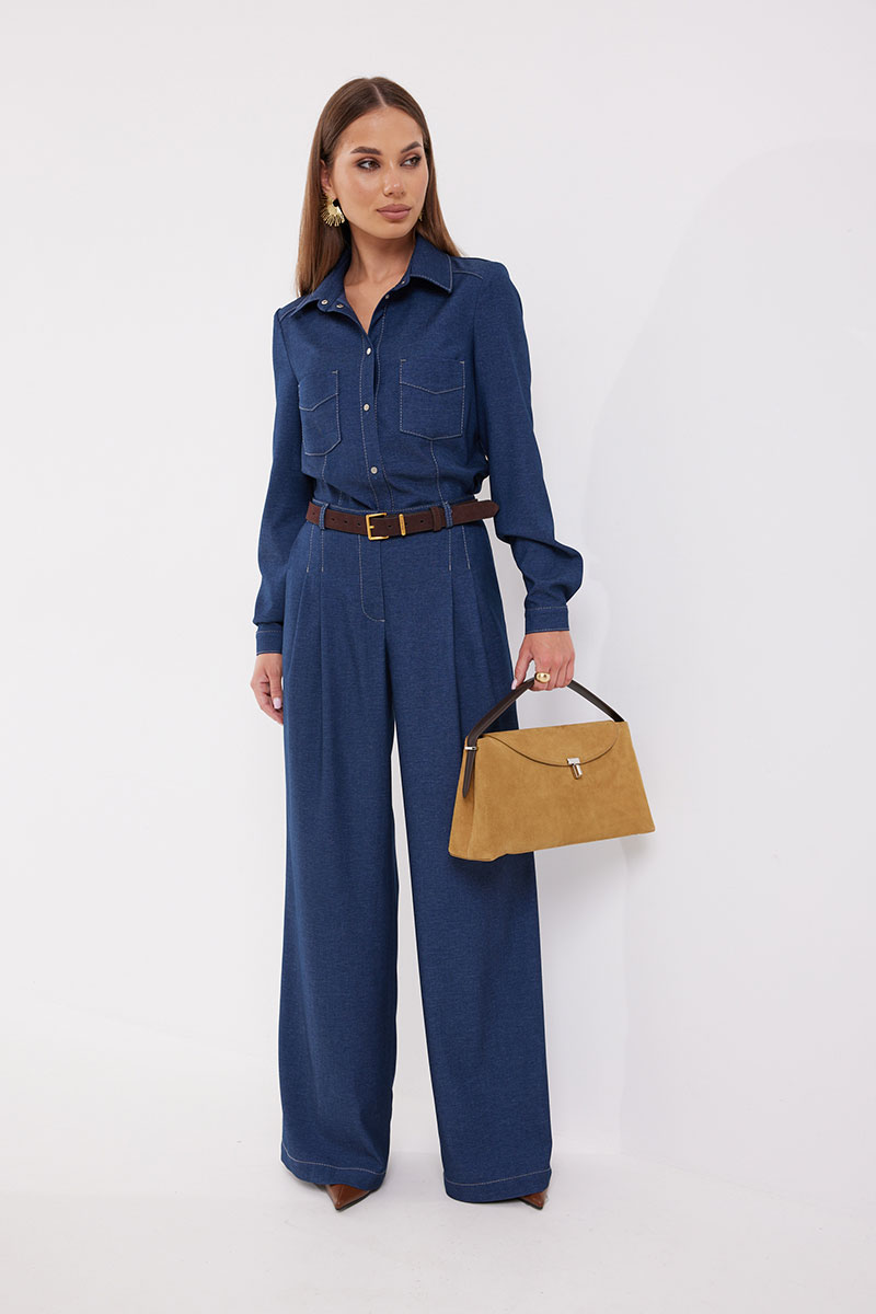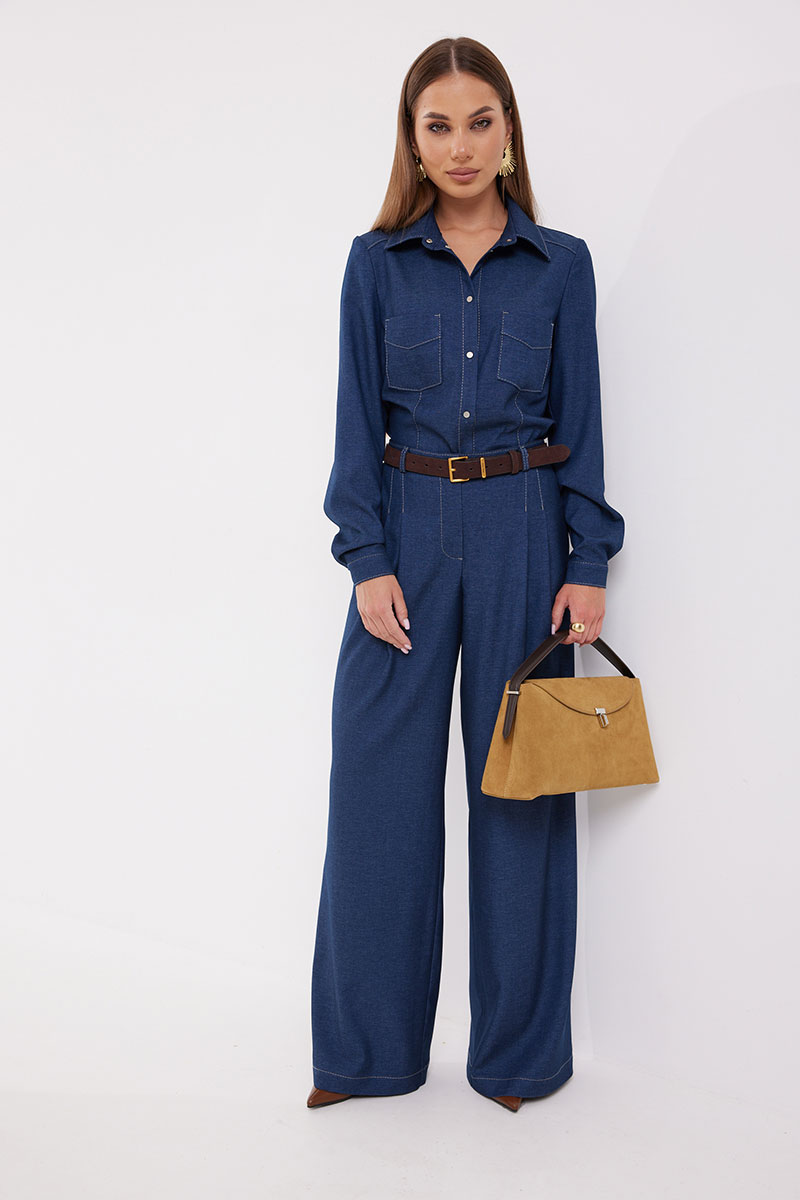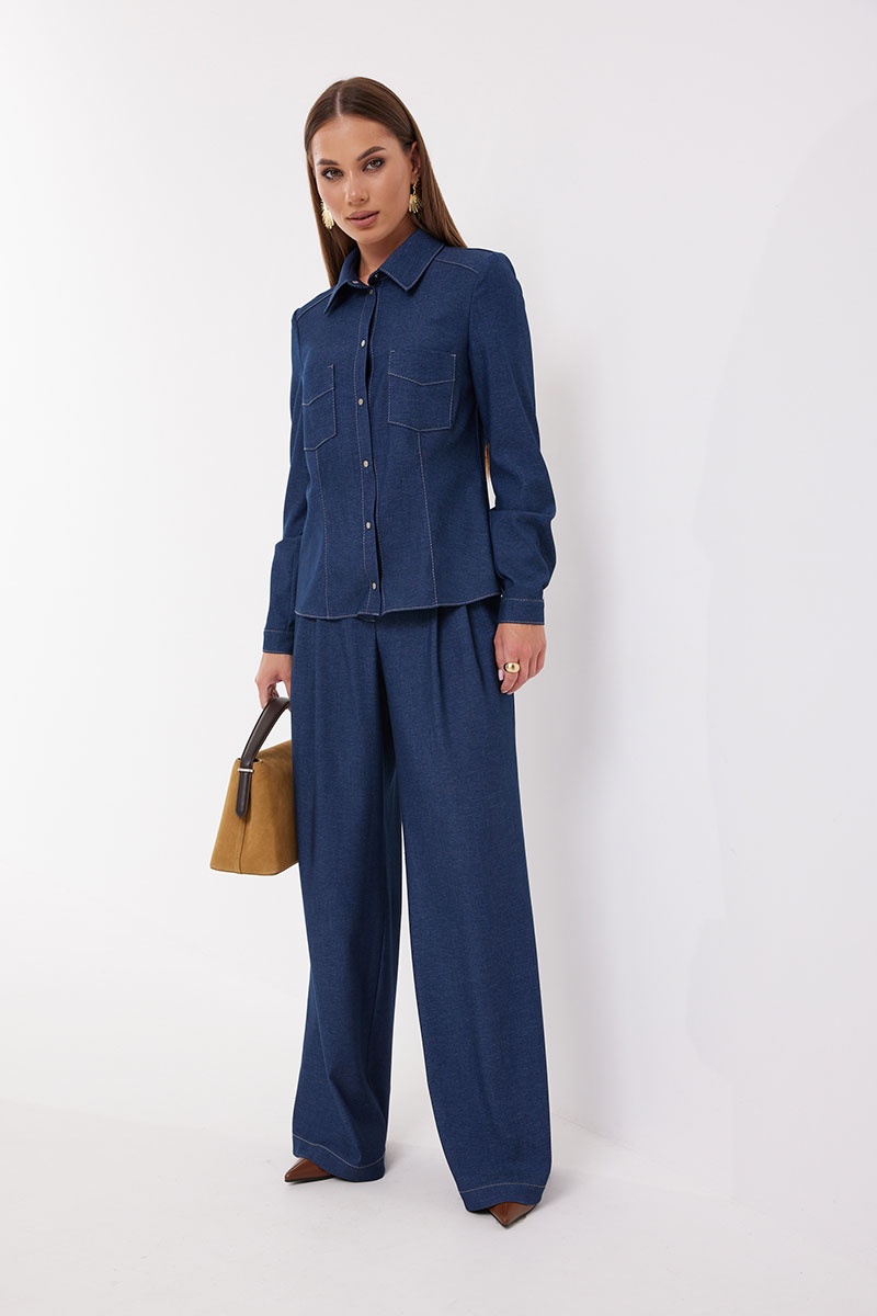 Брюки прямые из костюмной ткани. Верх на поясе со шлевками. Ширинка на молнии и удлиненный пояс со скрытой застежкой на пуговицу и крючок. На передних половинках брюк по две односторонние складки , диагональные боковые карманы.