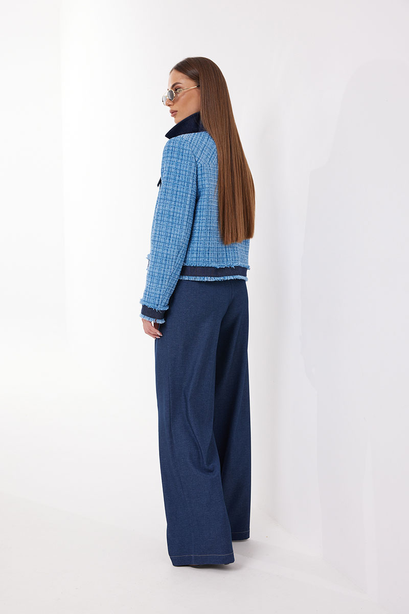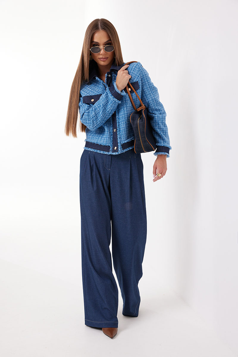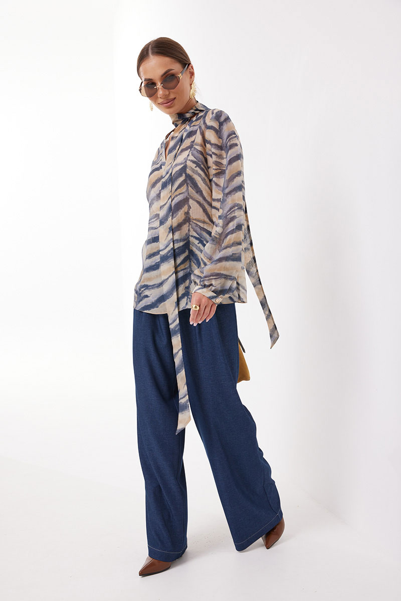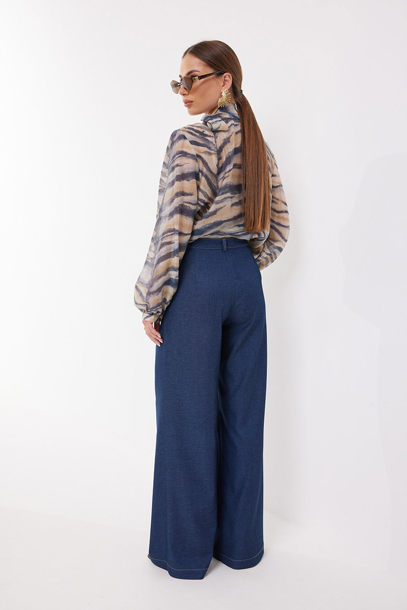 Брюки прямые из костюмной ткани. Верх на поясе со шлевками. Ширинка на молнии и удлиненный пояс со скрытой застежкой на пуговицу и крючок. На передних половинках брюк по две односторонние складки , диагональные боковые карманы.