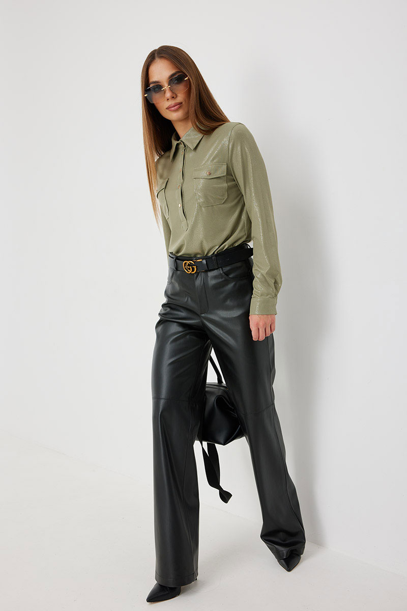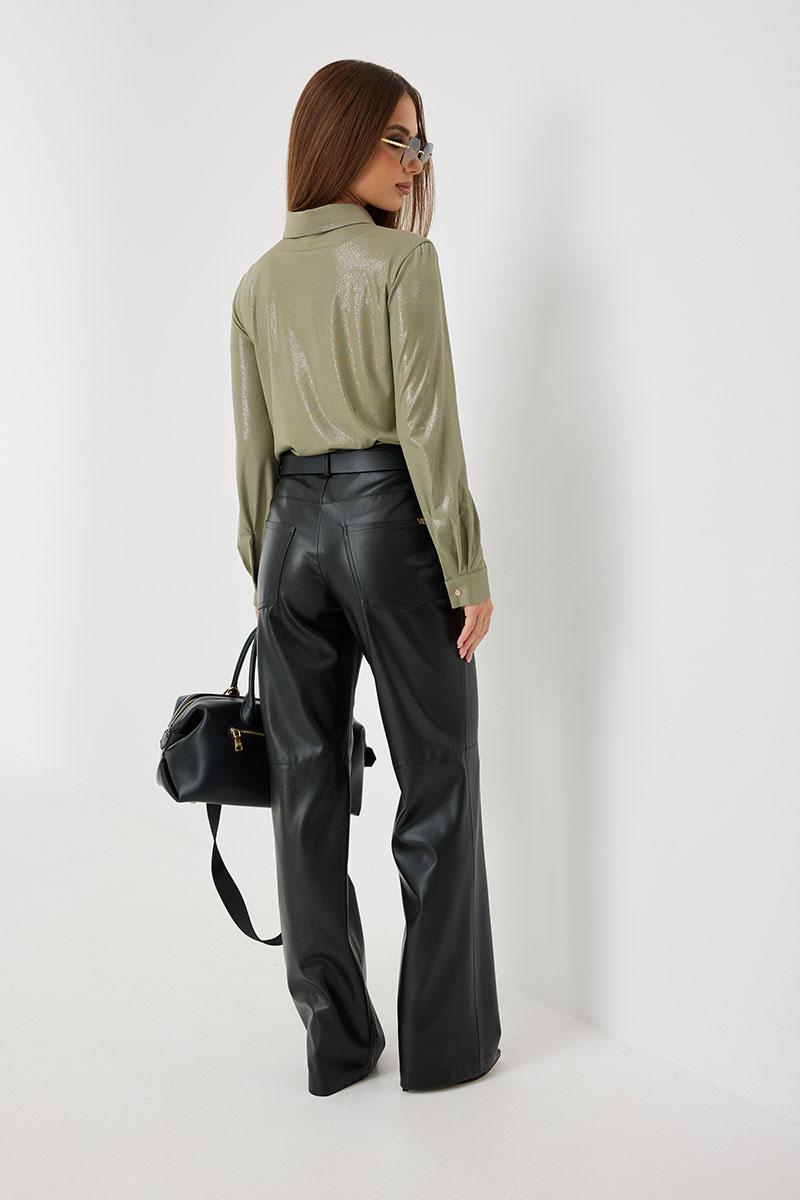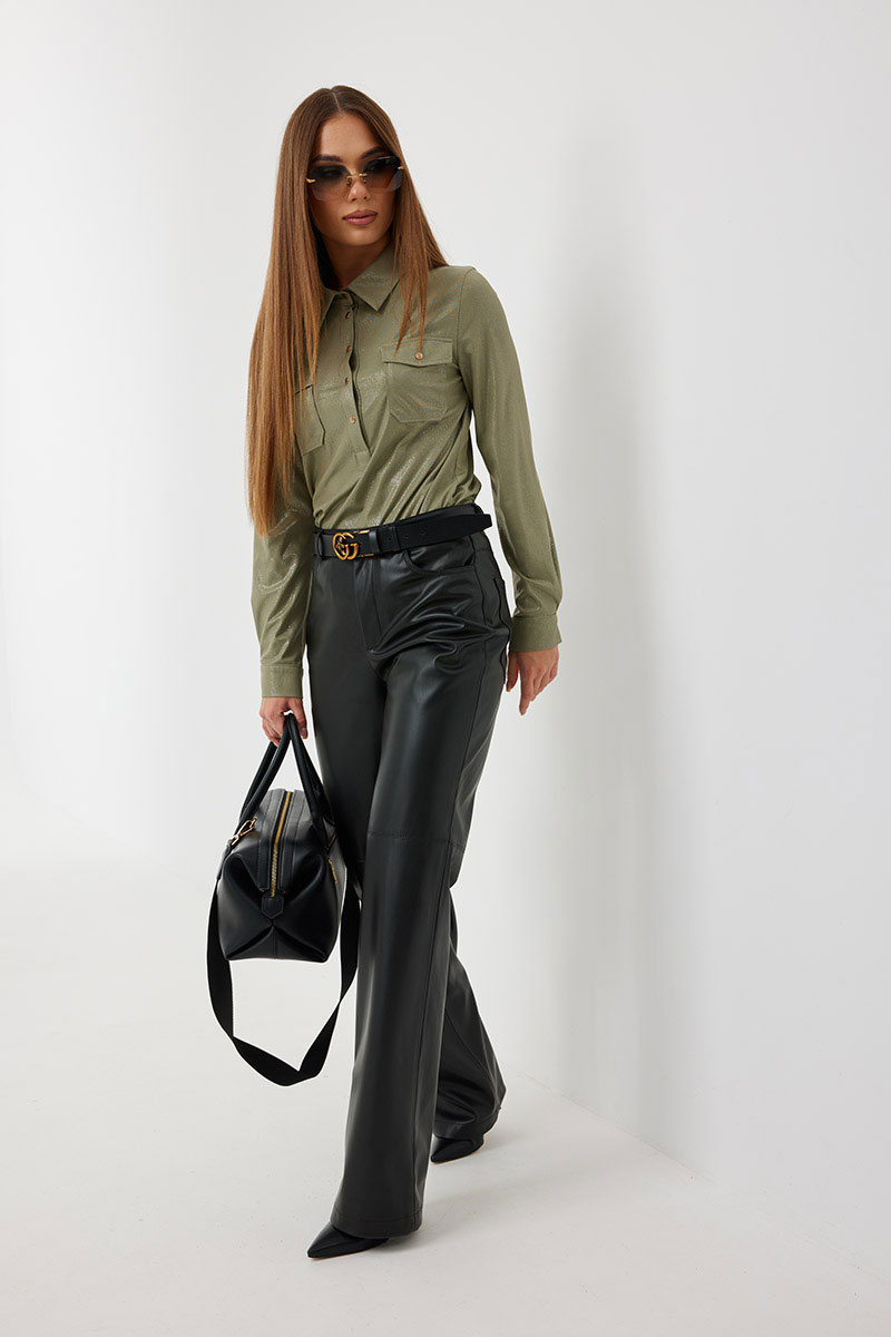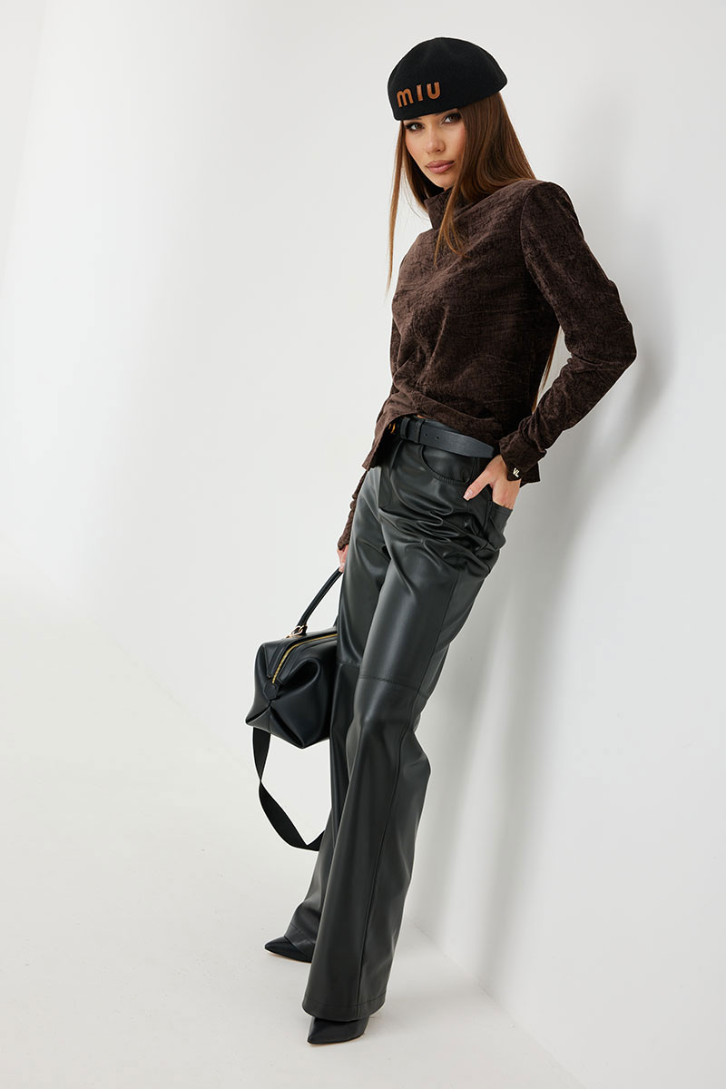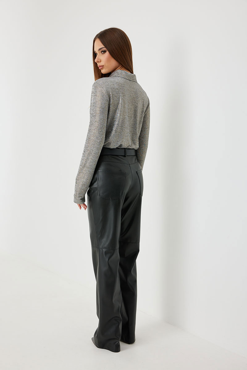 Брюки прямого силуэта из экокожи. Застёжка по переду на молнию и кнопку на поясе. Пояс