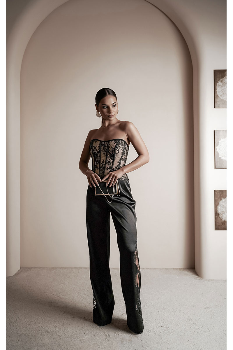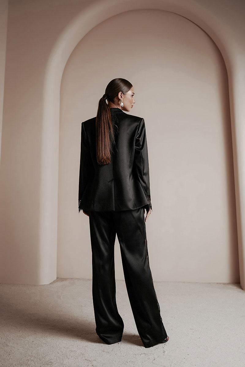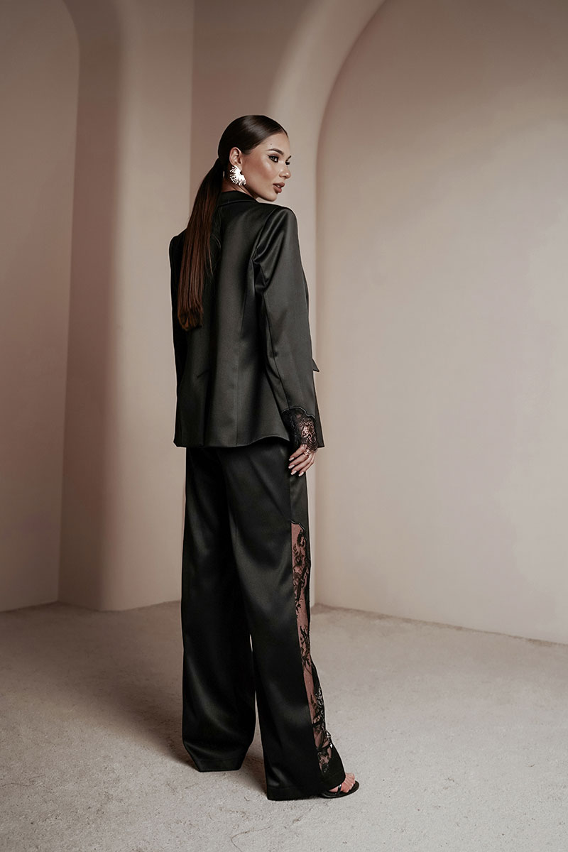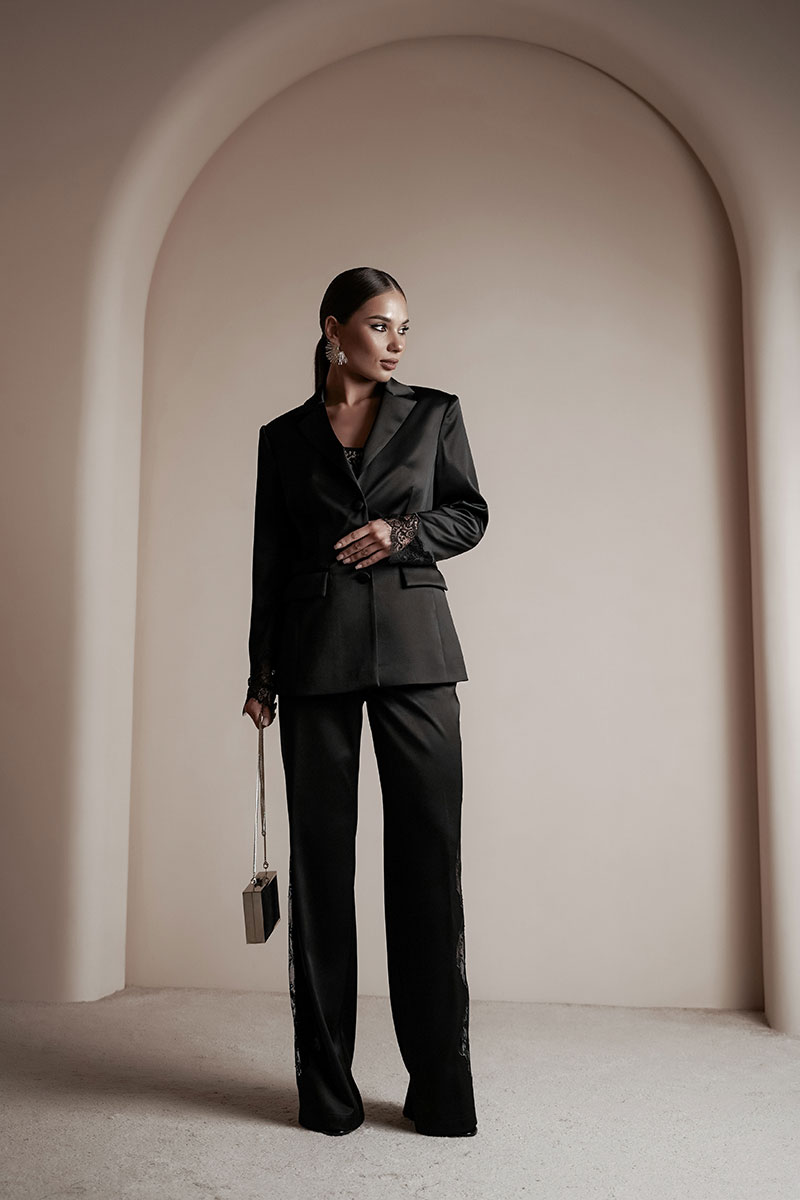 Брюки прямые из атласной ткани. По передним половинкам ближе к боковому шву – вышивка с кружевом. Средняя посадка, пояс притачной, застежка спереди на молнию и крючок.