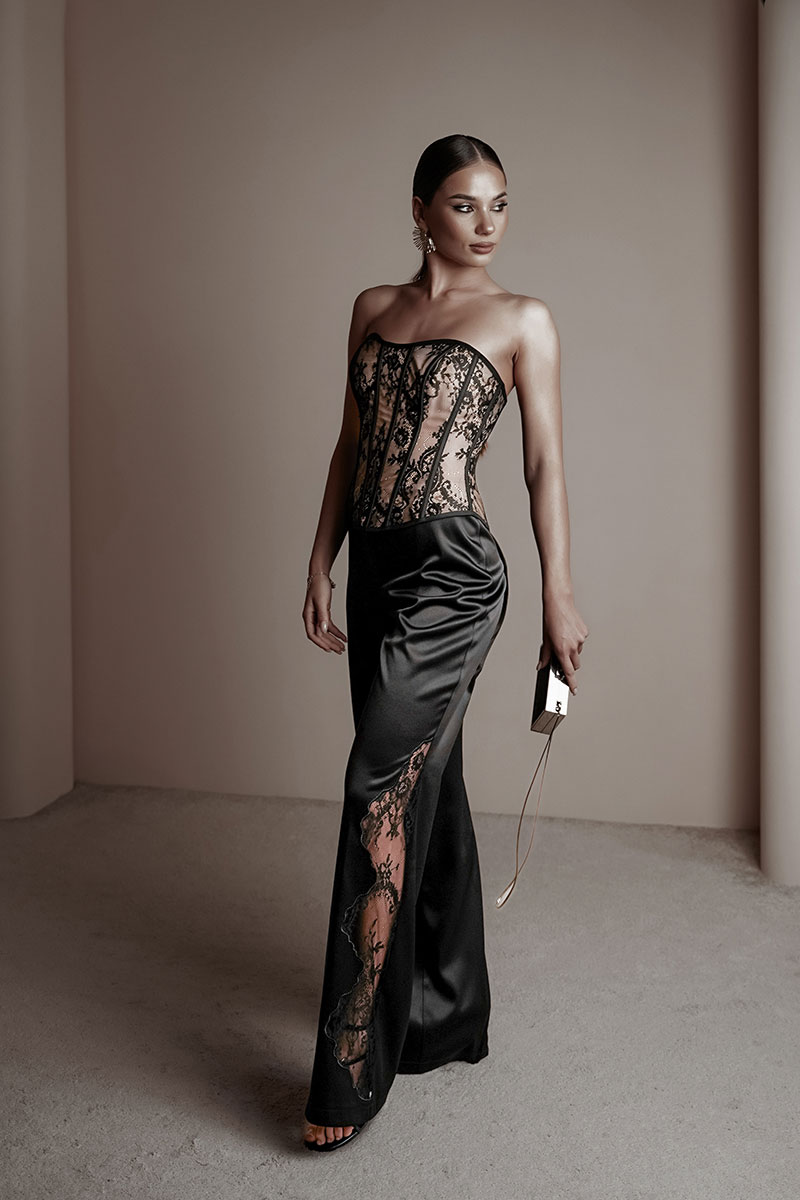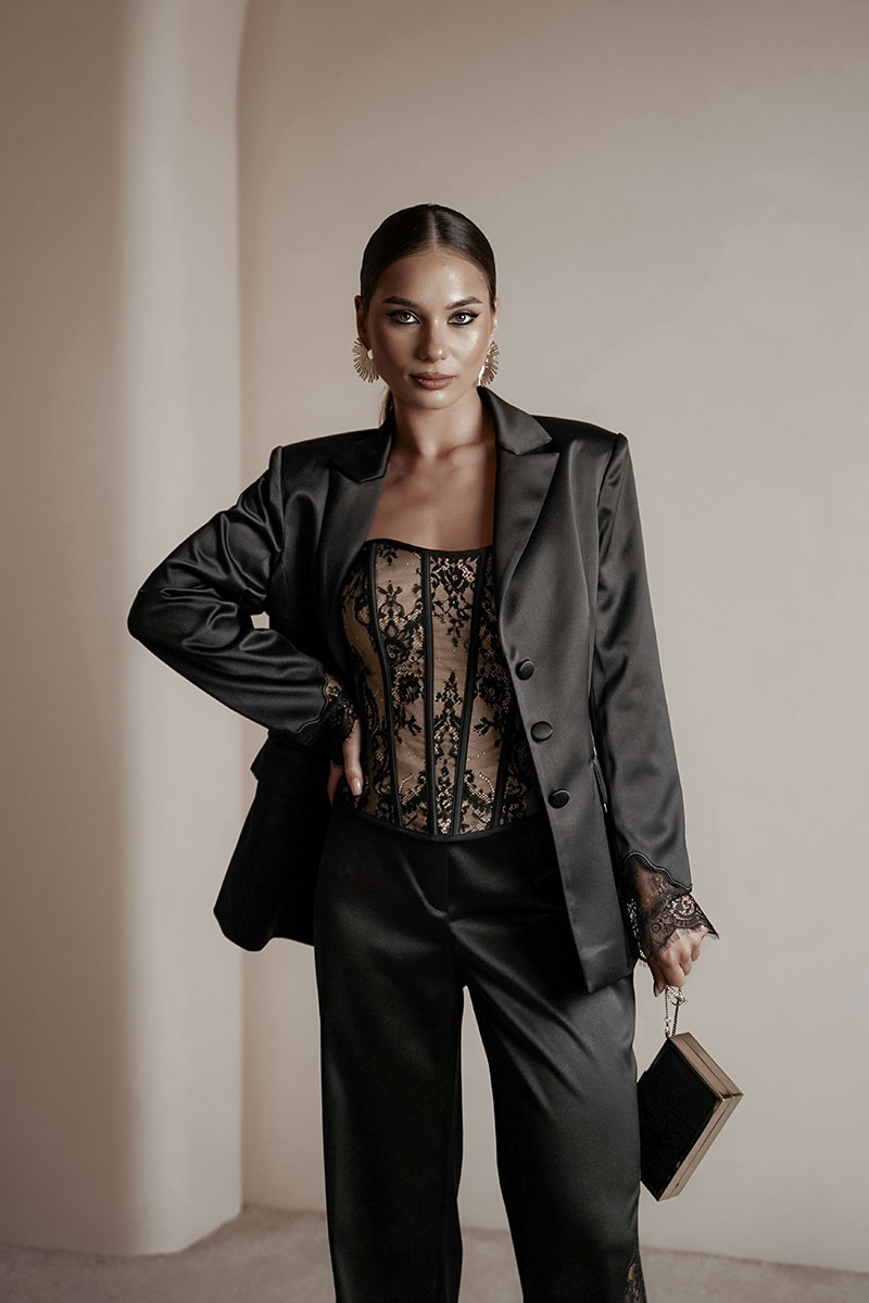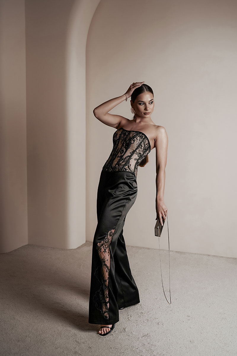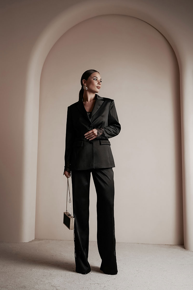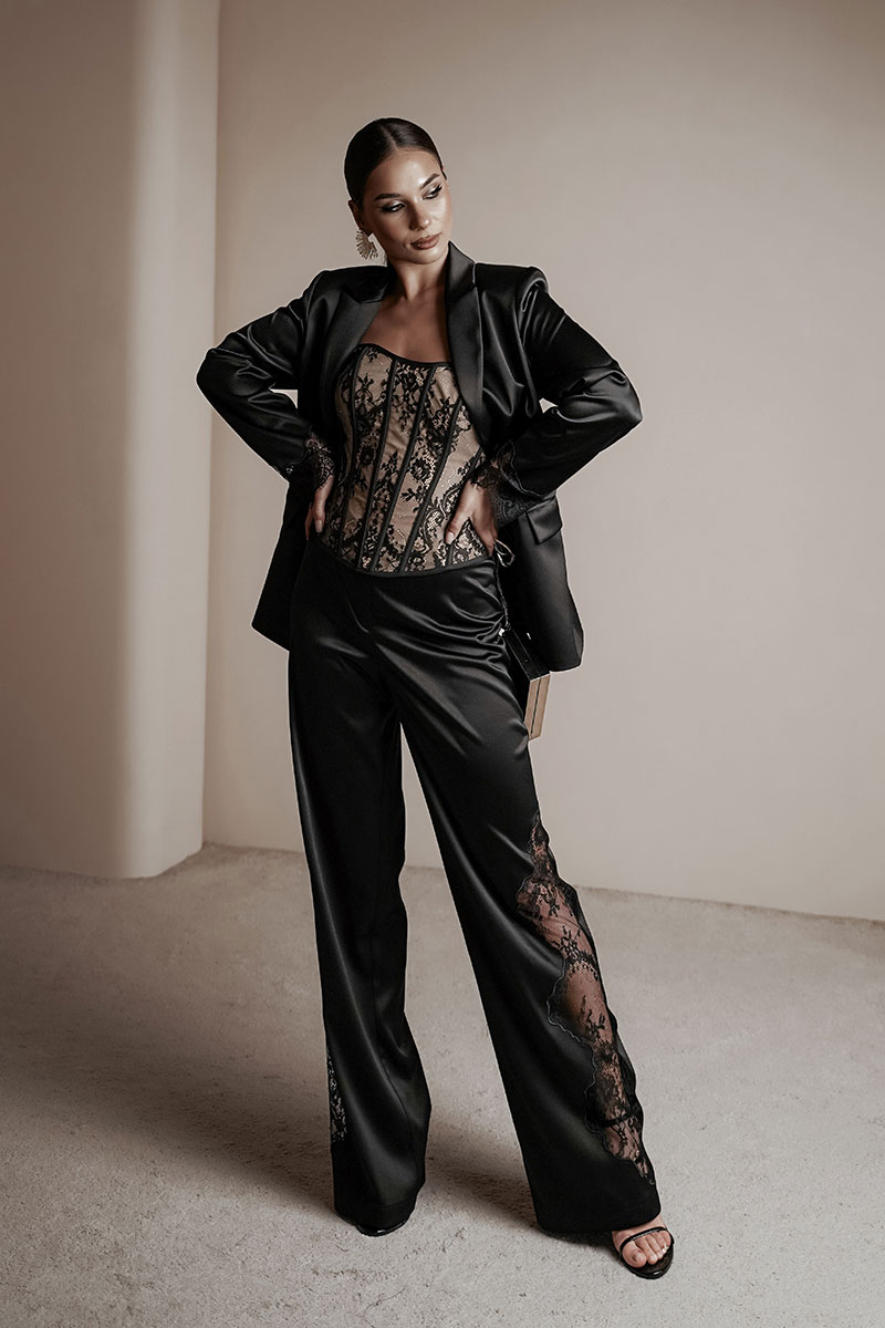 Брюки прямые из атласной ткани. По передним половинкам ближе к боковому шву – вышивка с кружевом. Средняя посадка, пояс притачной, застежка спереди на молнию и крючок.