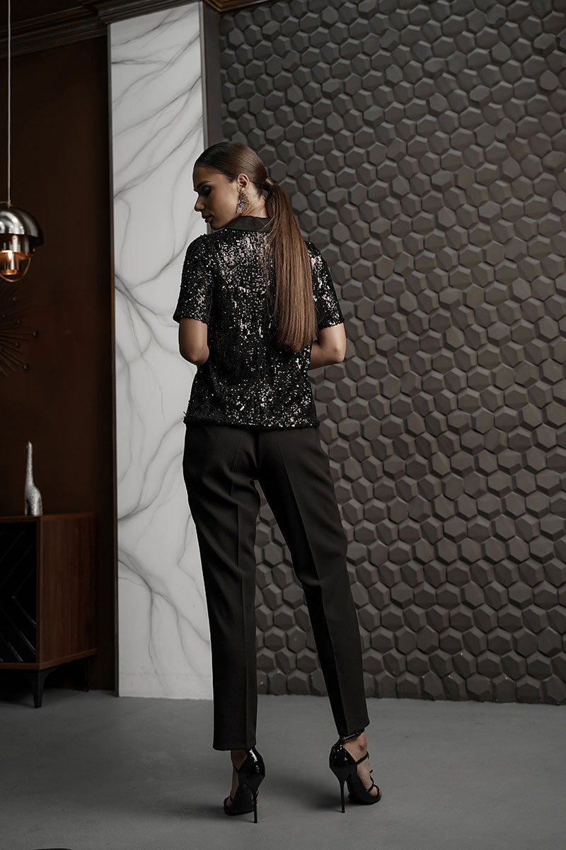 Брюки из костюмно-плательной ткани, зауженные к низу, укороченные. Средняя посадка, пояс притачной, застежка спереди на молнию и декоративную пуговицу. По переду боковые карманы. Брюки со стрелками.