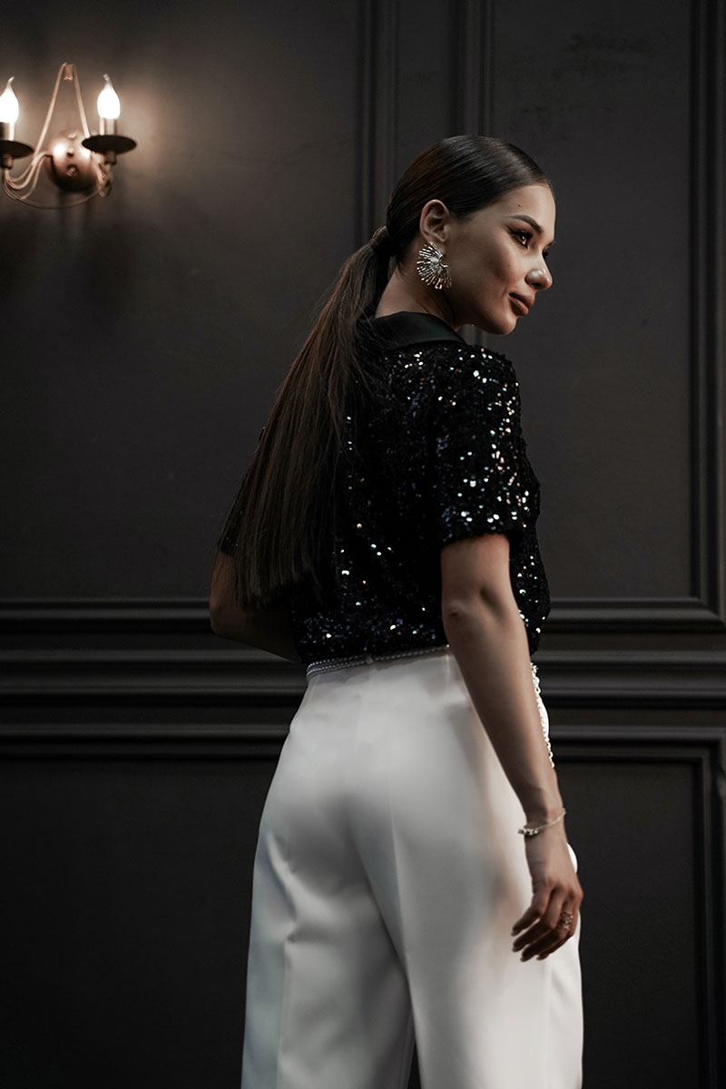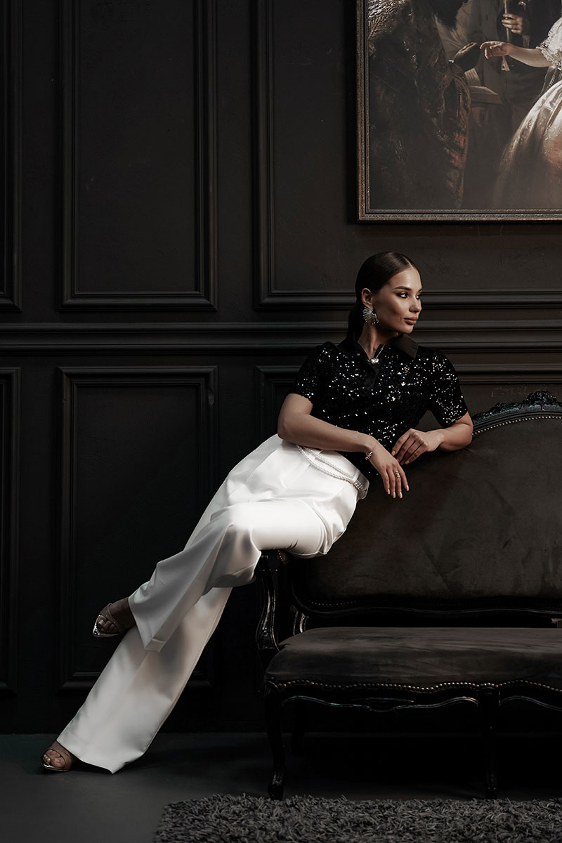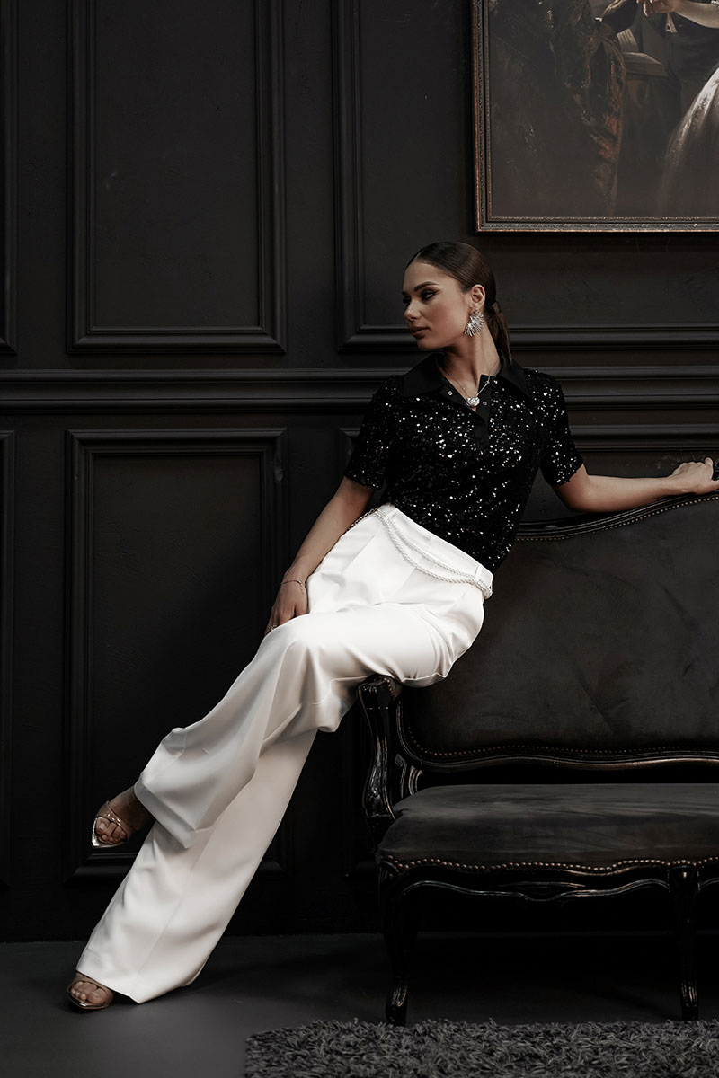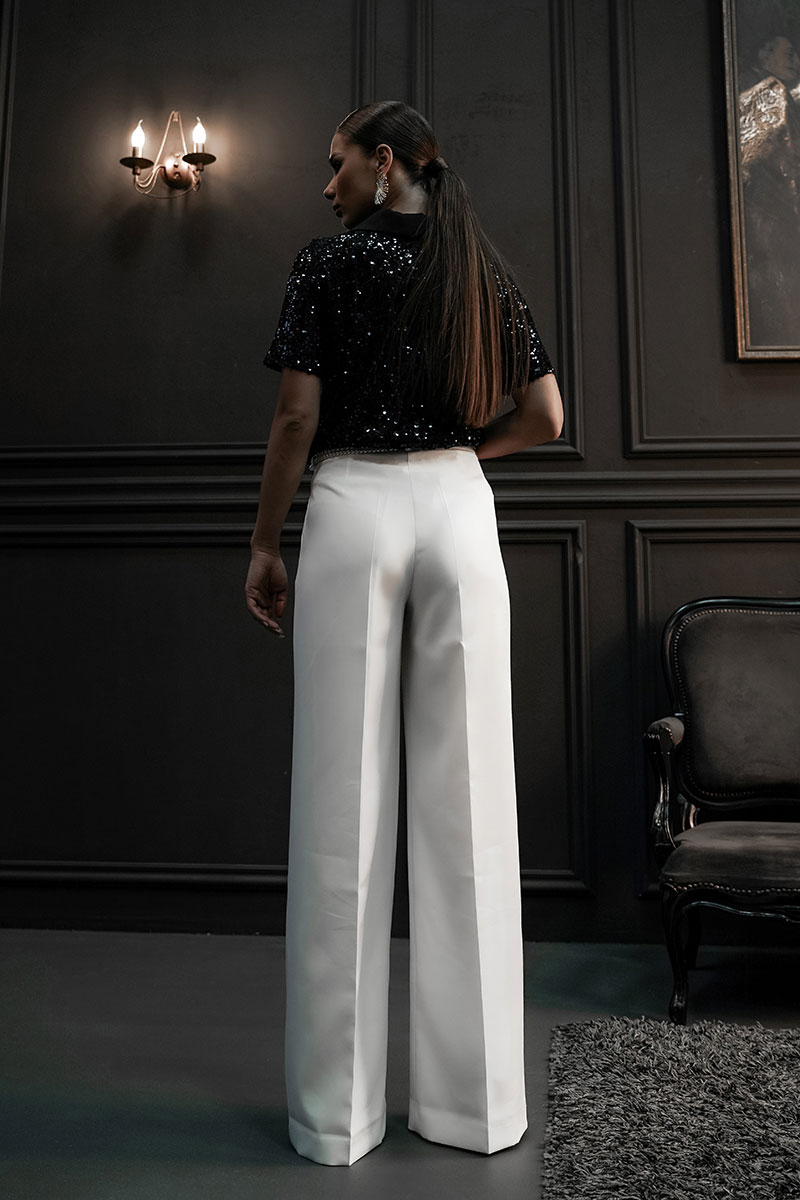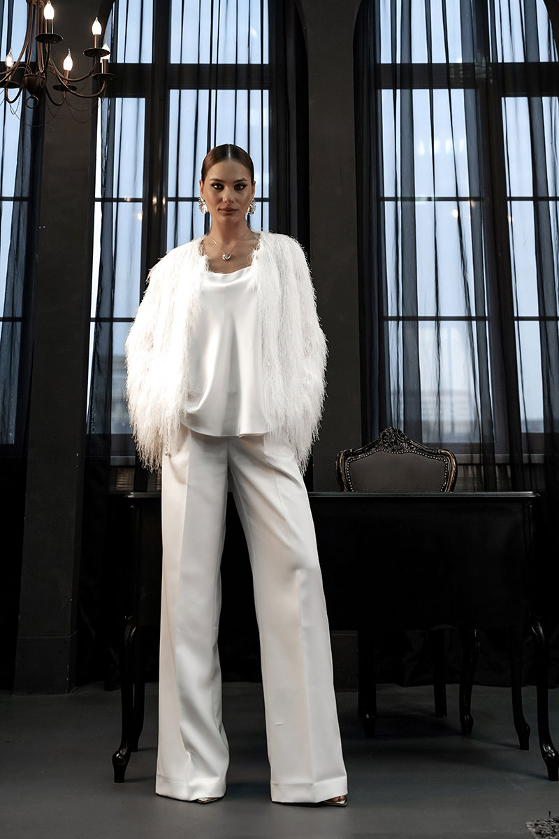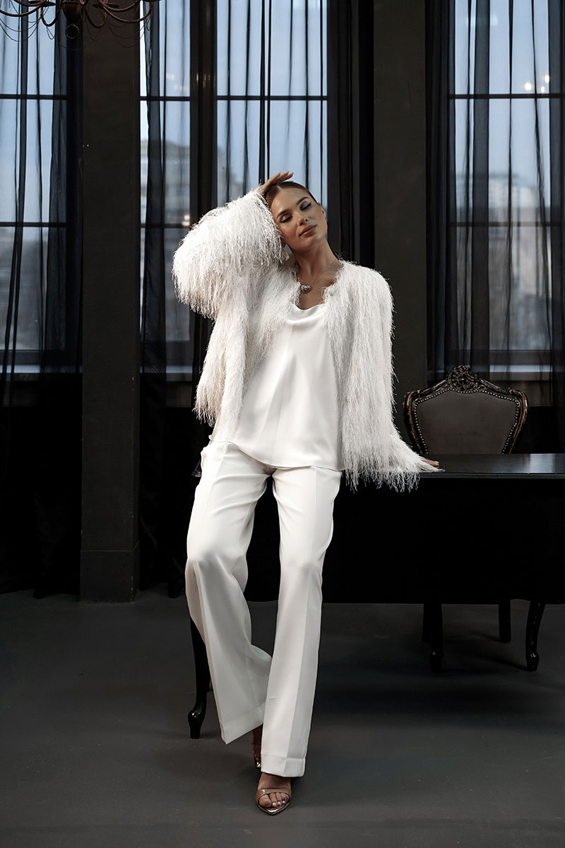 Брюки прямые из костюмной ткани. Верх на поясе со шлевками. Ширинка на молнии и удлиненный пояс со скрытой застежкой на пуговицу и крючок. На передних половинках брюк по две односторонние складки , диагональные боковые карманы.
