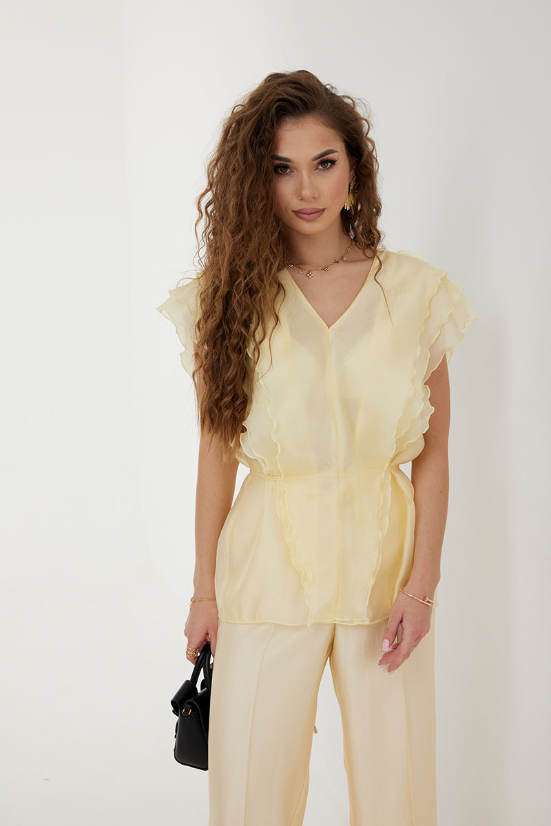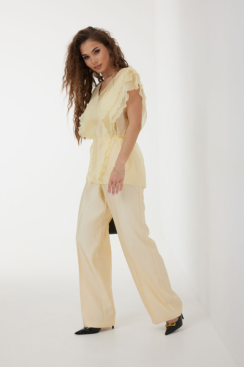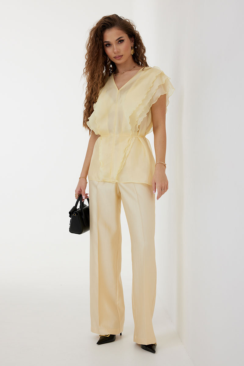Брюки из костюмно-плательной ткани, прямые со стрелками, полной длины. Средняя посадка, пояс притачной, застежка спереди на молнию и пуговицу. По переду боковые карманы.