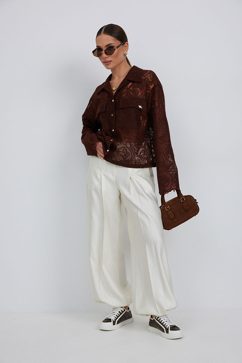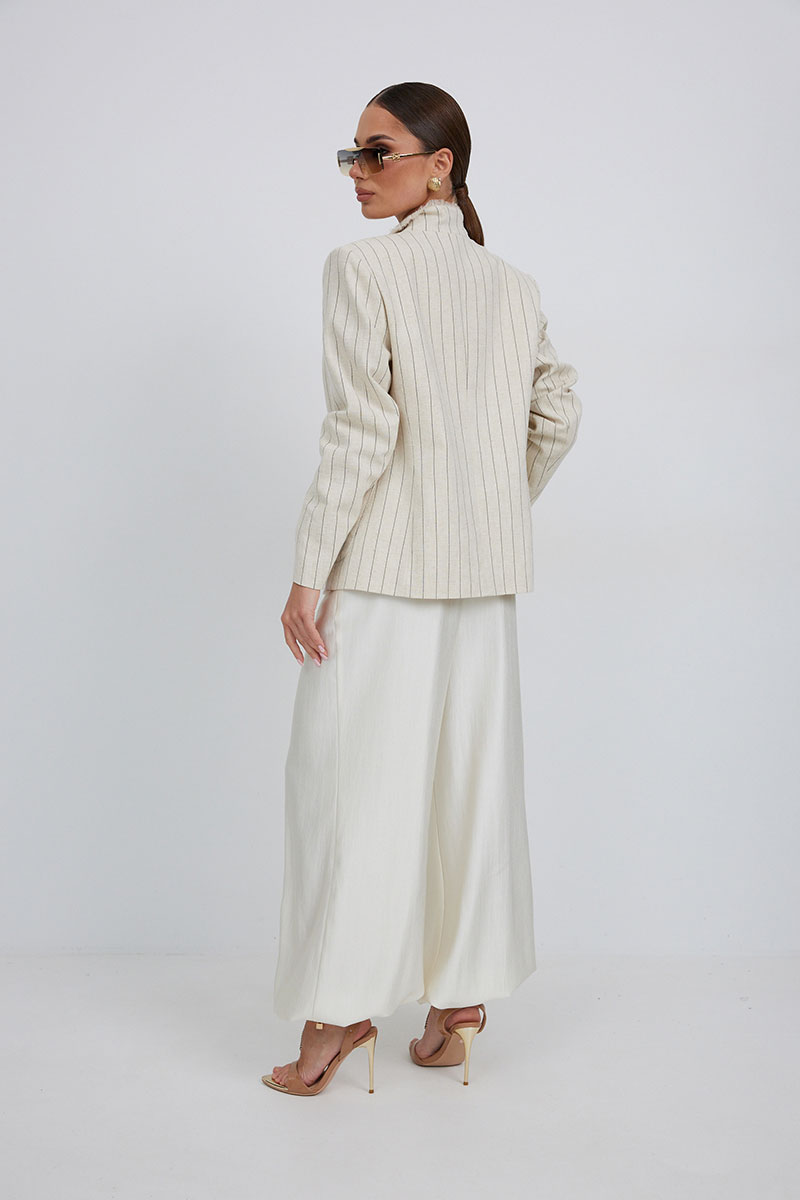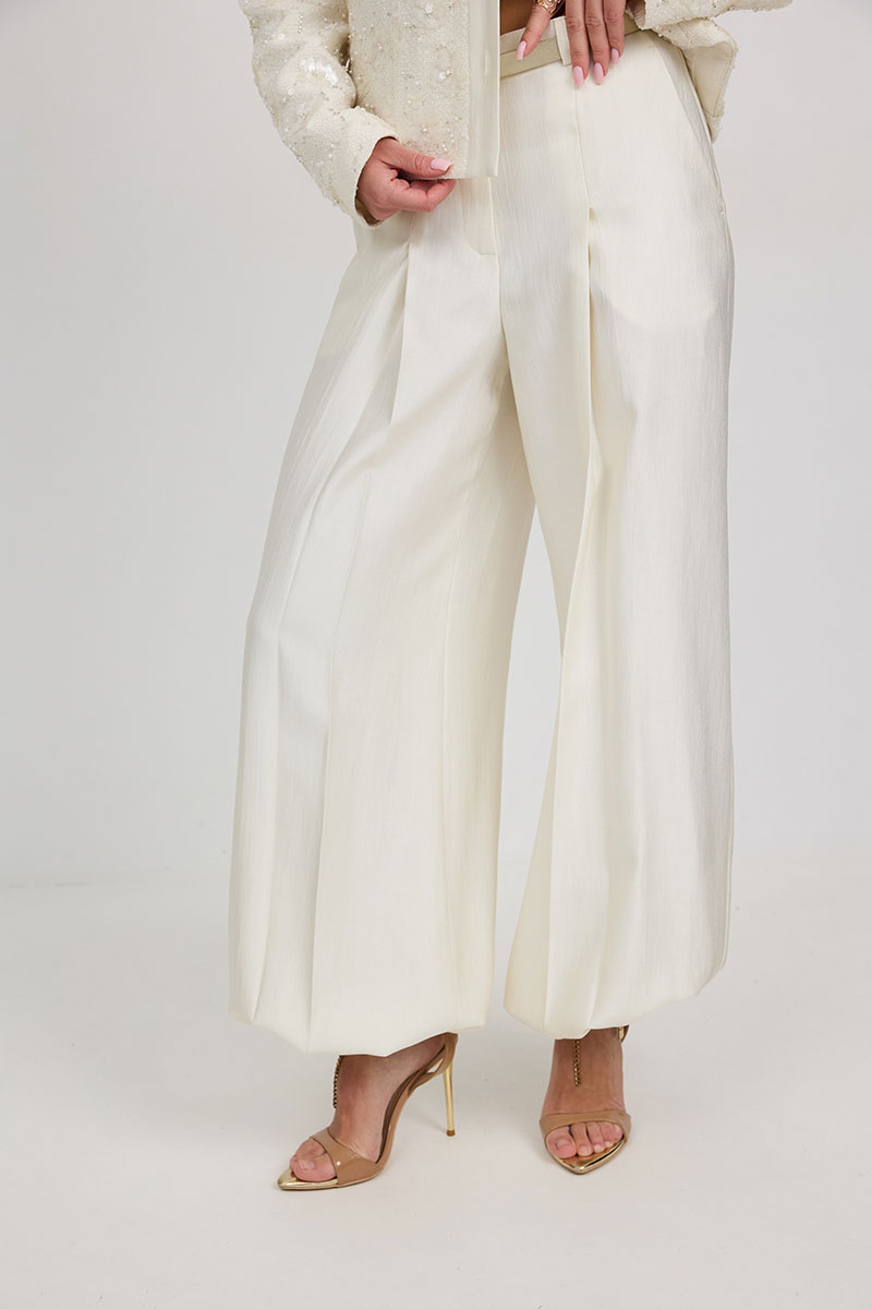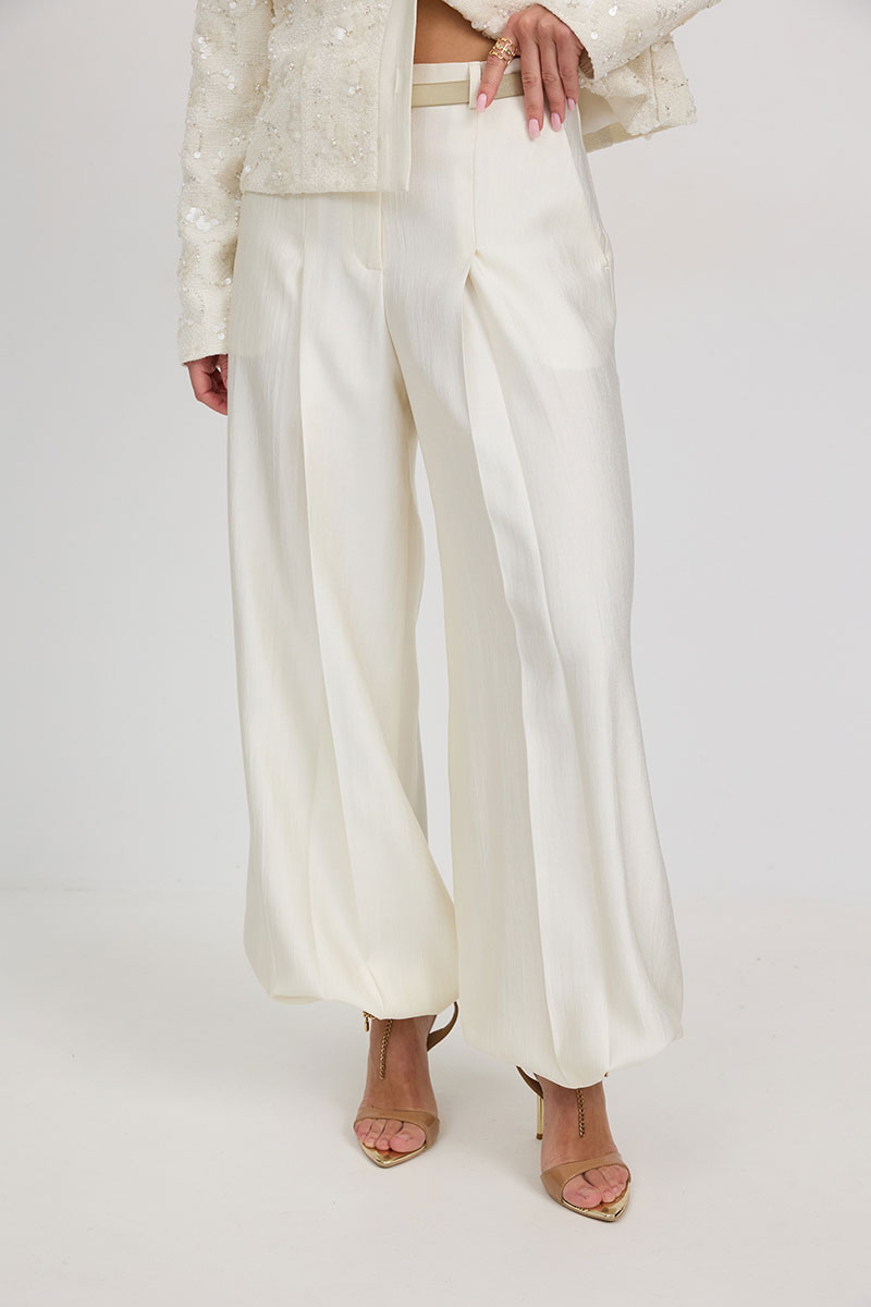 «брюки-алладины», собранные на резинку по низу, высокая посадка, пояс притачной со шлевками под ремень, застежка спереди на молнию и пуговицу, боковые карманы в швах, по переду глубокие заутюженные складки, дающие дополнительный объём внизу.