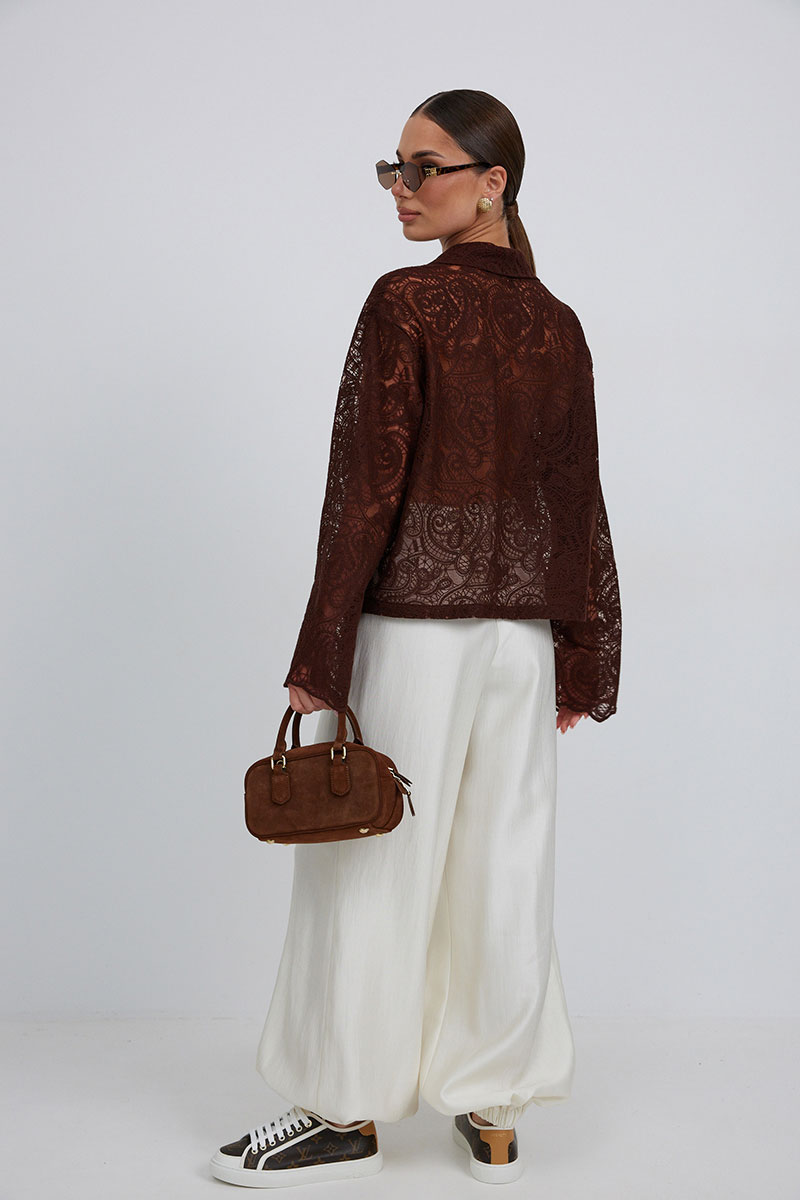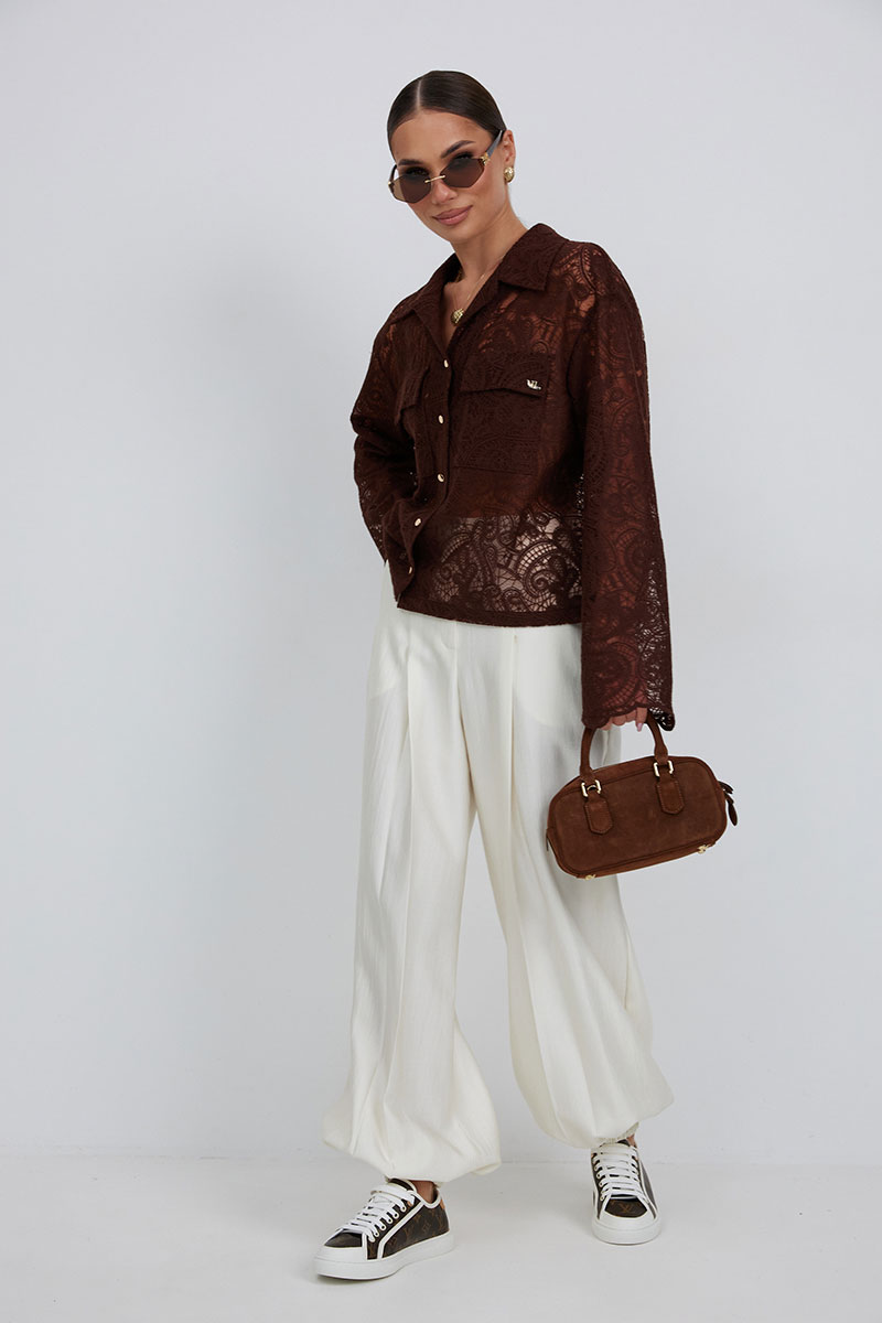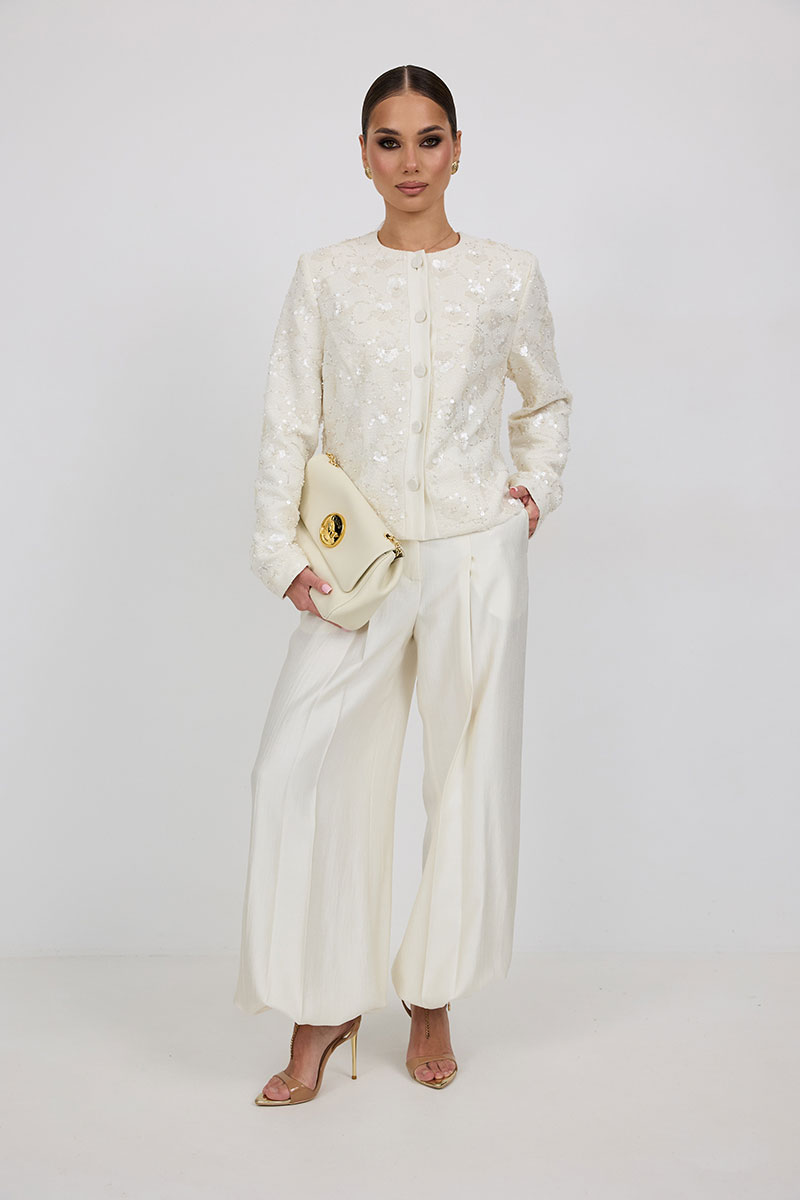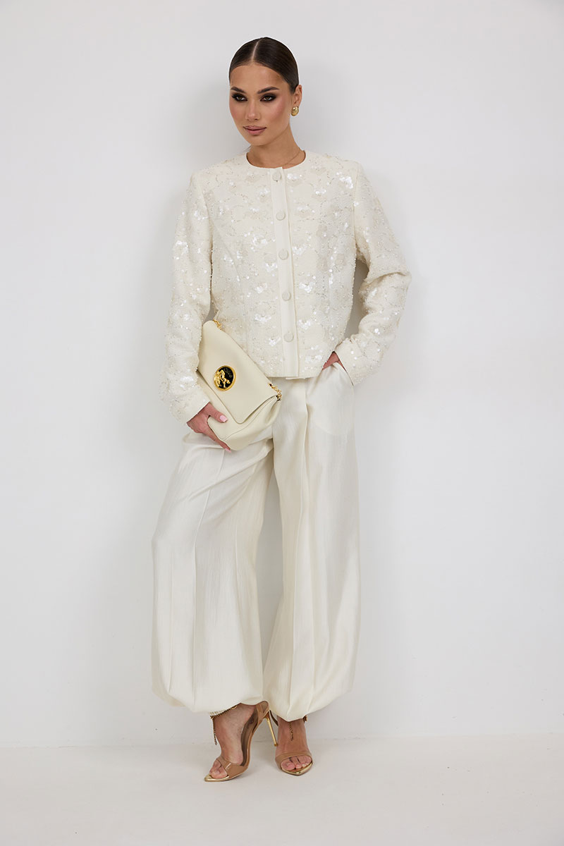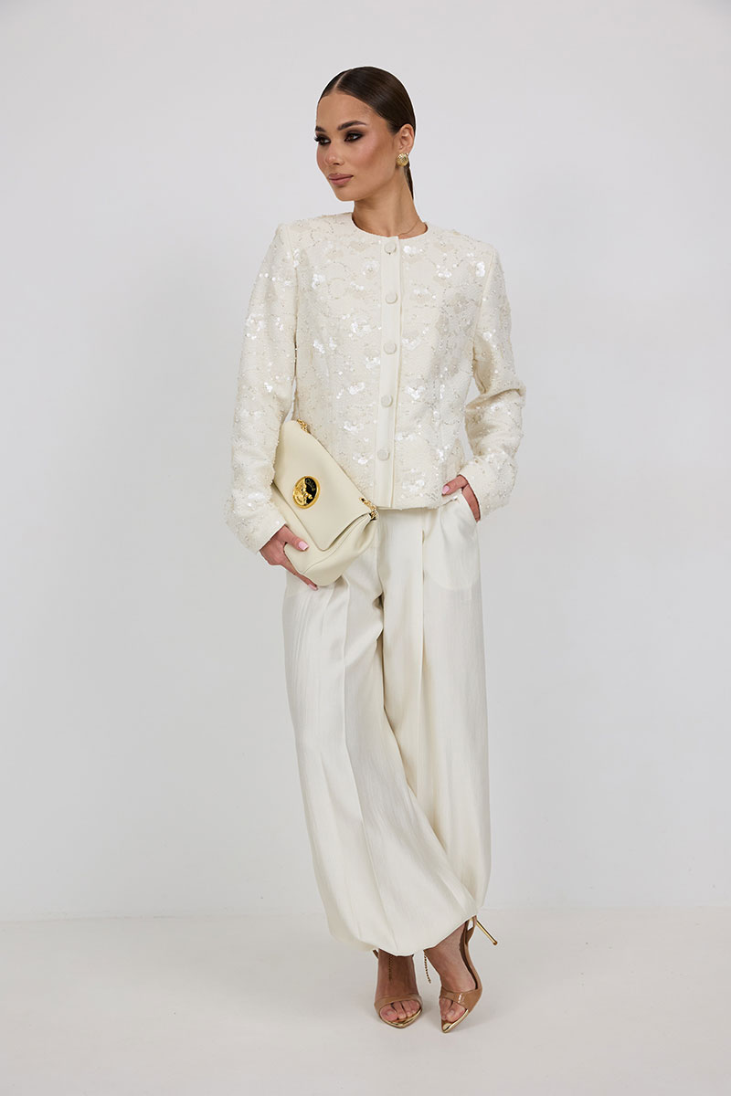 «брюки-алладины», собранные на резинку по низу, высокая посадка, пояс притачной со шлевками под ремень, застежка спереди на молнию и пуговицу, боковые карманы в швах, по переду глубокие заутюженные складки, дающие дополнительный объём внизу.