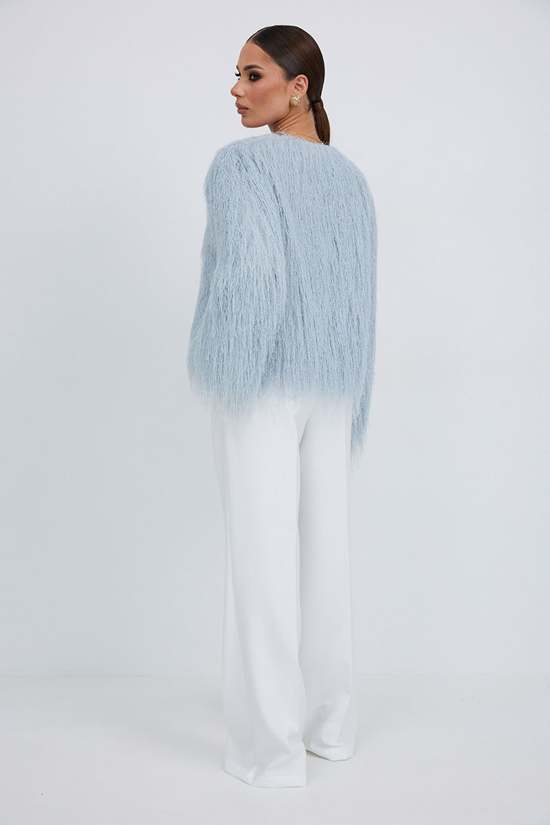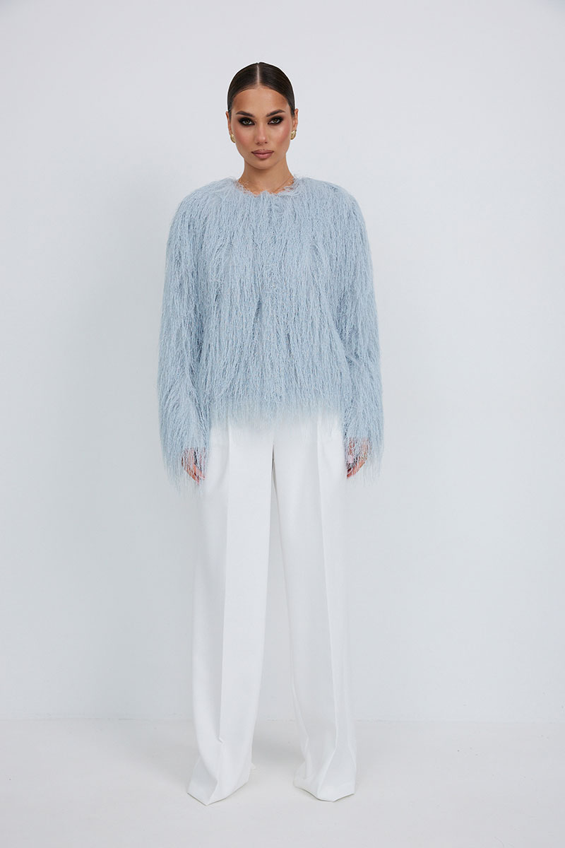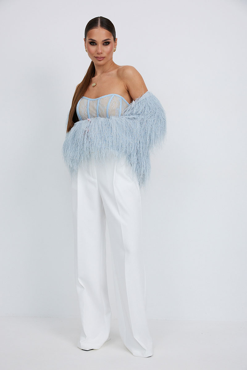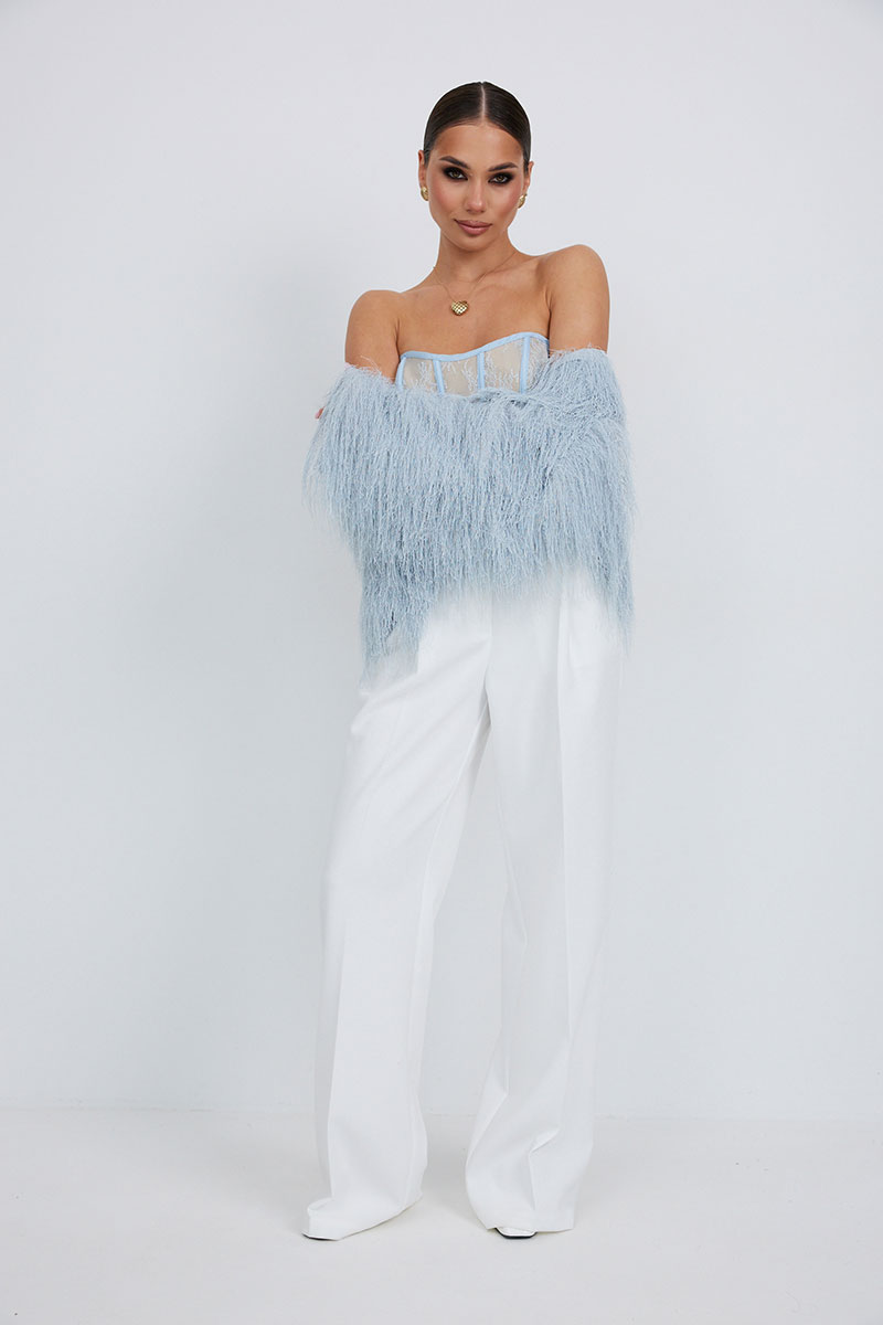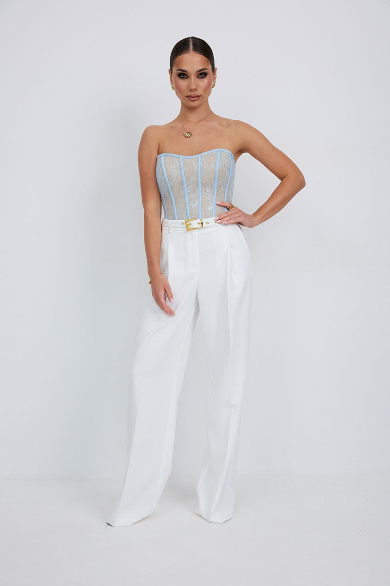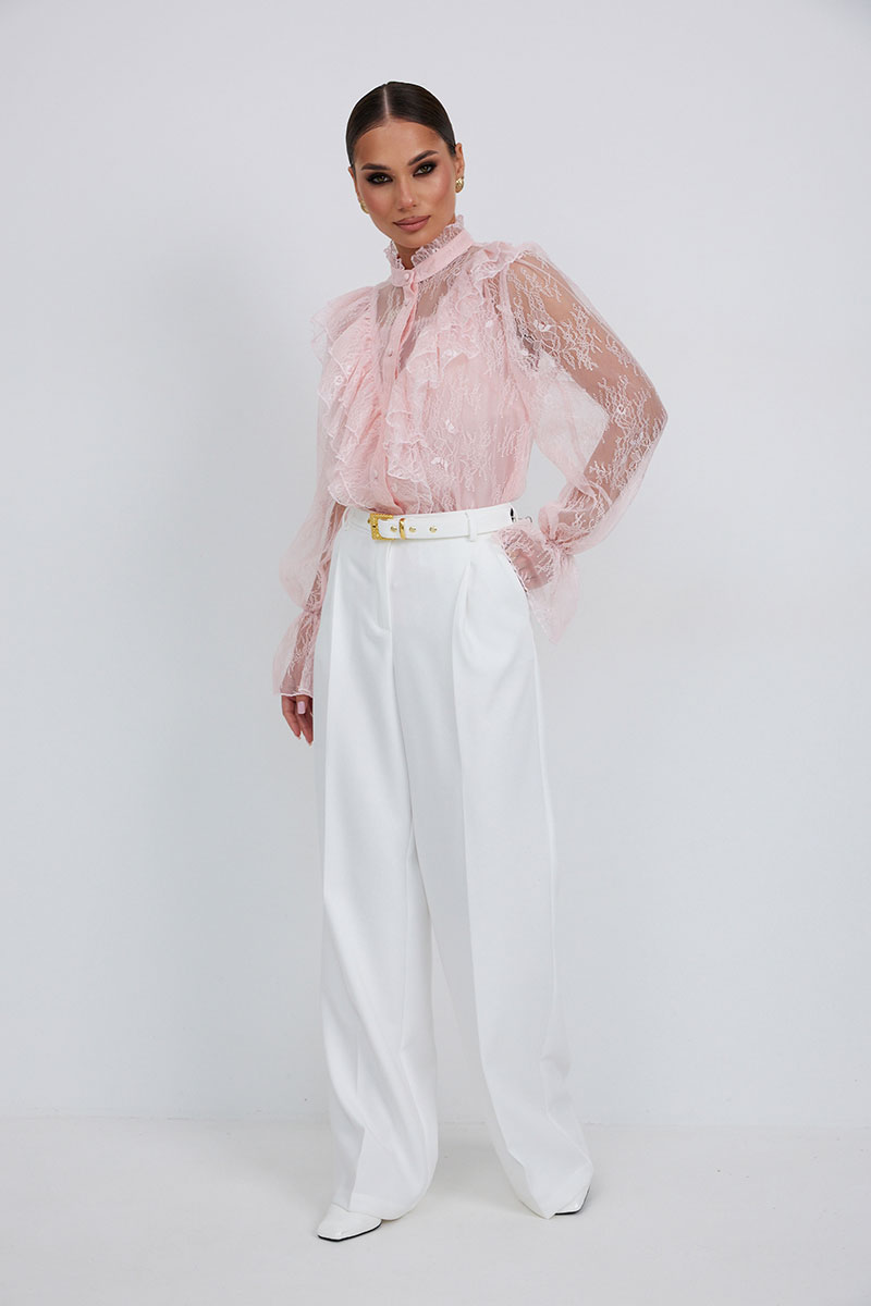 Брюки прямые из костюмной ткани. Верх на поясе со шлевками. Ширинка на молнии и удлиненный пояс со скрытой застежкой на пуговицу и крючок. Складки спереди, диагональные боковые карманы и задние прорезные листочки.