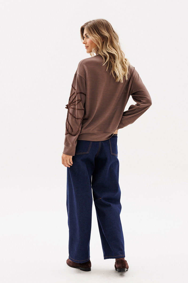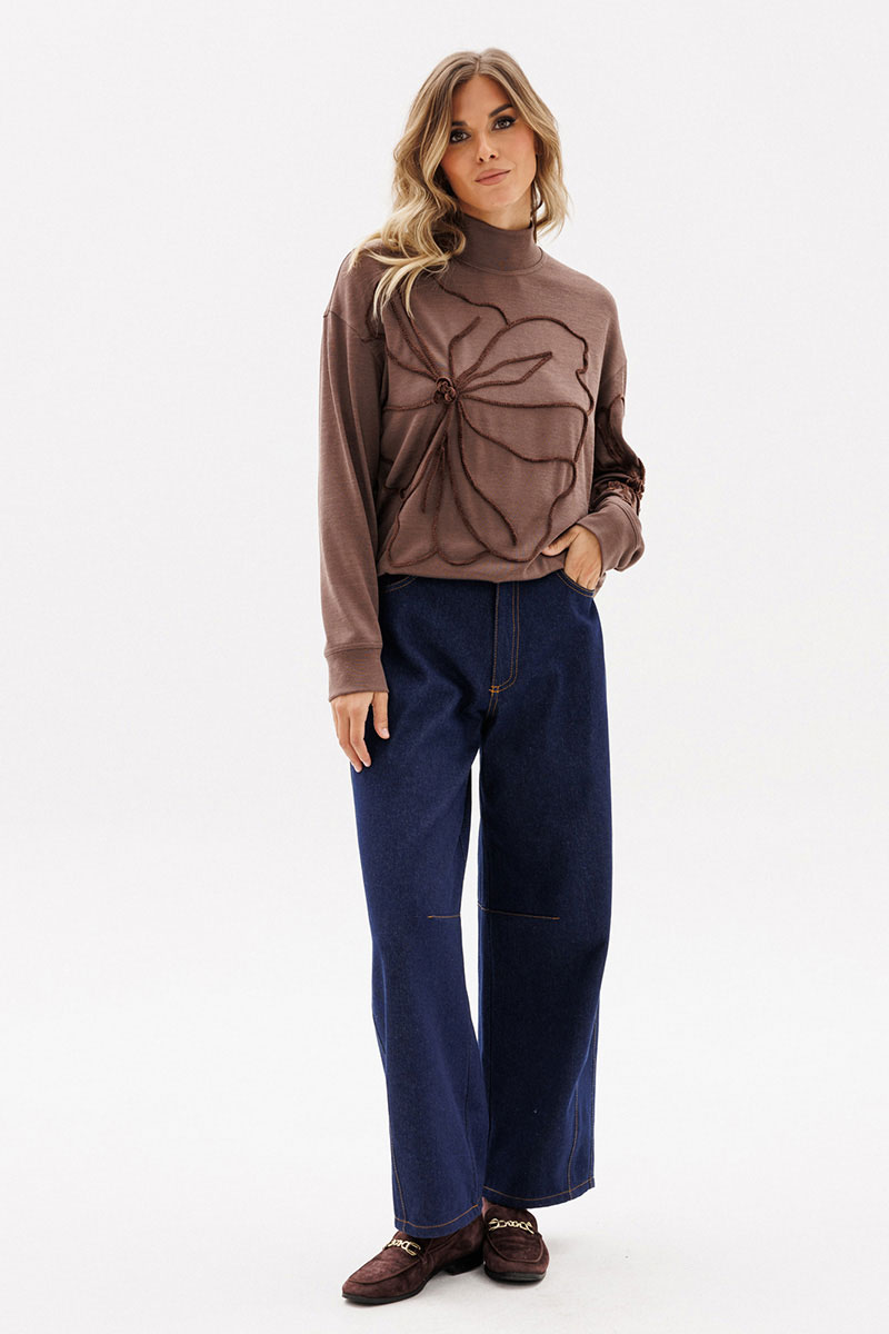 Джинсы-багги выполнены из плотного джинса. Брюки на притачном поясе, длиной до линии щиколотки, расширенные от бедер и слегка зауженные к низу. Спереди боковые карманы с фигурным входом. Застежка на пуговицу и молнию с гульфиком. На задних частях кокетки и накладные карманы. На передней и задней части коленные вытачки.