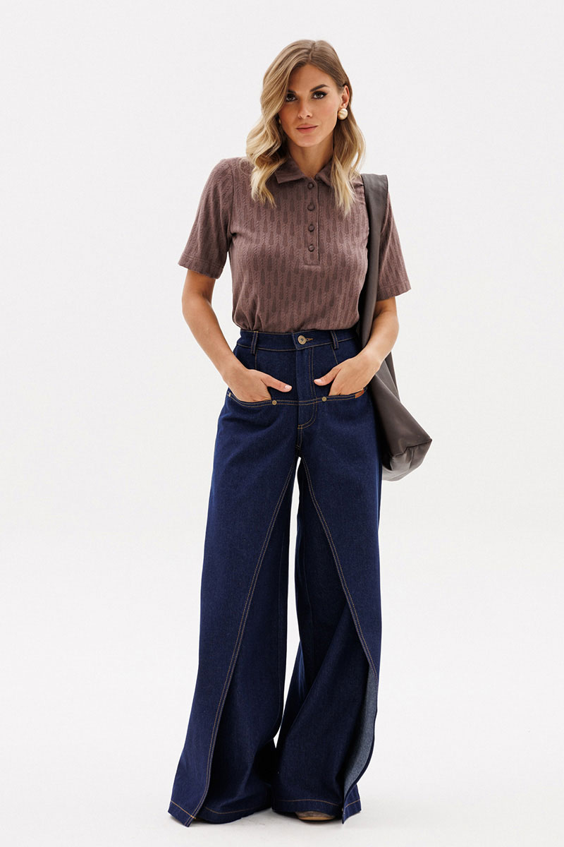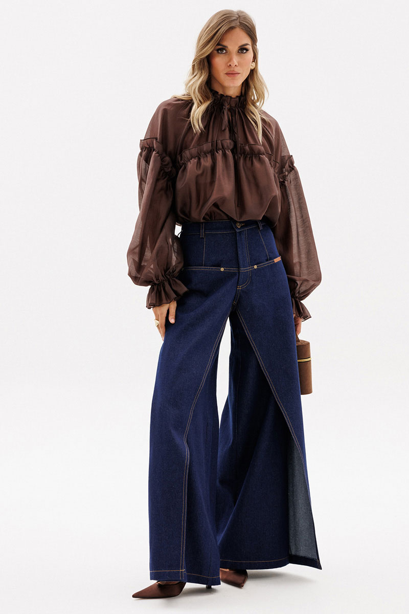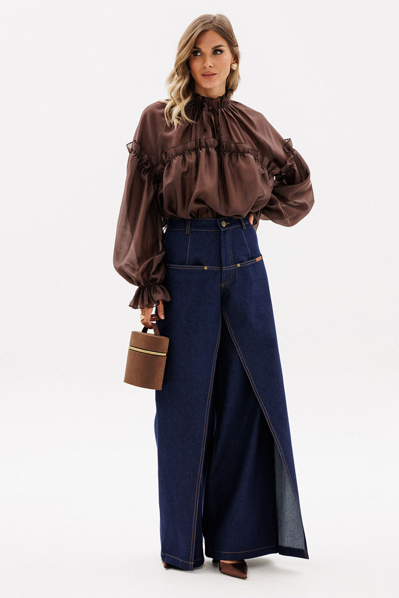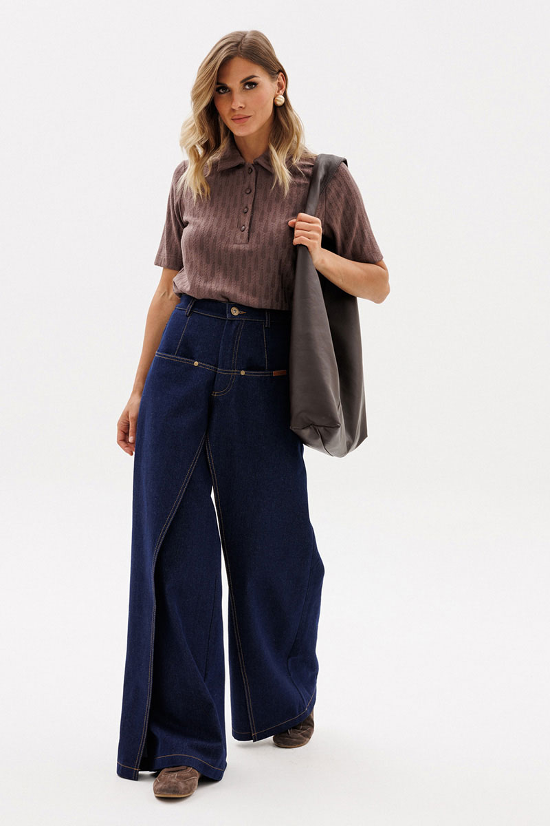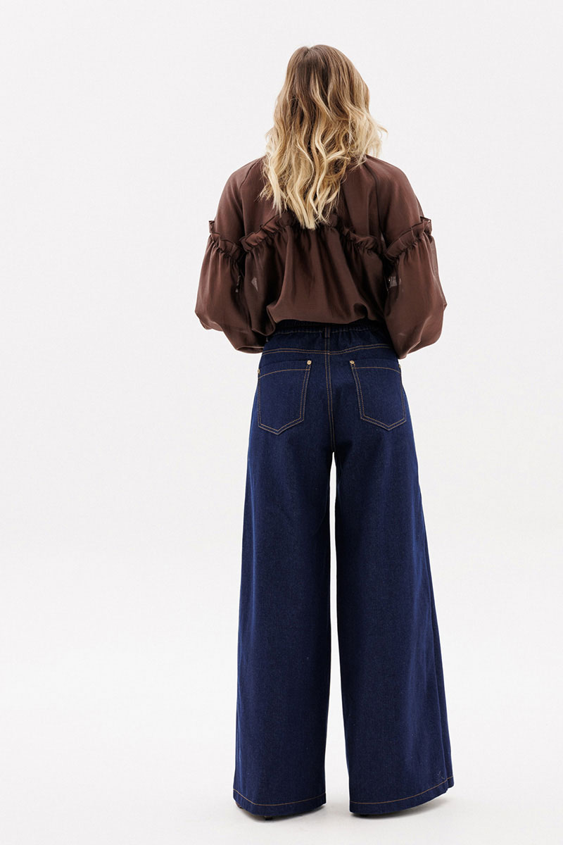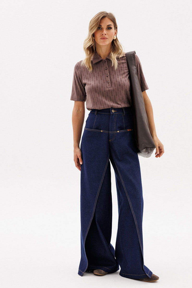 Брюки выполнены из плотного джинса. Брюки на притачном поясе, длиной до пола, расширенные к низу. Спереди верхние отлетные части, боковые карманы с фигурным входом. Застежка на пуговицу и молнию с гульфиком. На задних частях кокетки и накладные карманы. По переду брюки декорированы брендированной нашивкой из натуральной кожи.