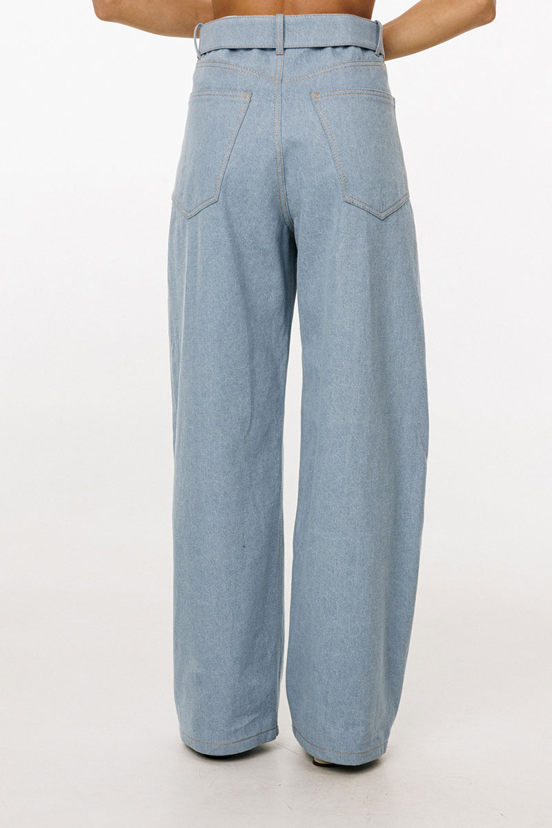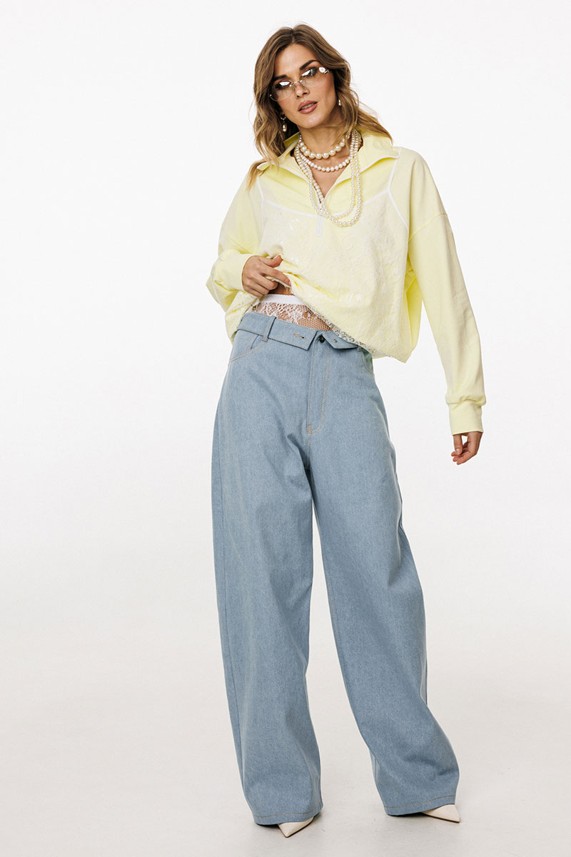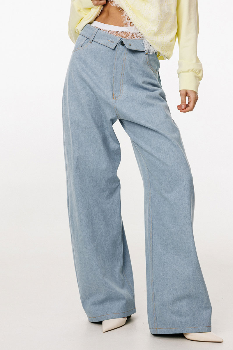 Брюки выполнены из плотного джинса. Брюки прямого силуэта, на притачном поясе, длиной в пол. На передних частях обработаны фигурные боковые карманы и застёжка на металлическую молнию и пуговицу. На задних частях обработаны кокетки и накладные карманы. Пояс выполнен с декоративным отворотом на лицо. По поясу обработаны 5 шлевок и декоративная петля.